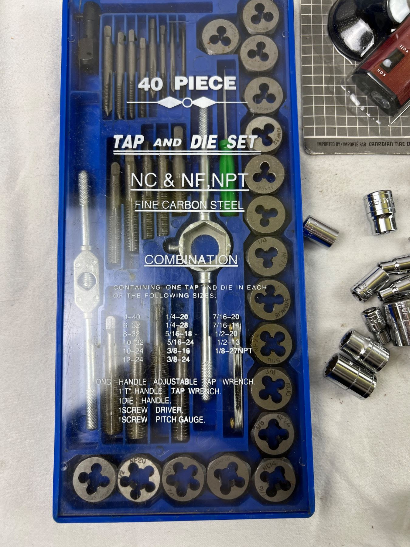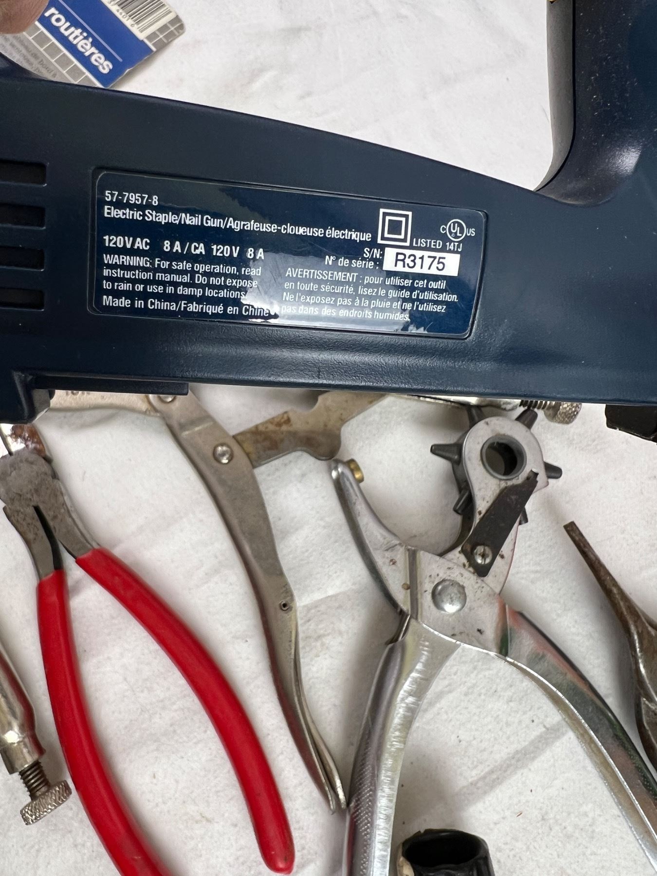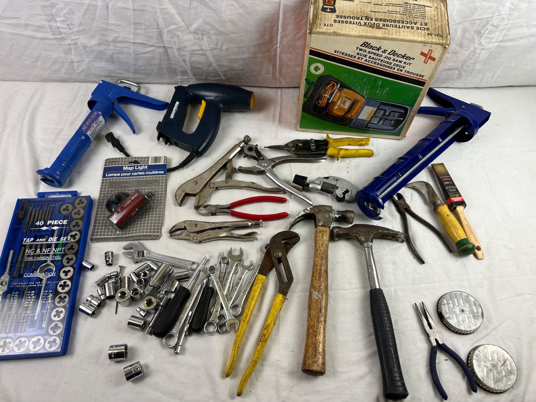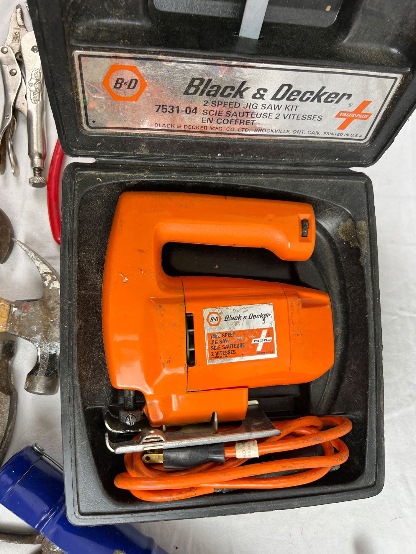 Includes, Black & Decker 2 Speed Jig Saw, Mastercraft Electric Stapler, both turn on, Tap & Die Set, Vice Grips, and more