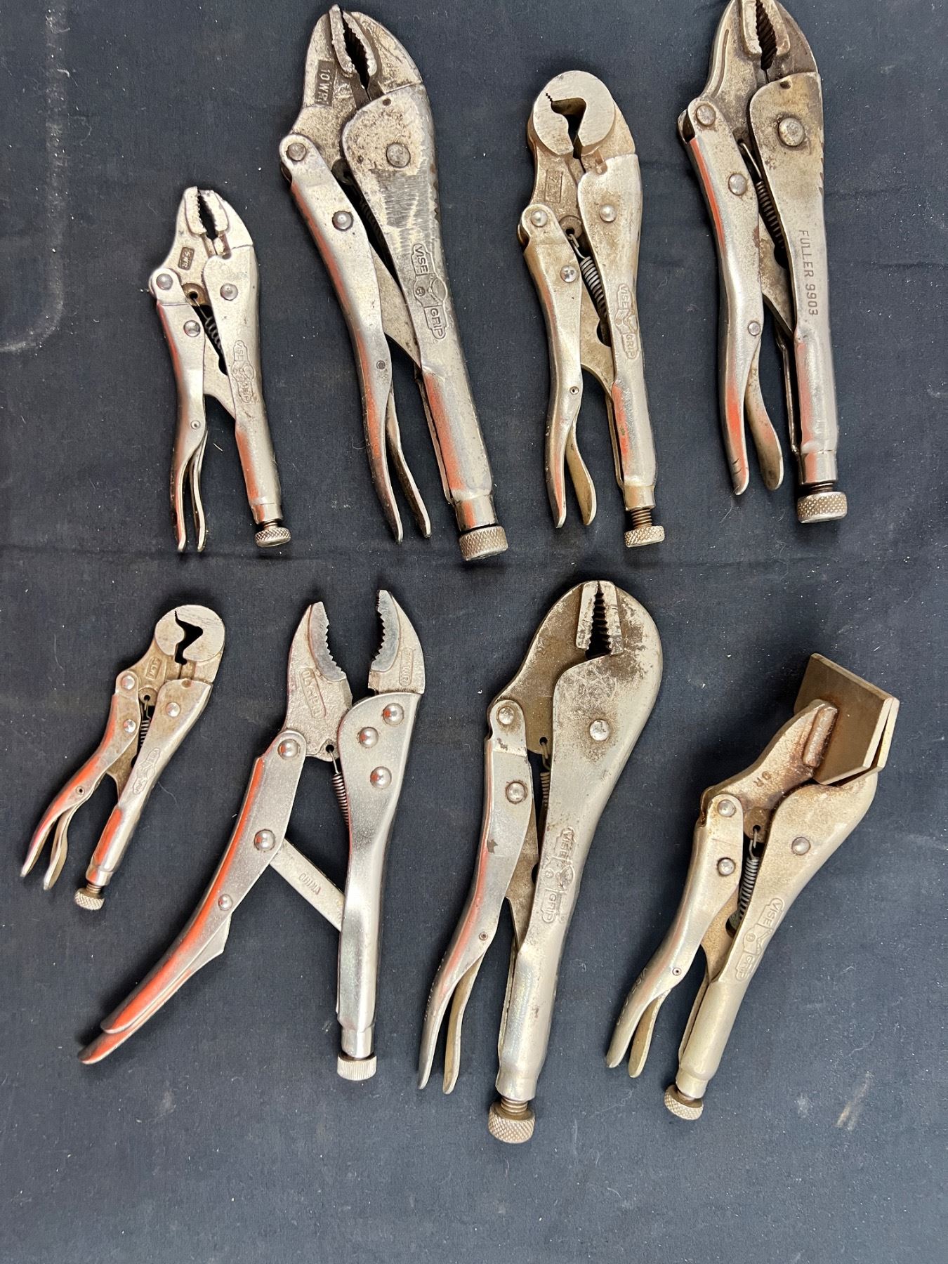 Assorted traditional vice grips and welding style of vice grips. Varying states of wear.
