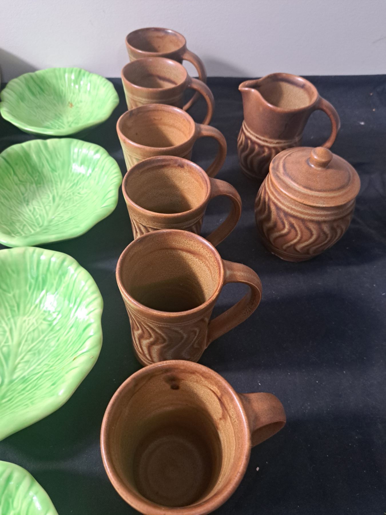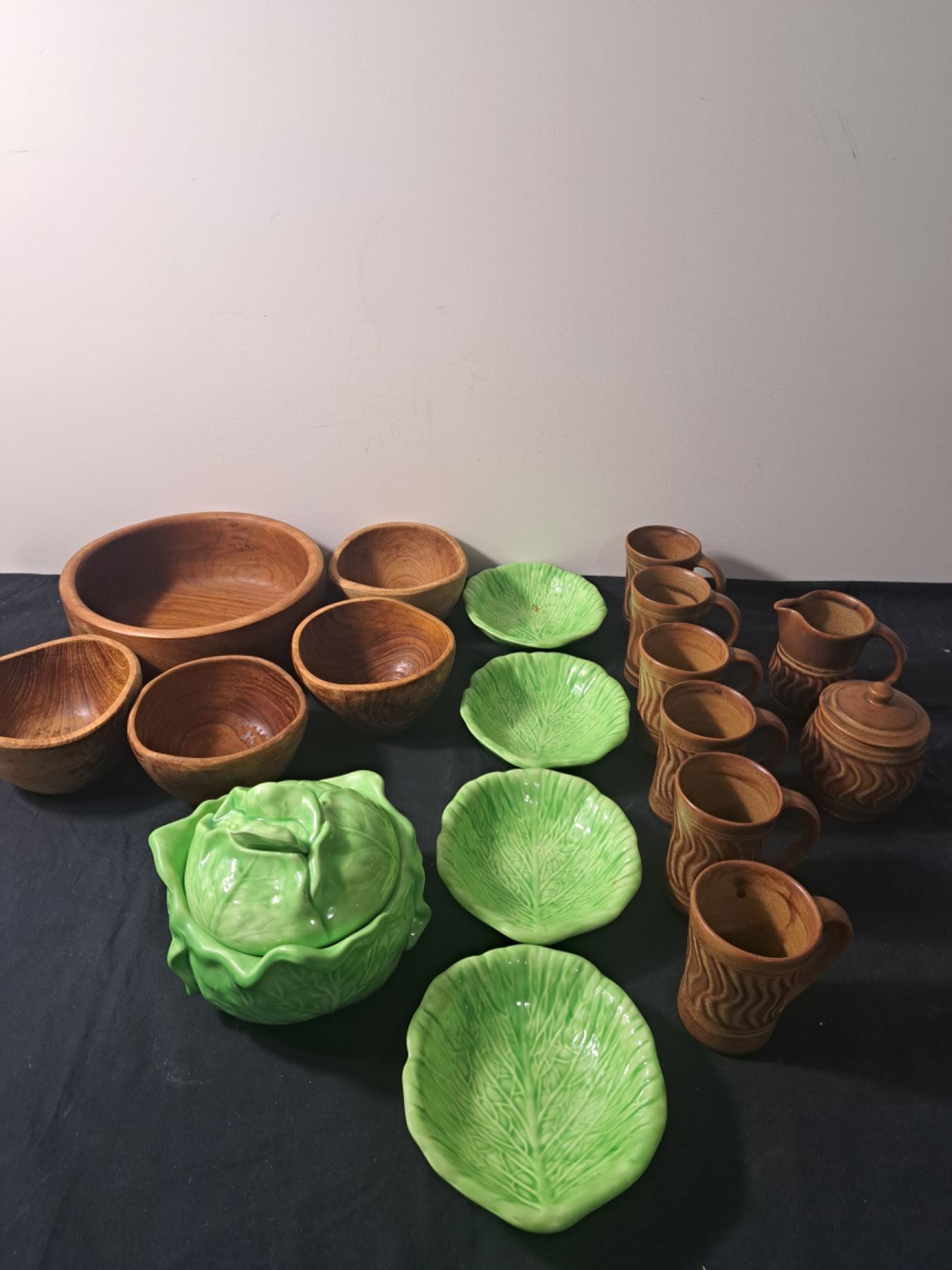 pottery cups/ lettuce bowls, and wooden bowls