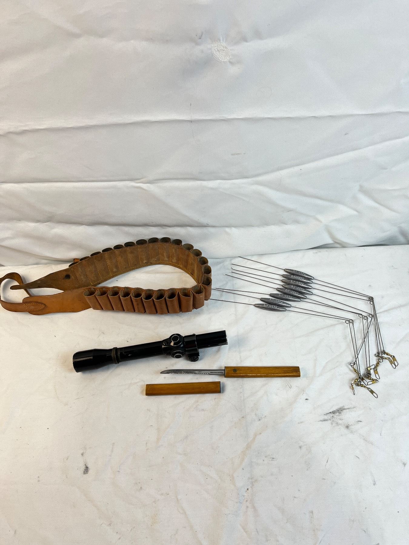 Including Floating Fish Knife, Bullet Belt, & Fishing Weights & Bushnell Scope Chief 2.5x (Lense is Dented)