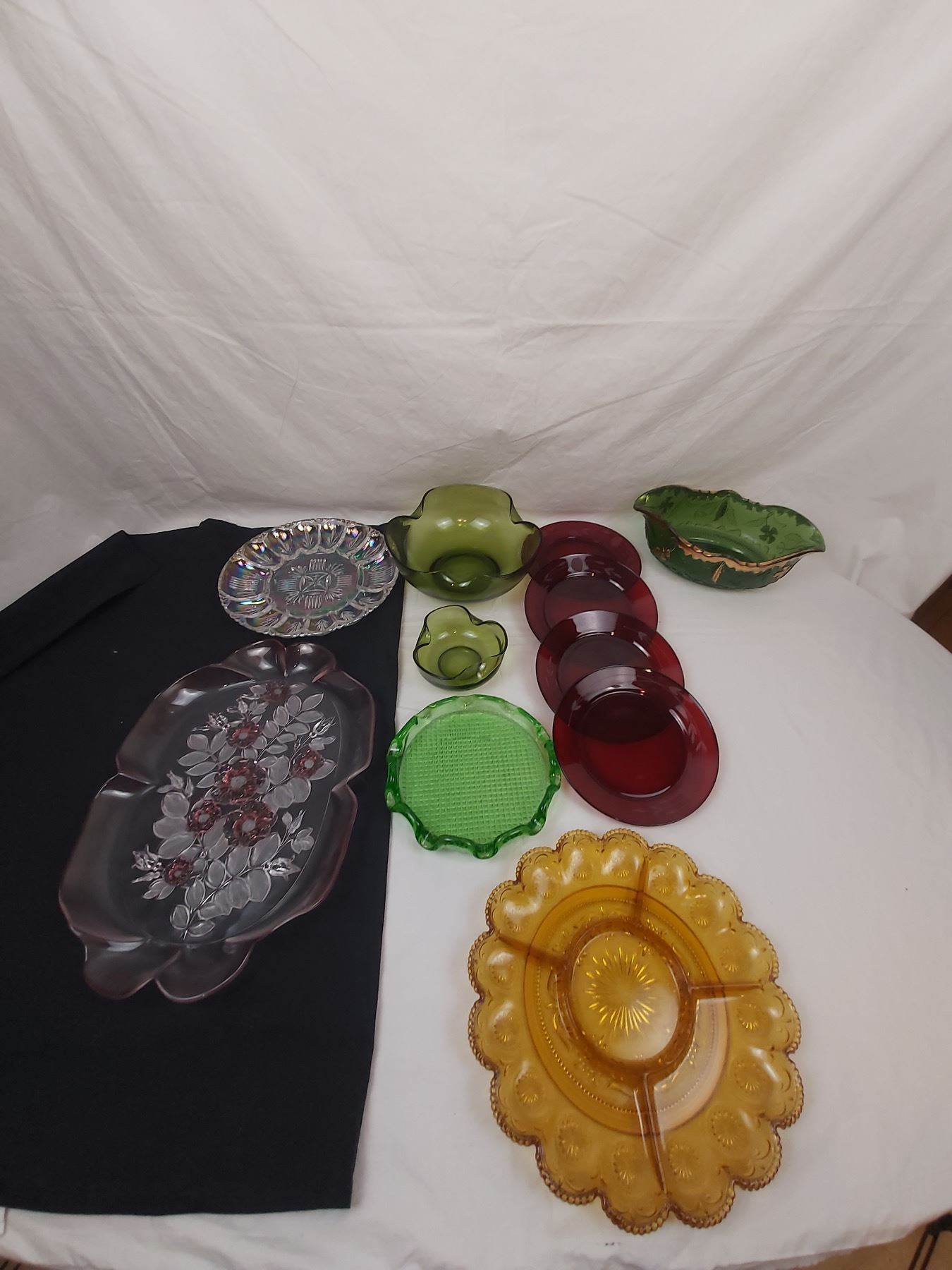 Opalascent deviled egg tray, Emerald green boat shaped bowl, Amber serving tray, etc. Largest; 16 x 11"