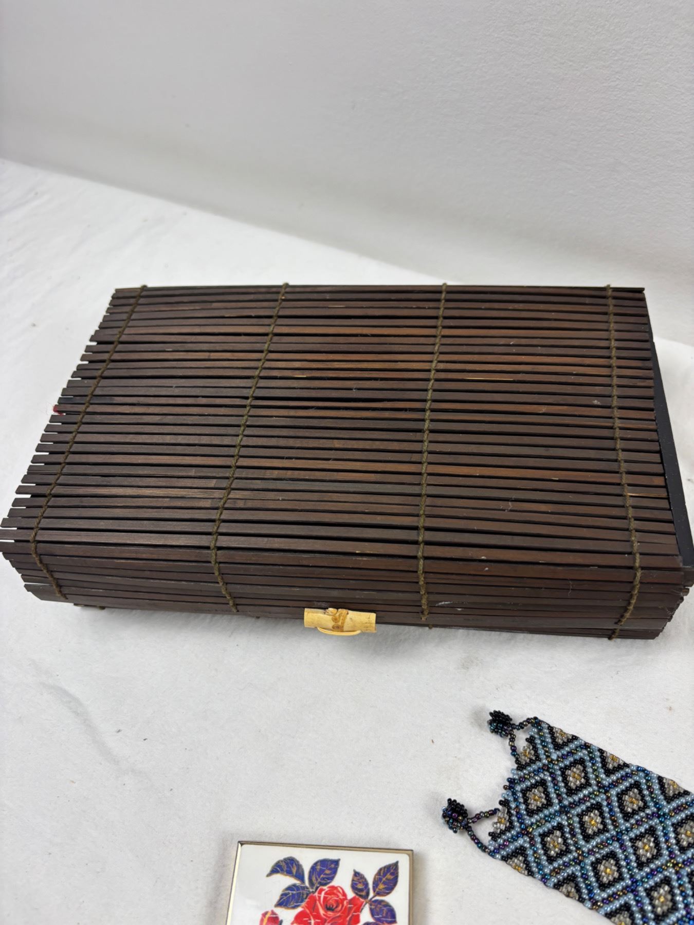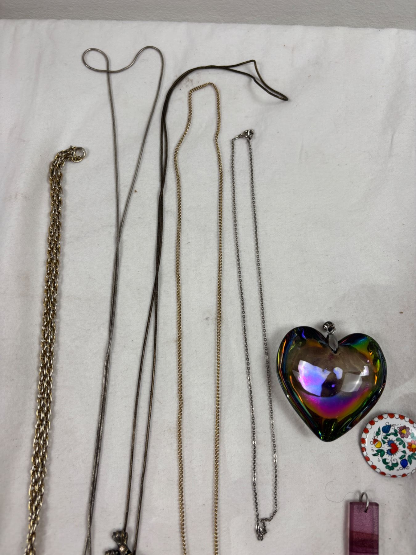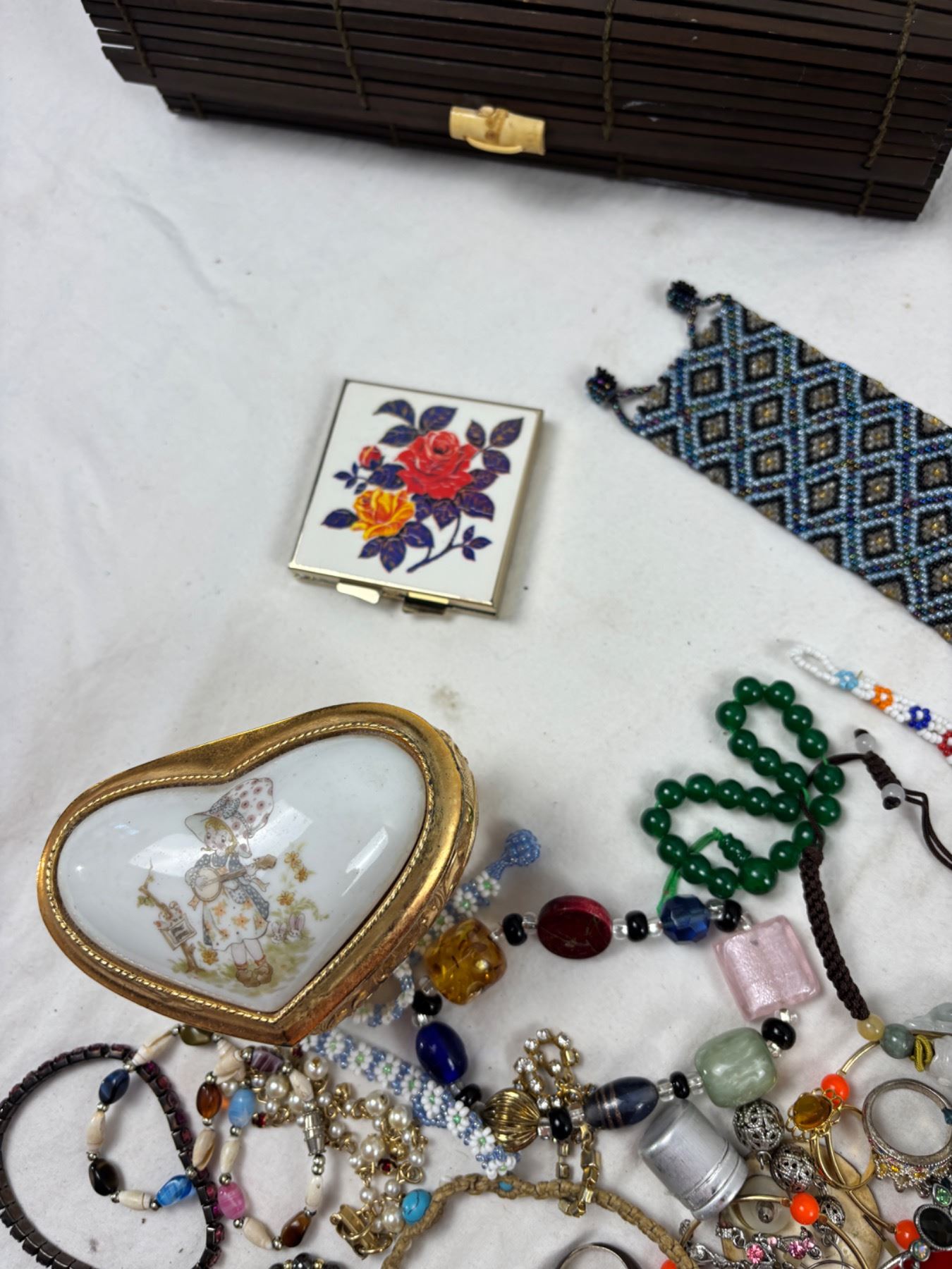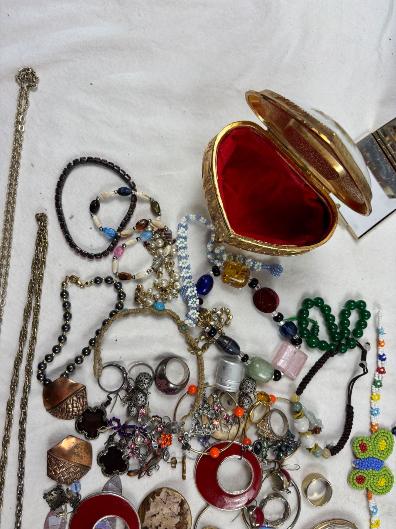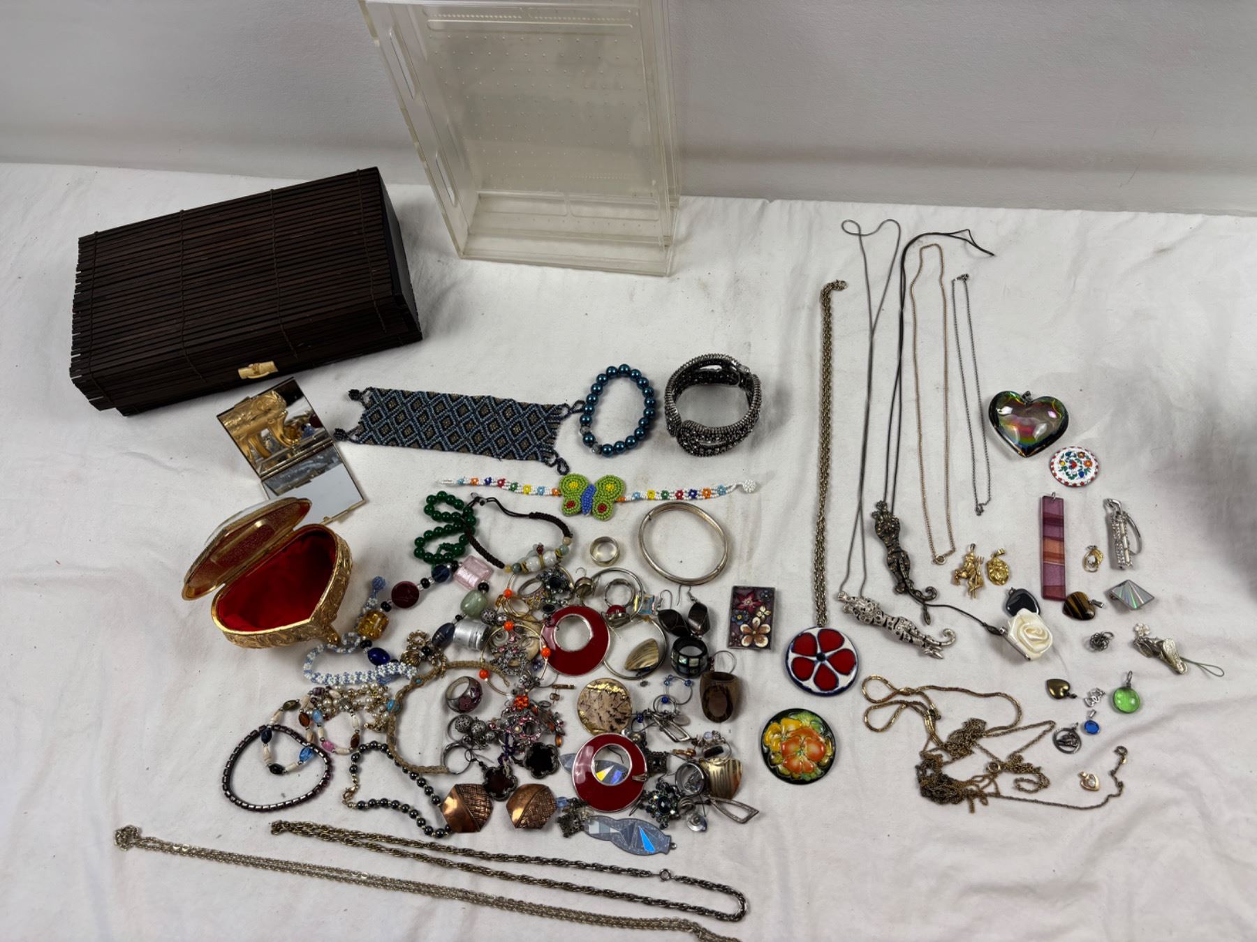Includes a plastic earring case (7"L x 4"W x 10"H), Various pendants, rings, and more