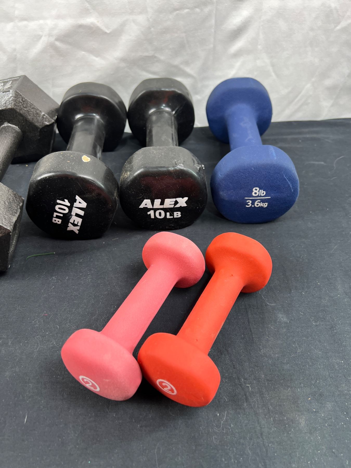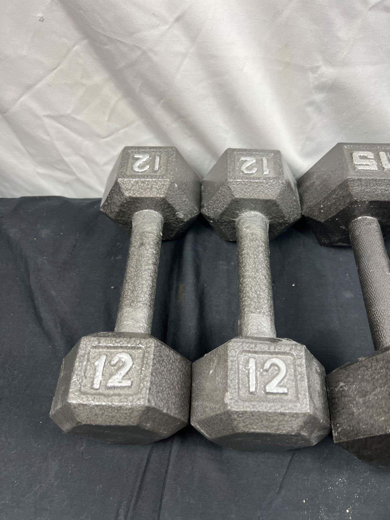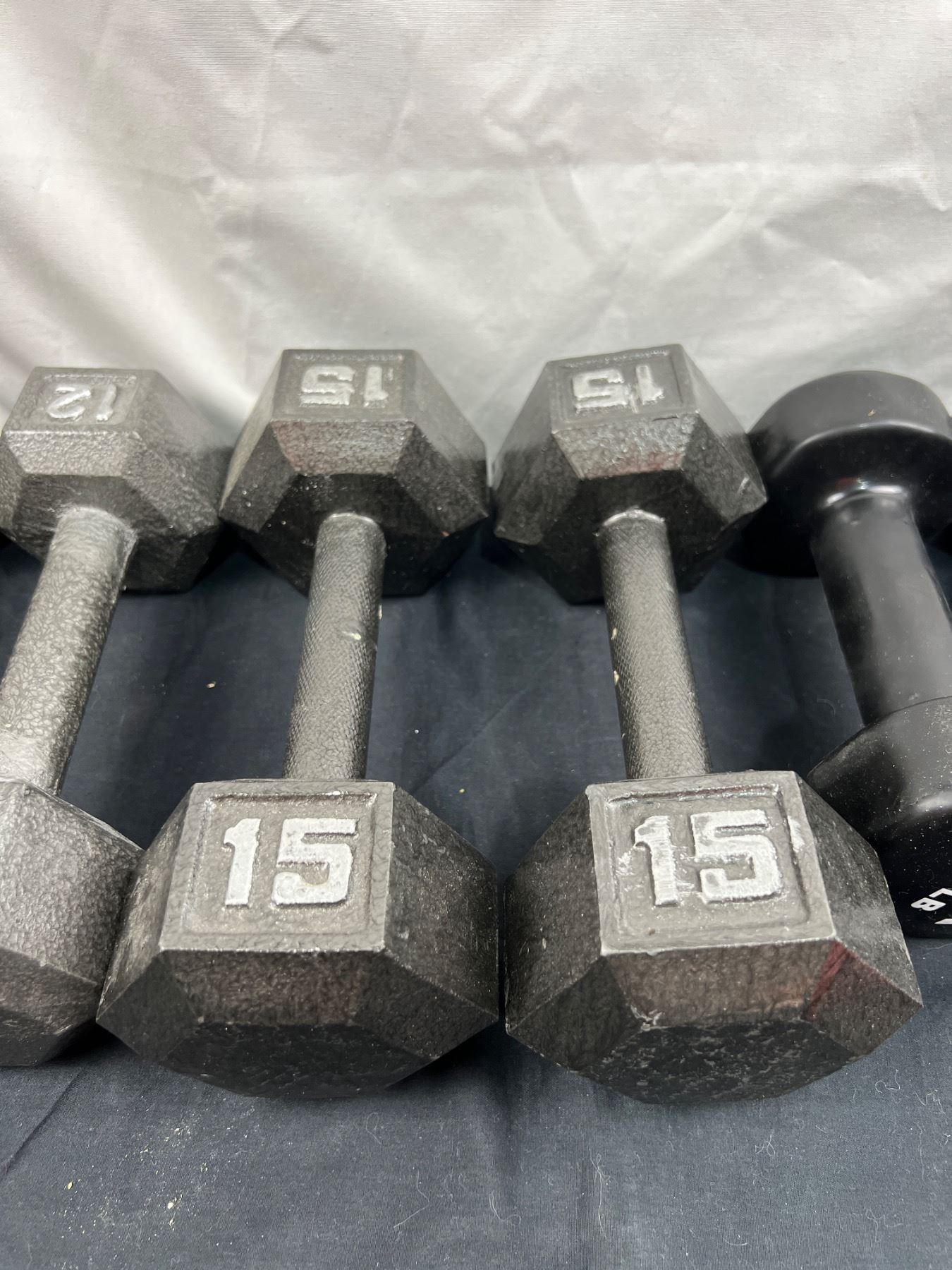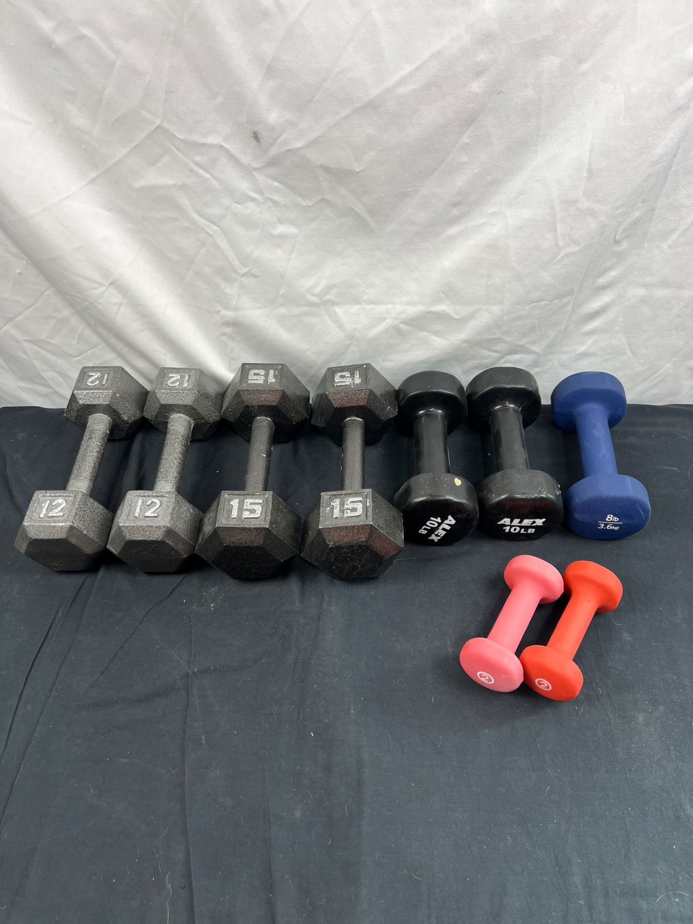 Includes two 12lb, 15lb, 10lb, 2lb, and one 8lb