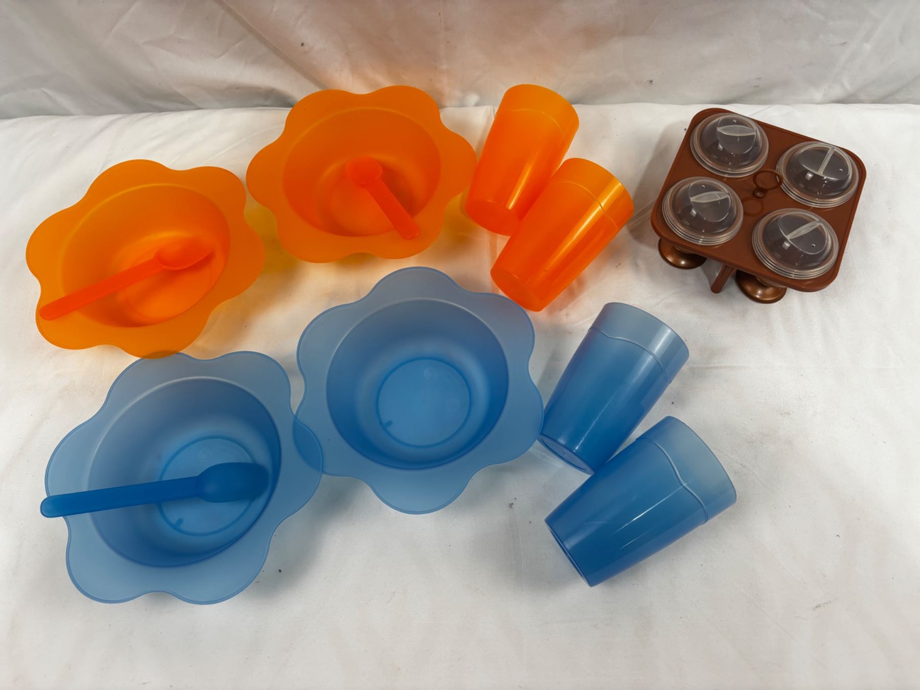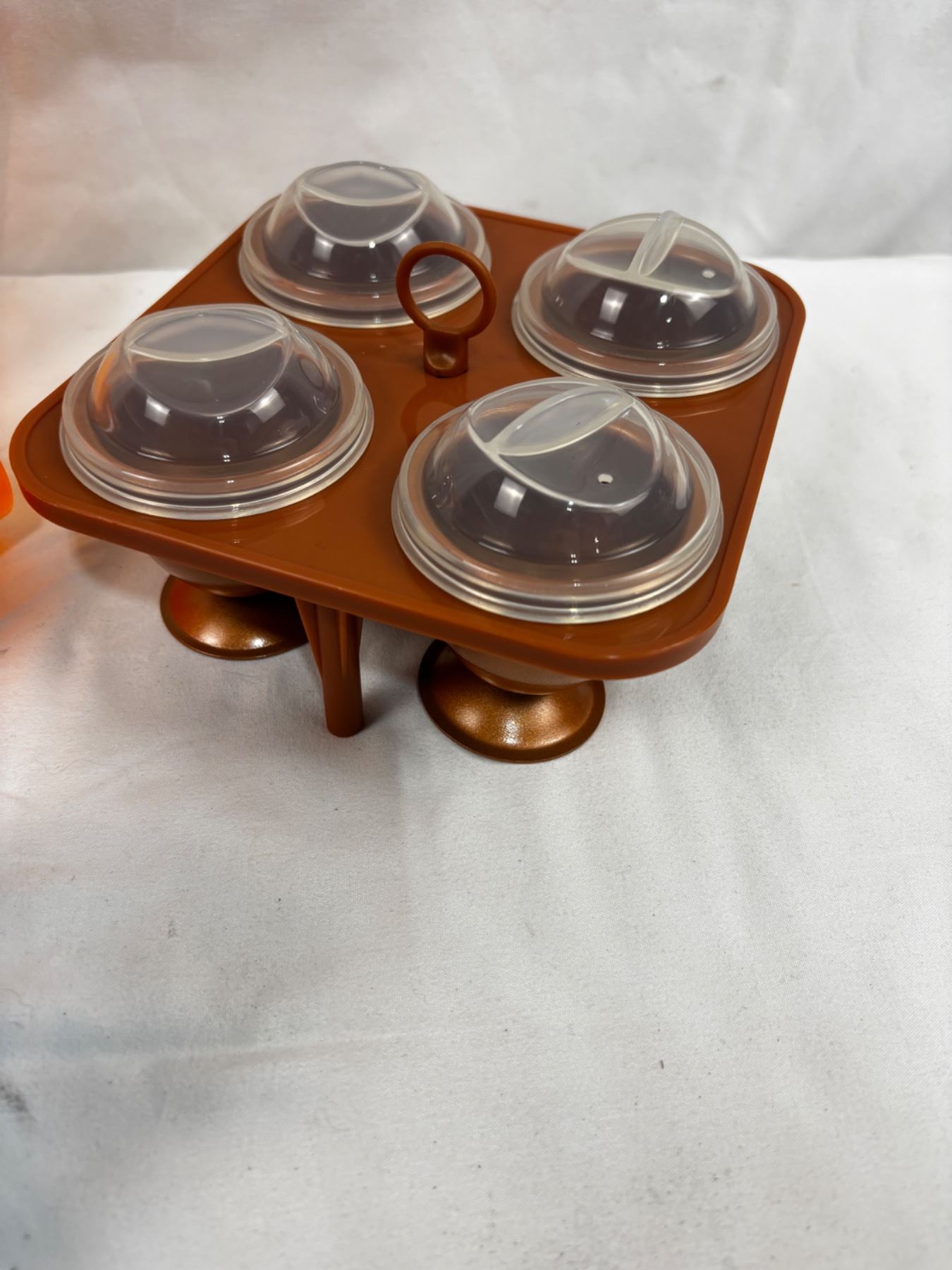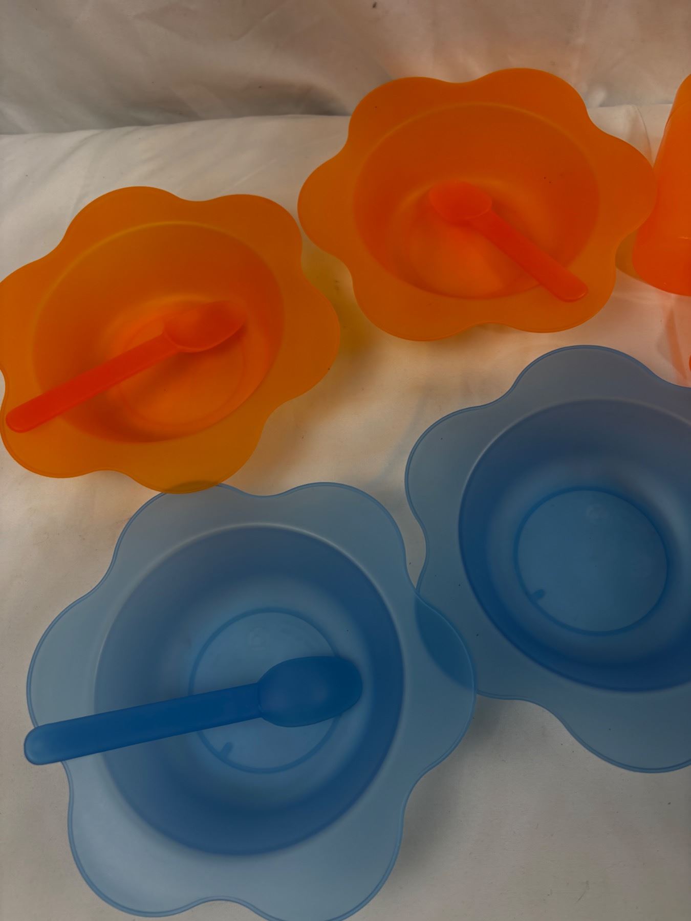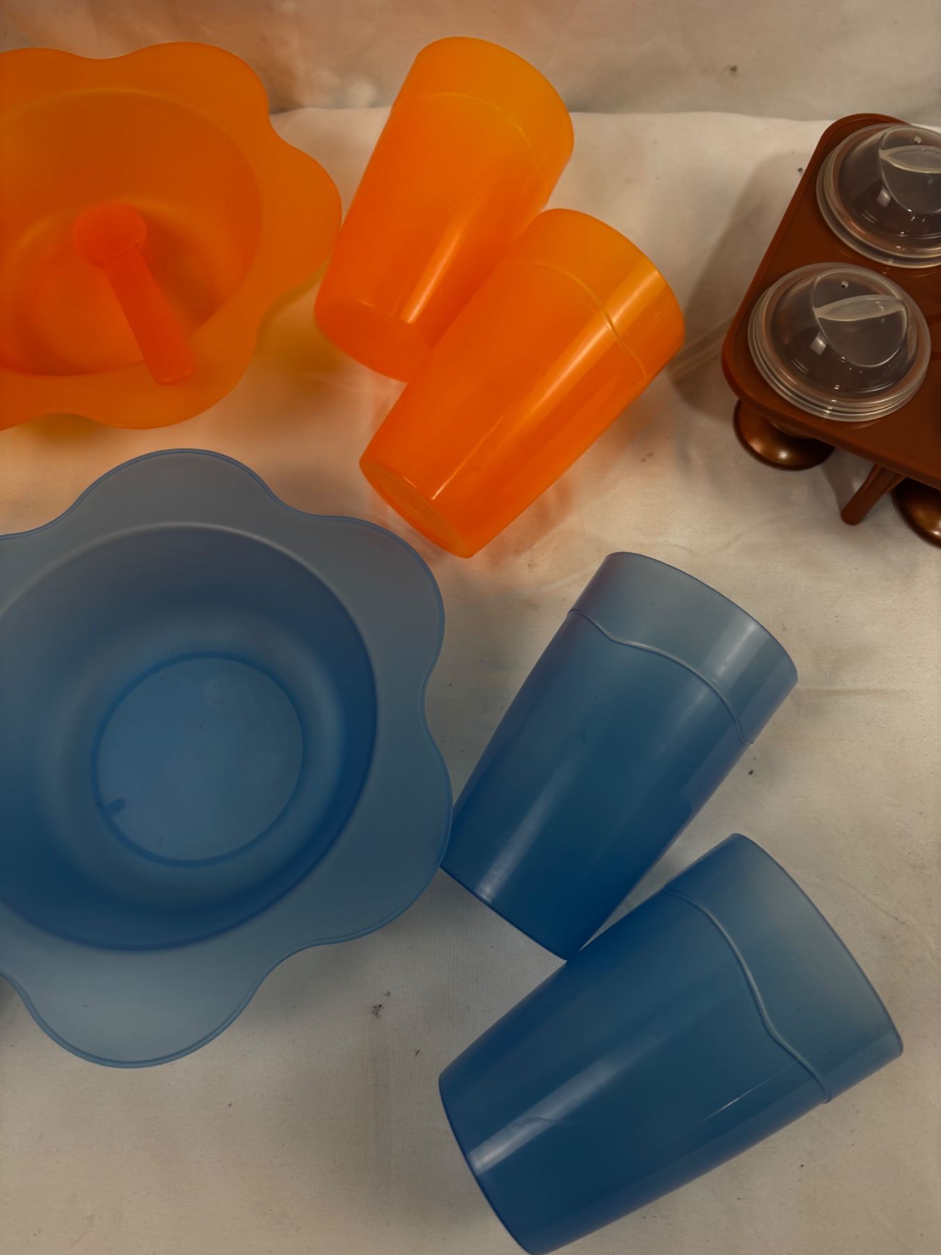 Includes, Set of plastic bowls and cups (only 3 spoons), plastic and metal egg dishes
