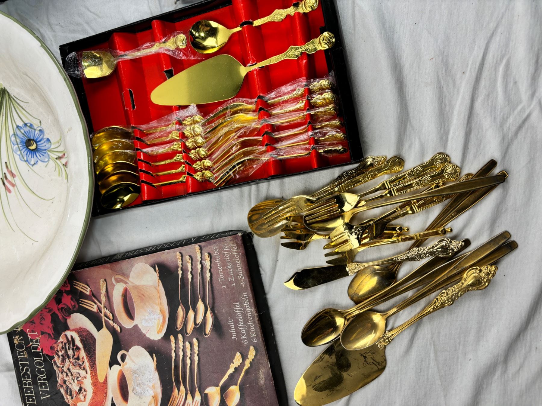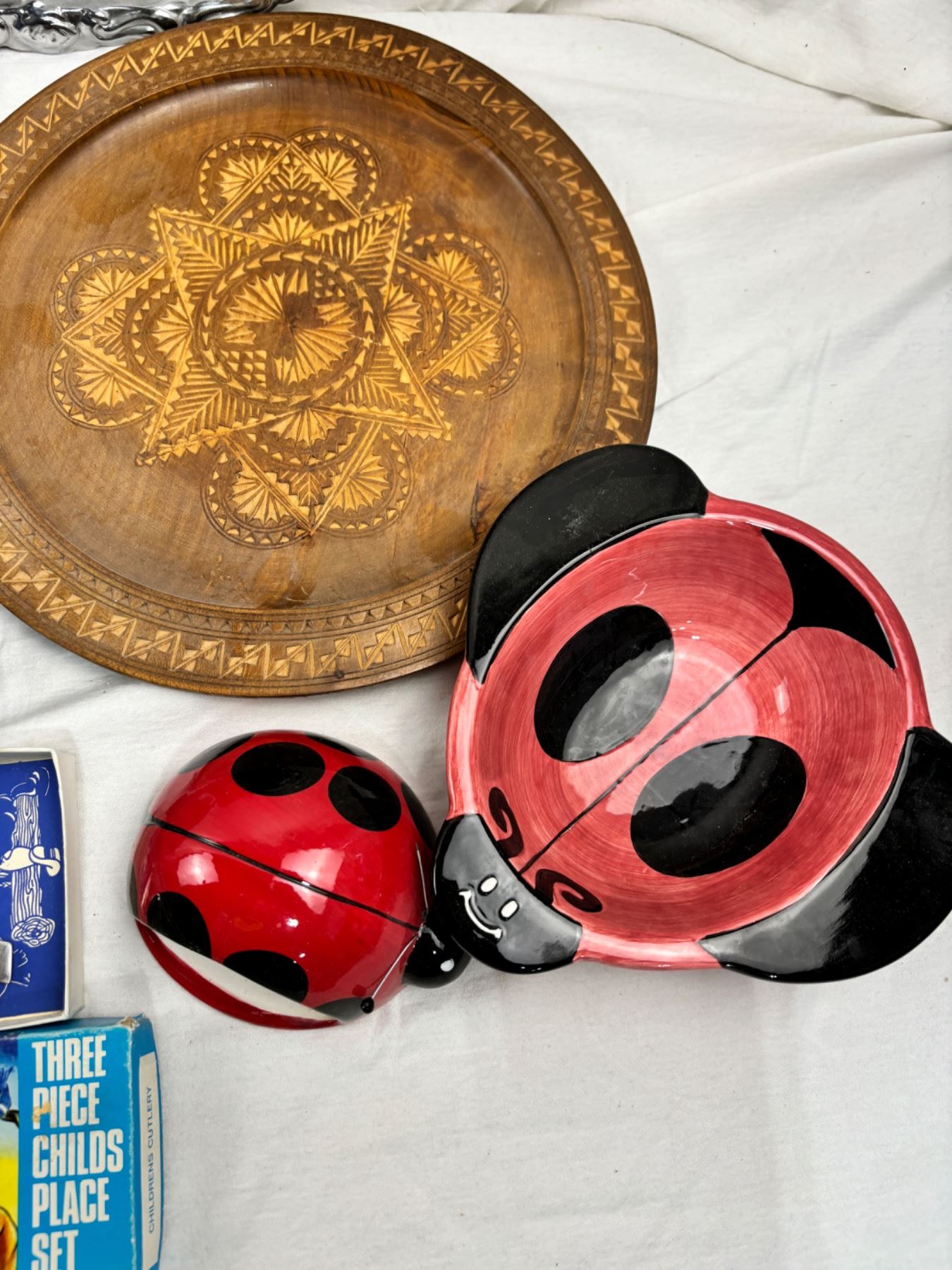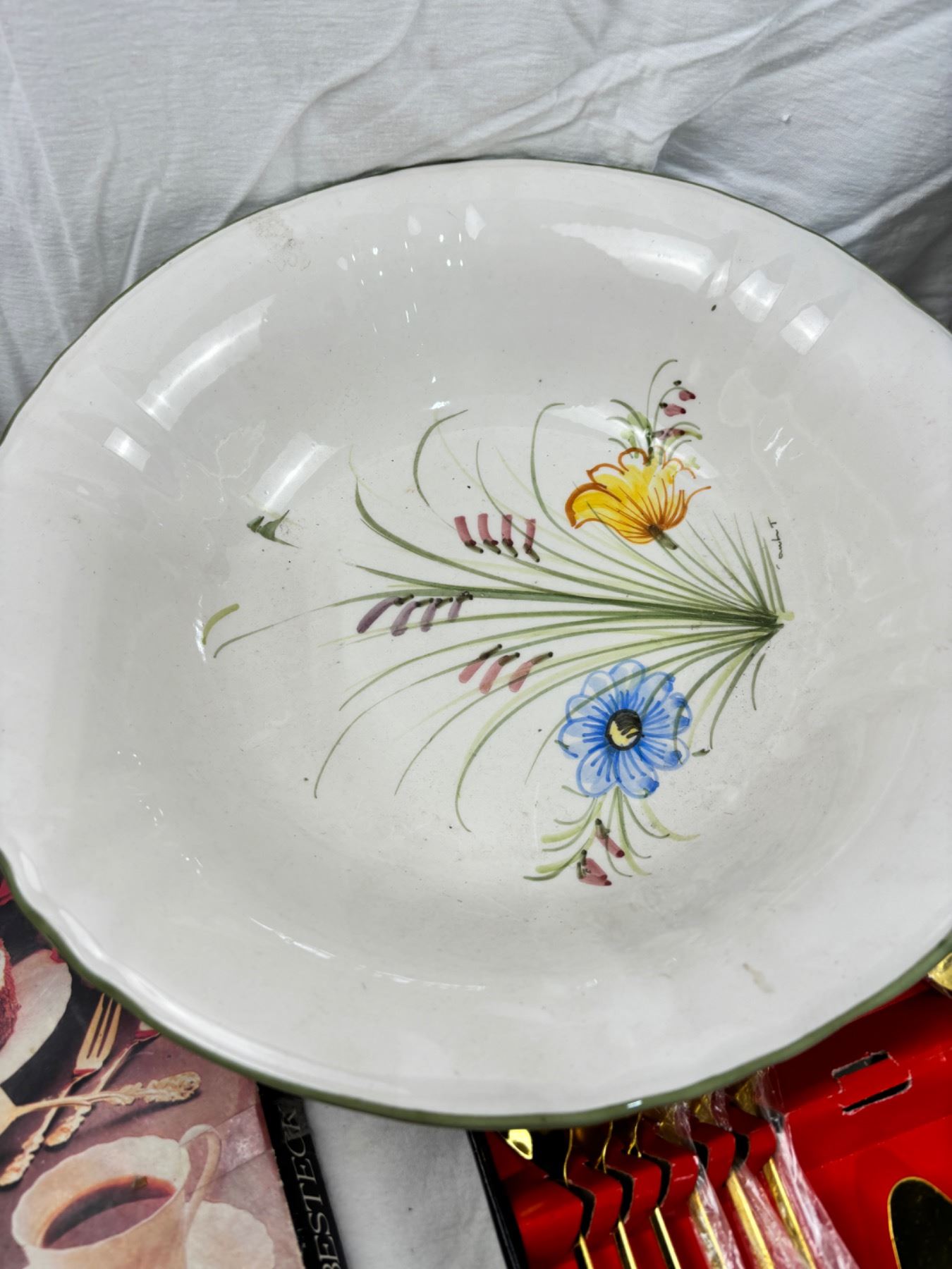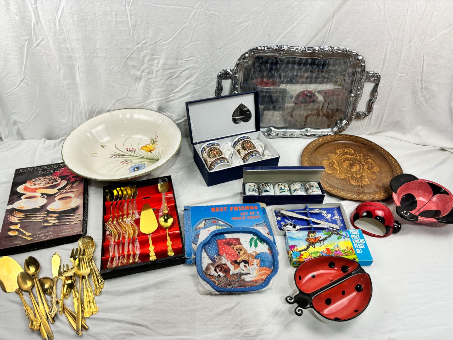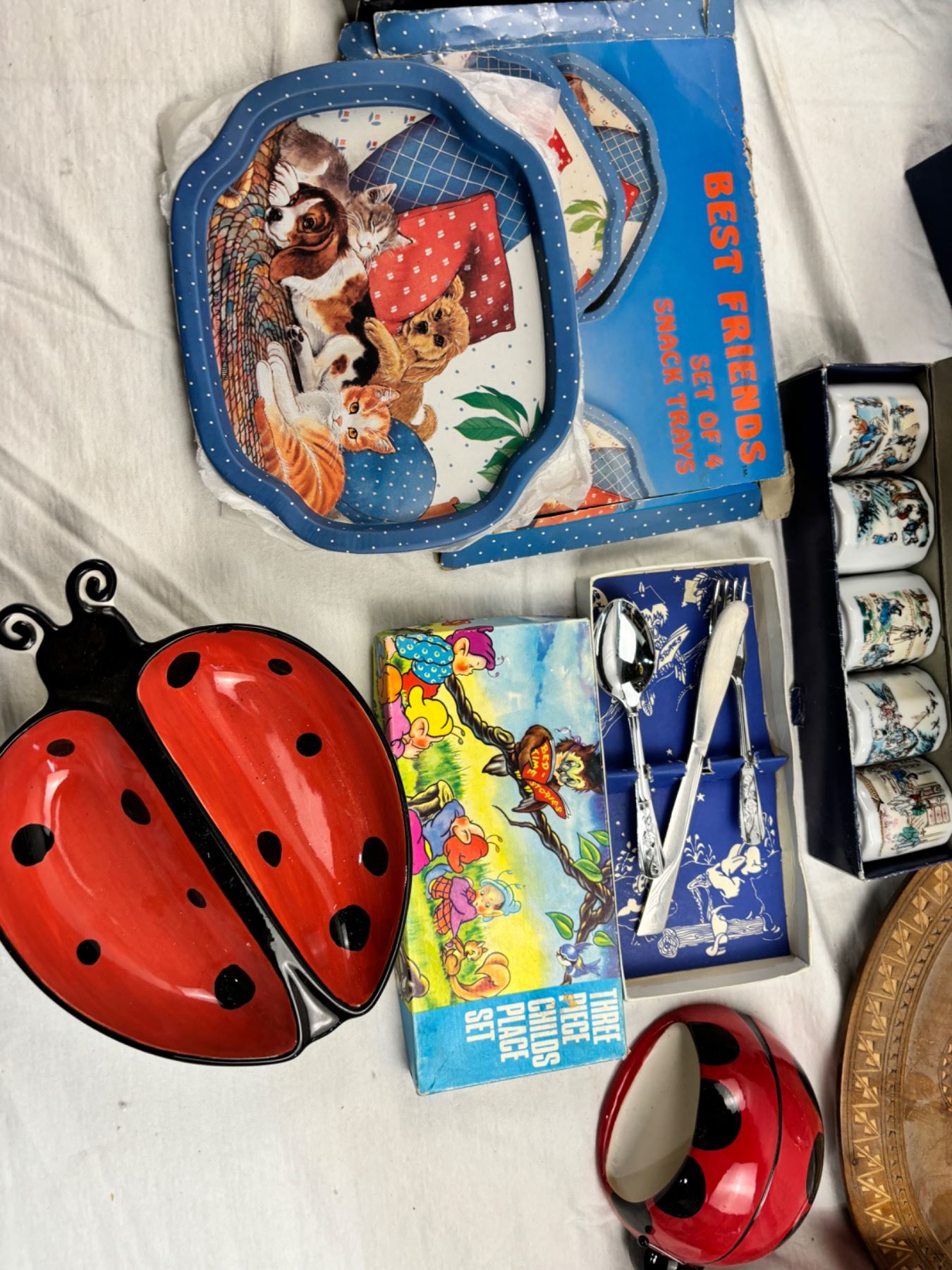 Includes, Porcelain Knobbly mugs, Childs place set, snack trays, cutlery, etc.