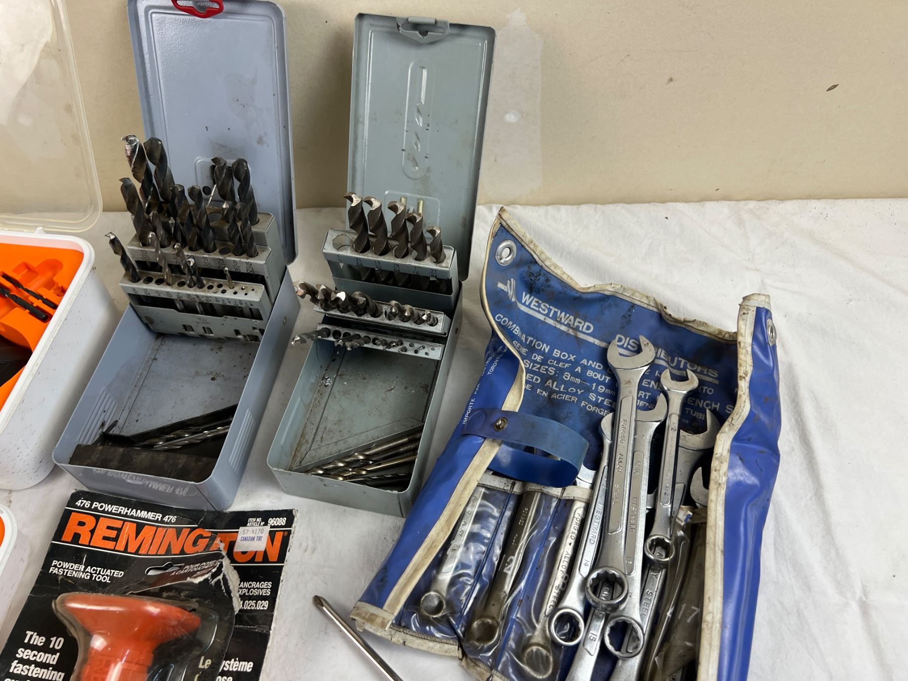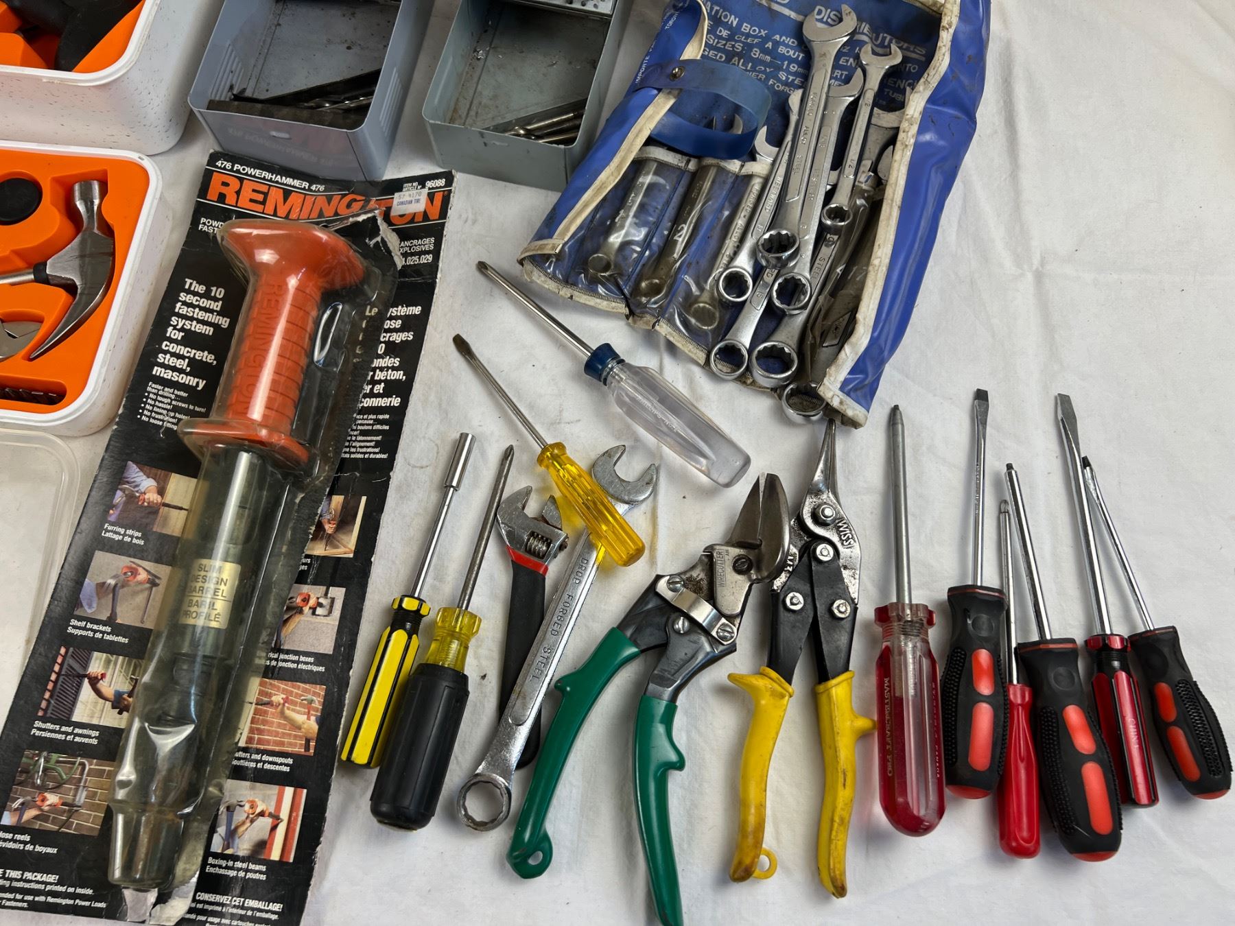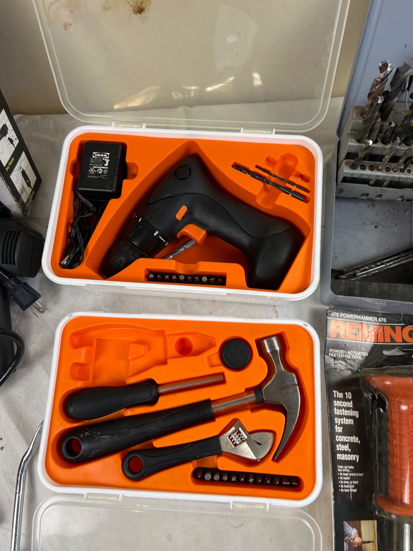 Includes, Ikea Drill, Milwaukee Heat Gun (both turn on), Drill Bits, Remington 476 Powerhammer, Westward wrenches, and more