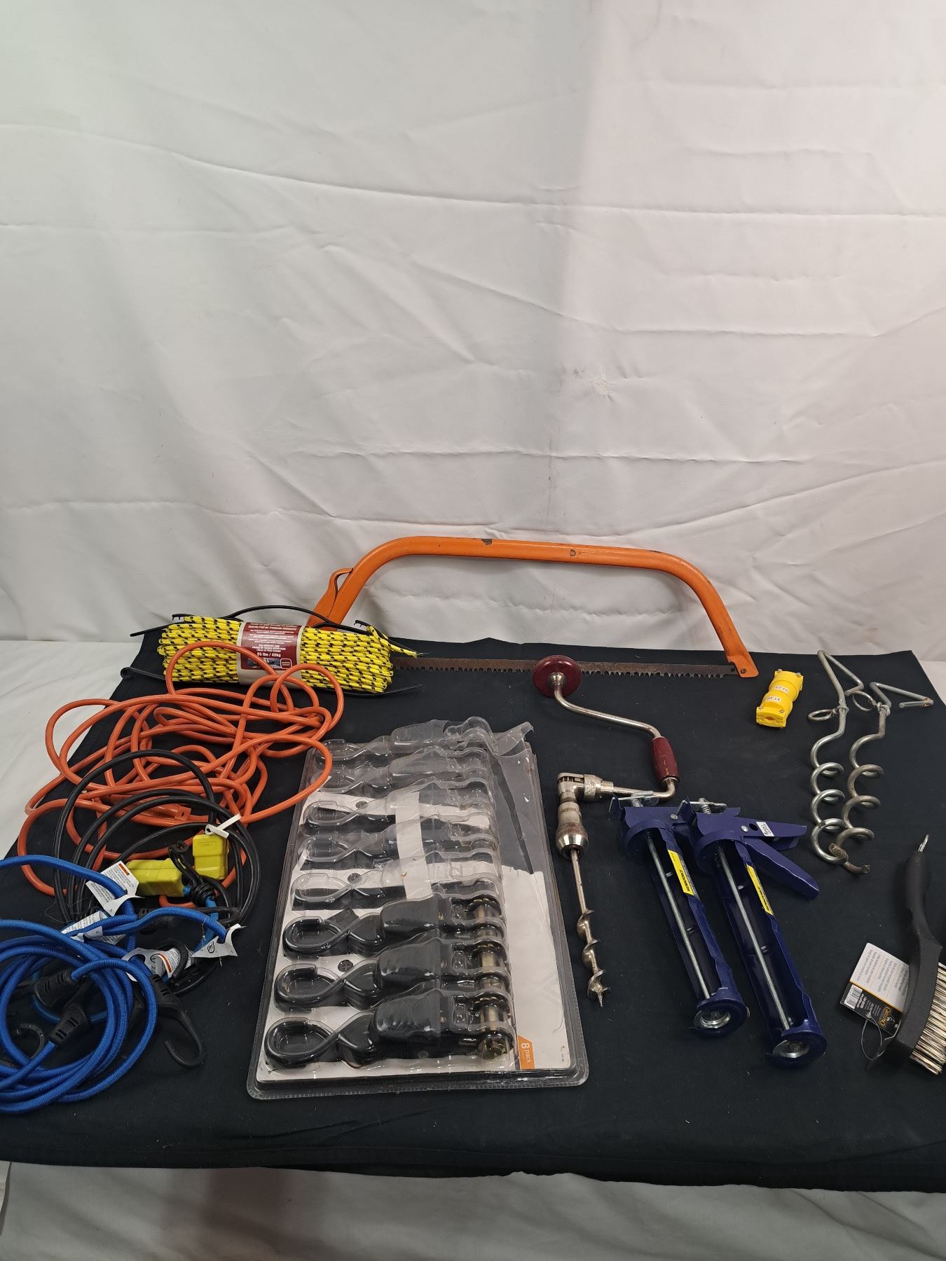 Extension cords, bungees, hand drill, rope, bbq brushes, saw, and more