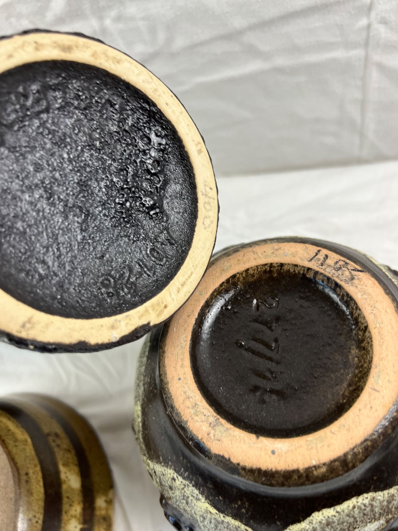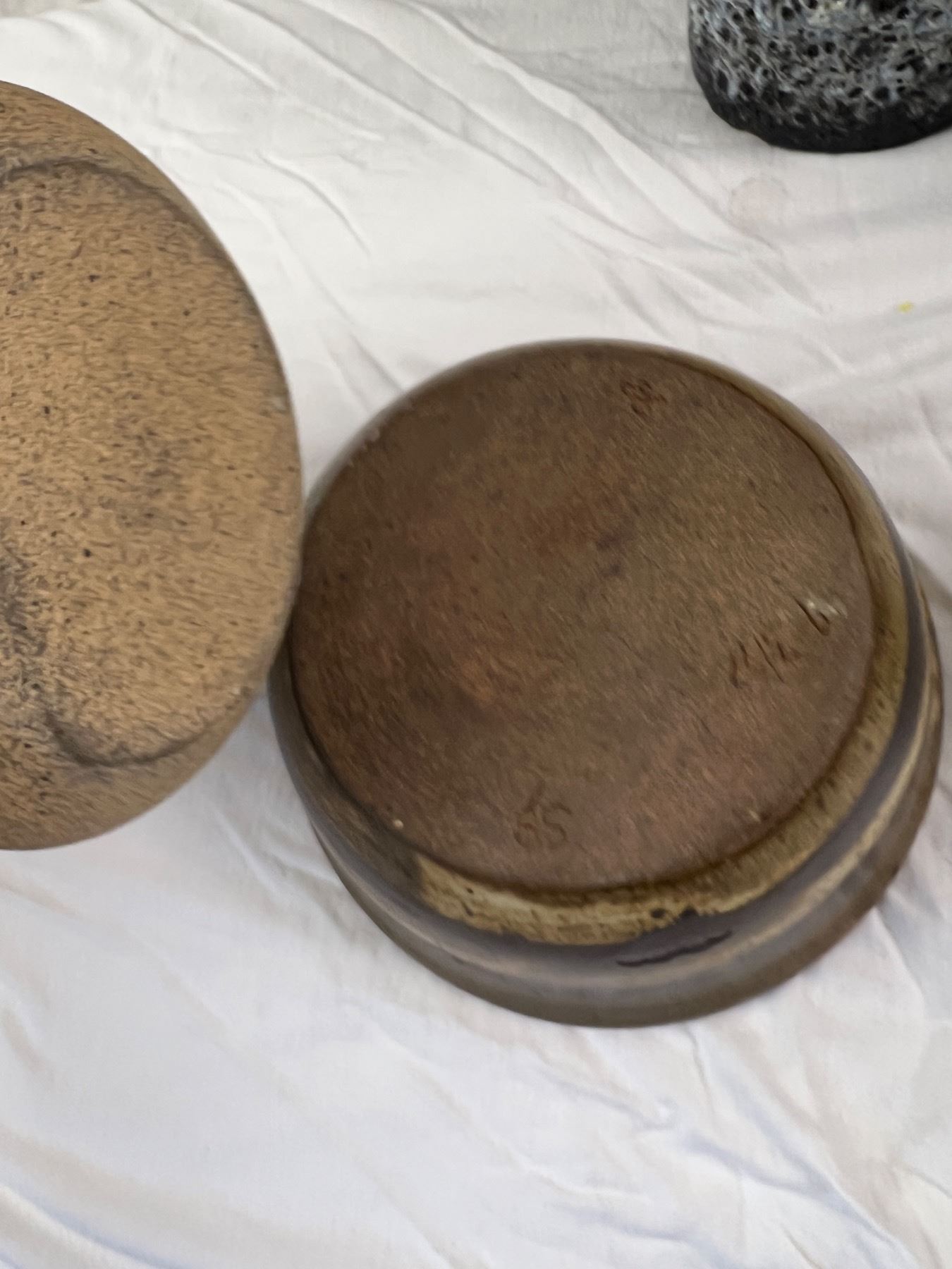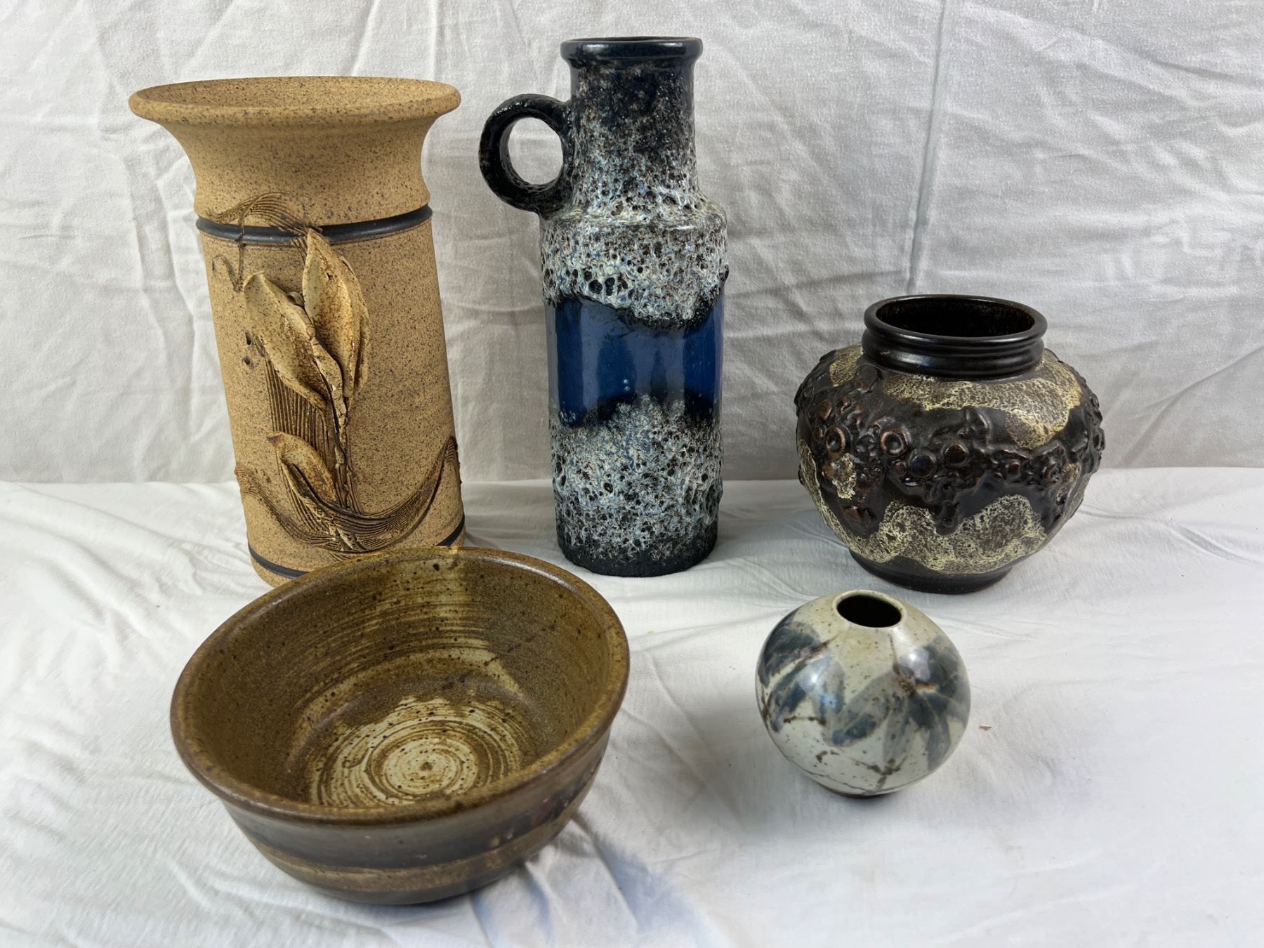 Some pieces are signed by the artist on the bottom, The large blue vase is 11"H