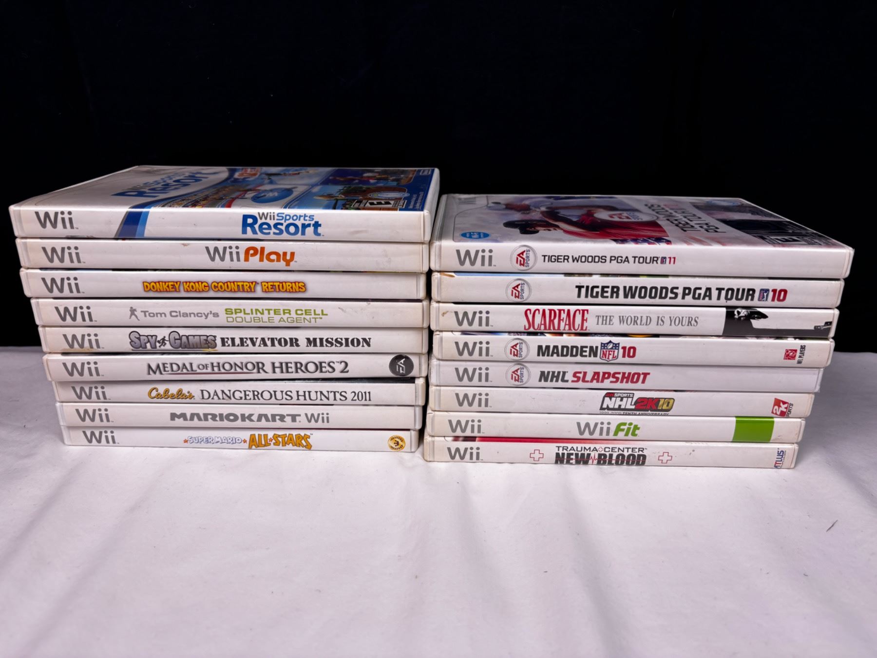 All are open cases, Titles include MarioKart, Donkey Kong Country Returns, Wii Play, and more