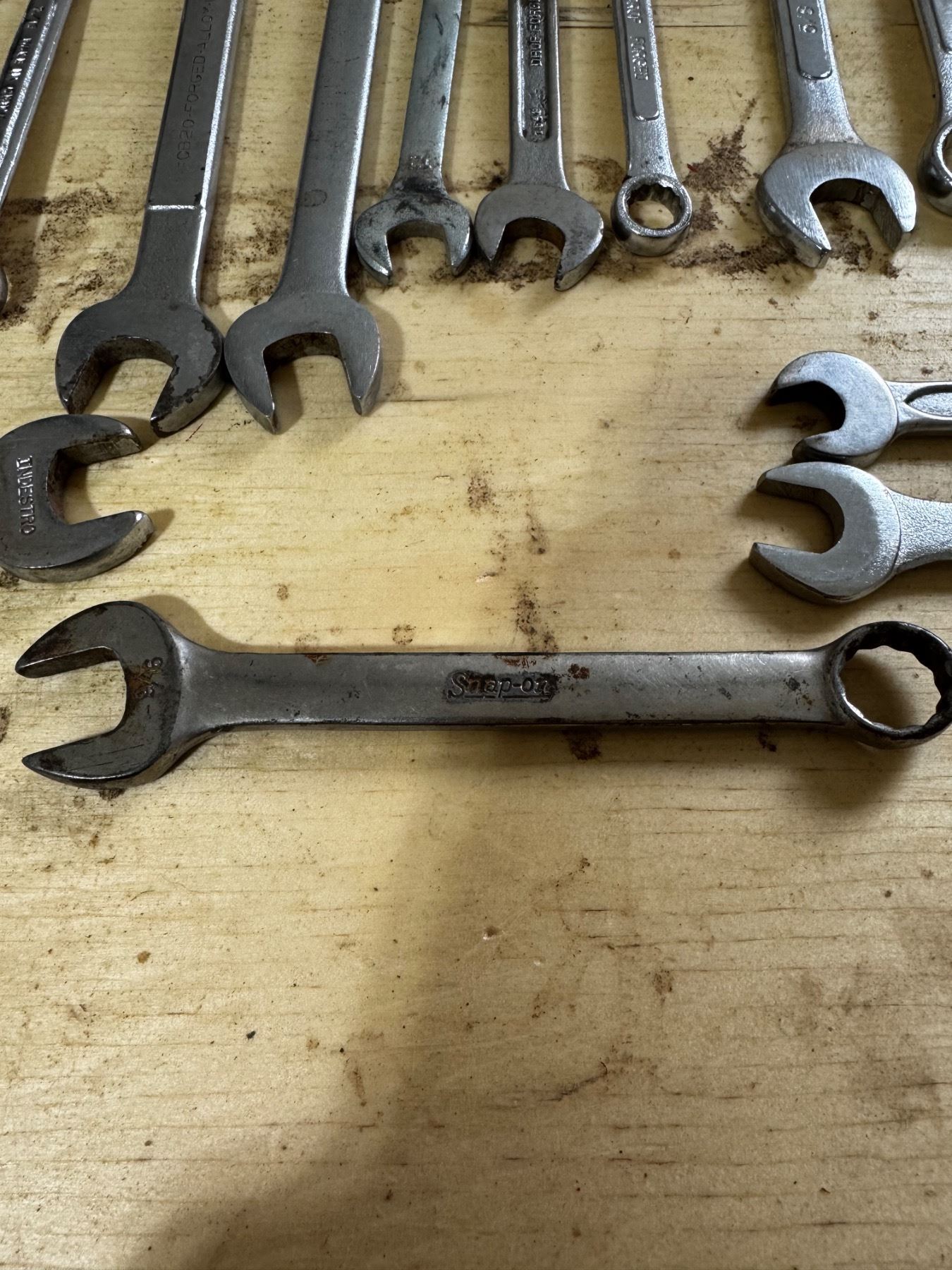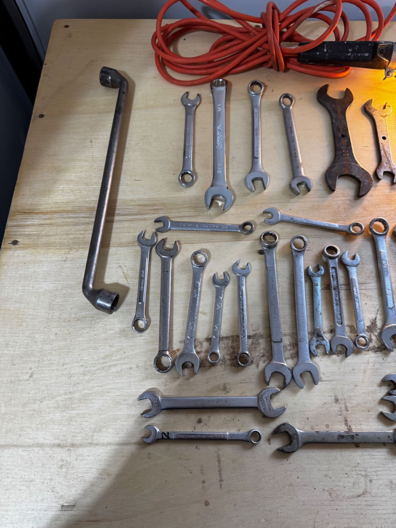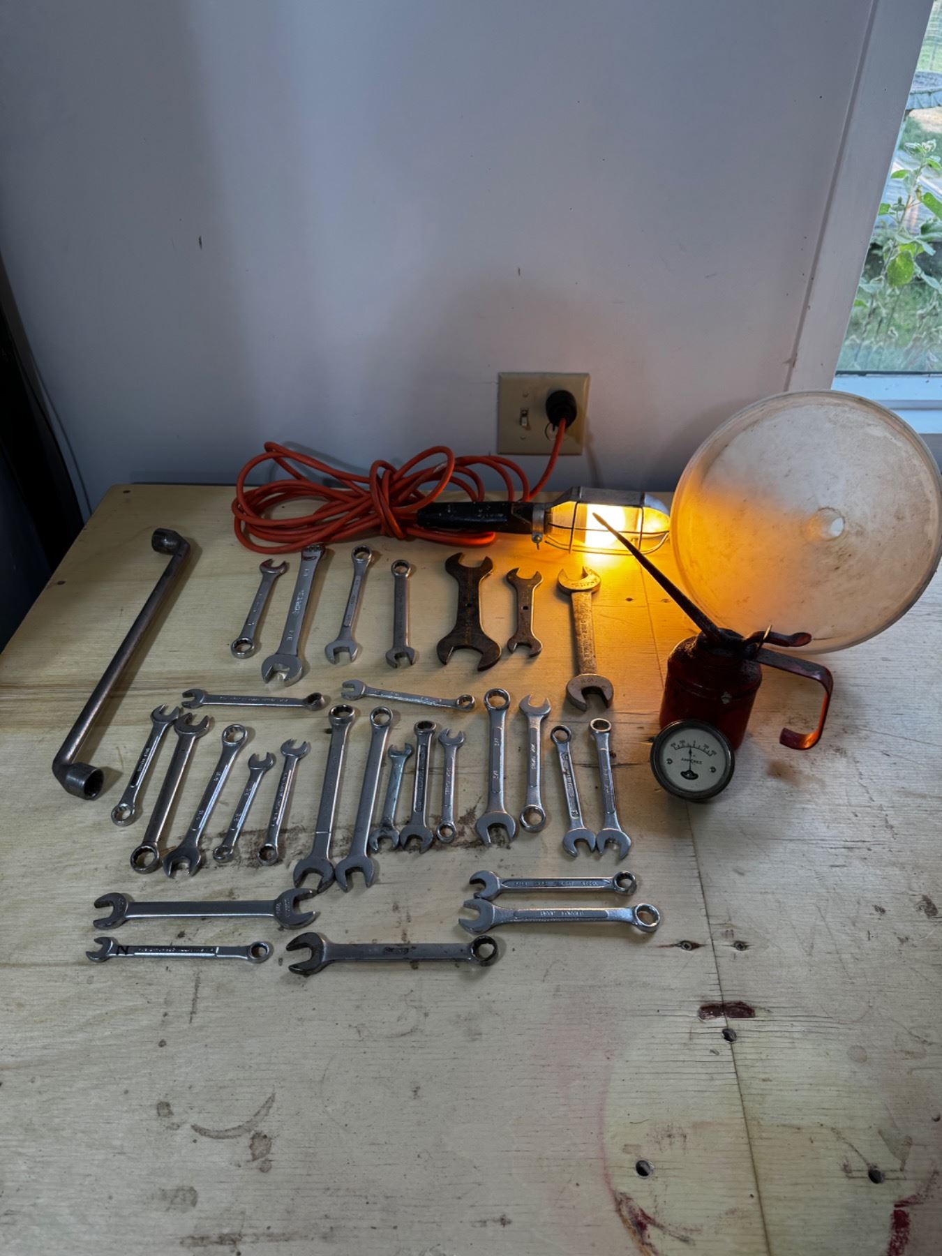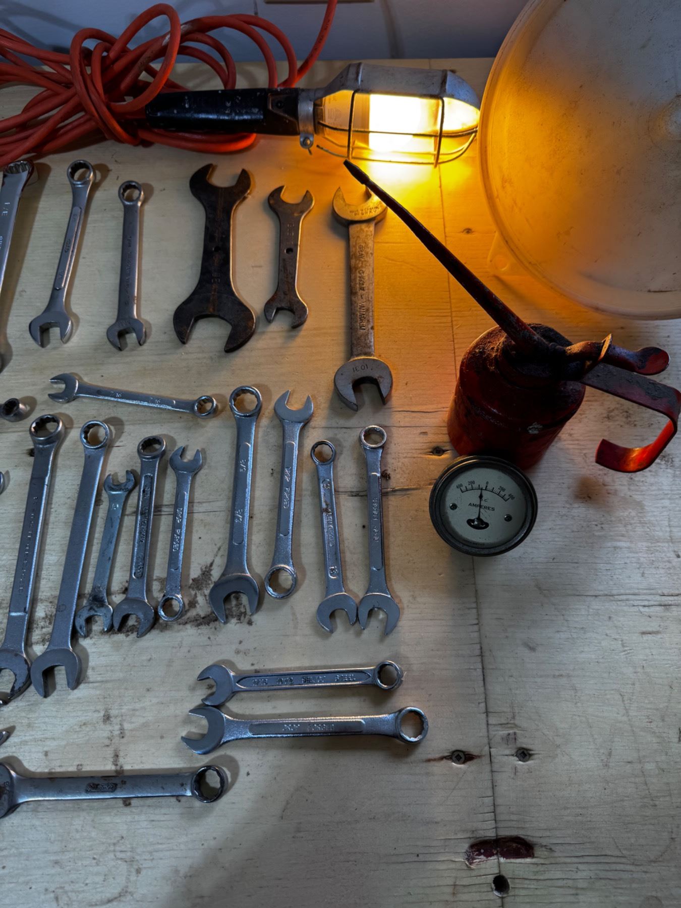 Includes vintage oil can, snap-on wrench, funnel, etc