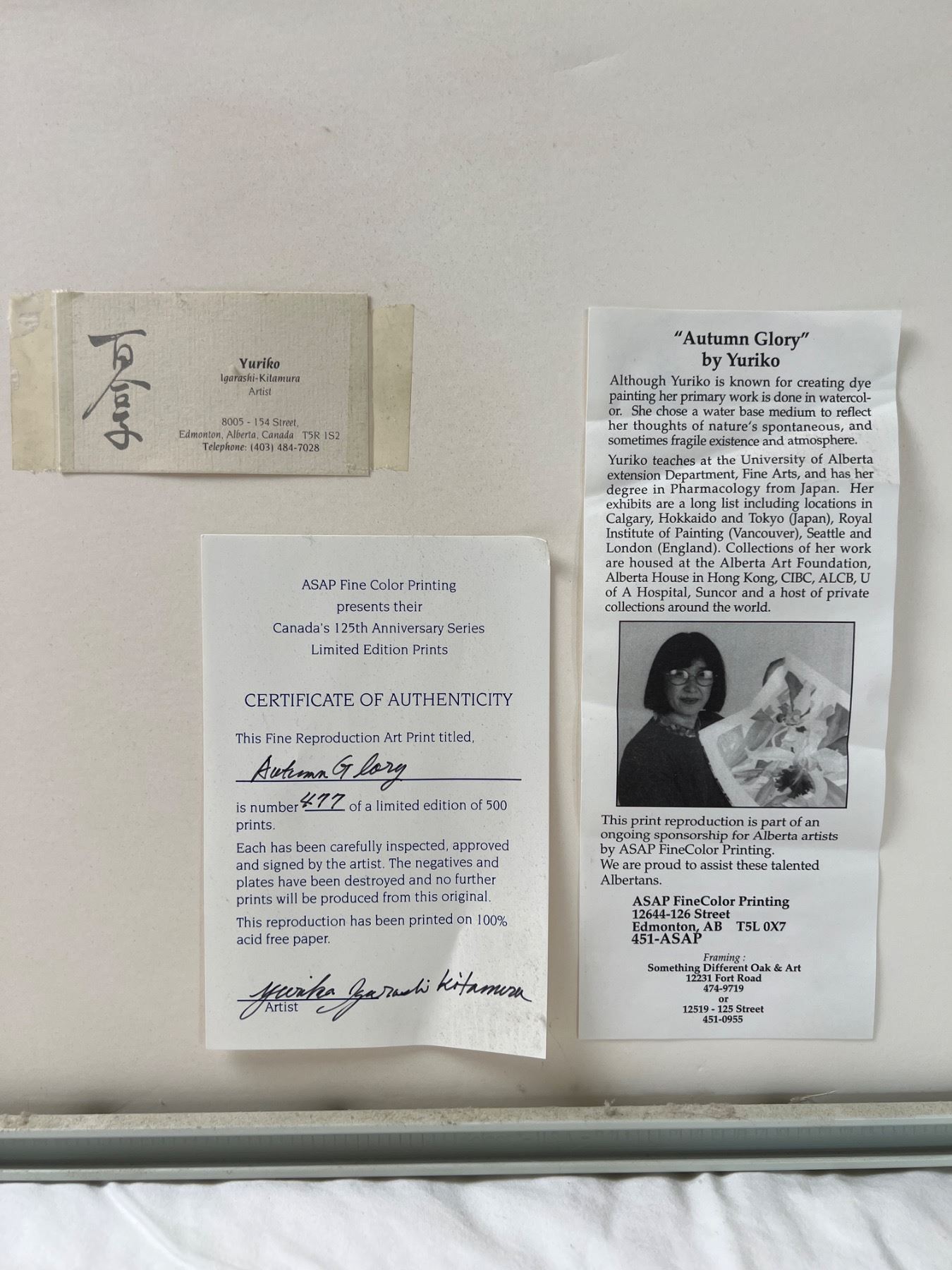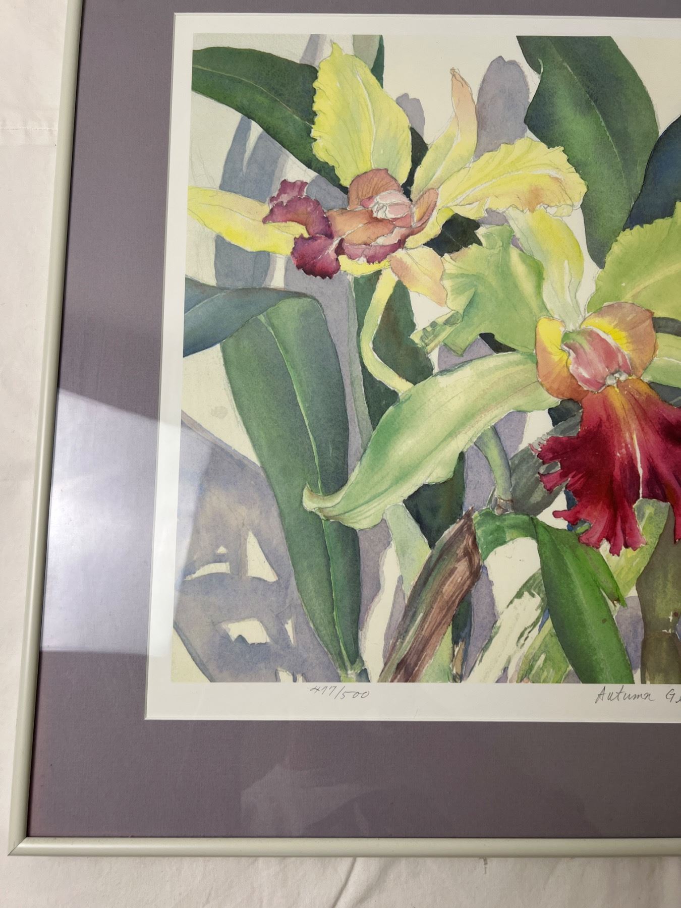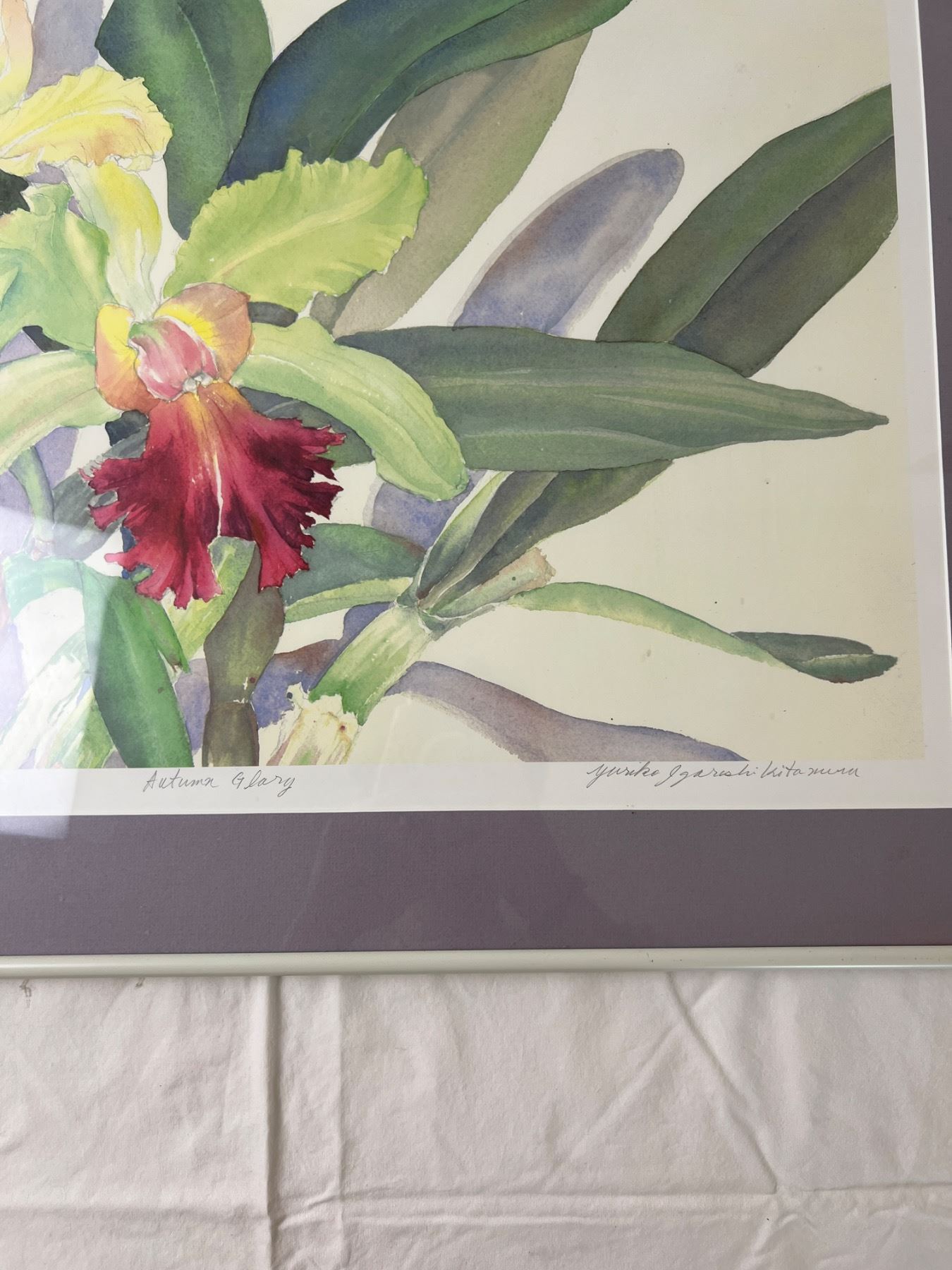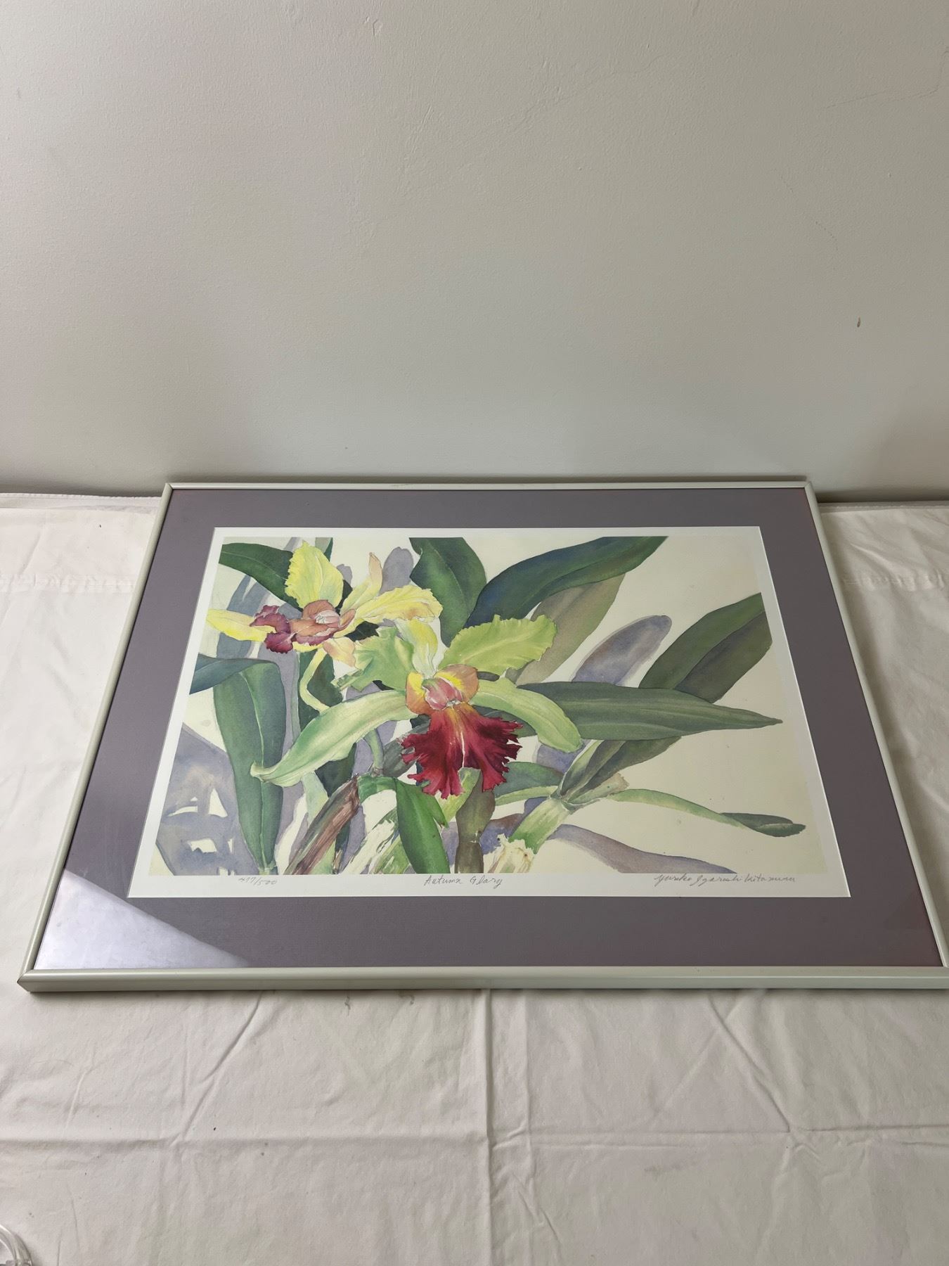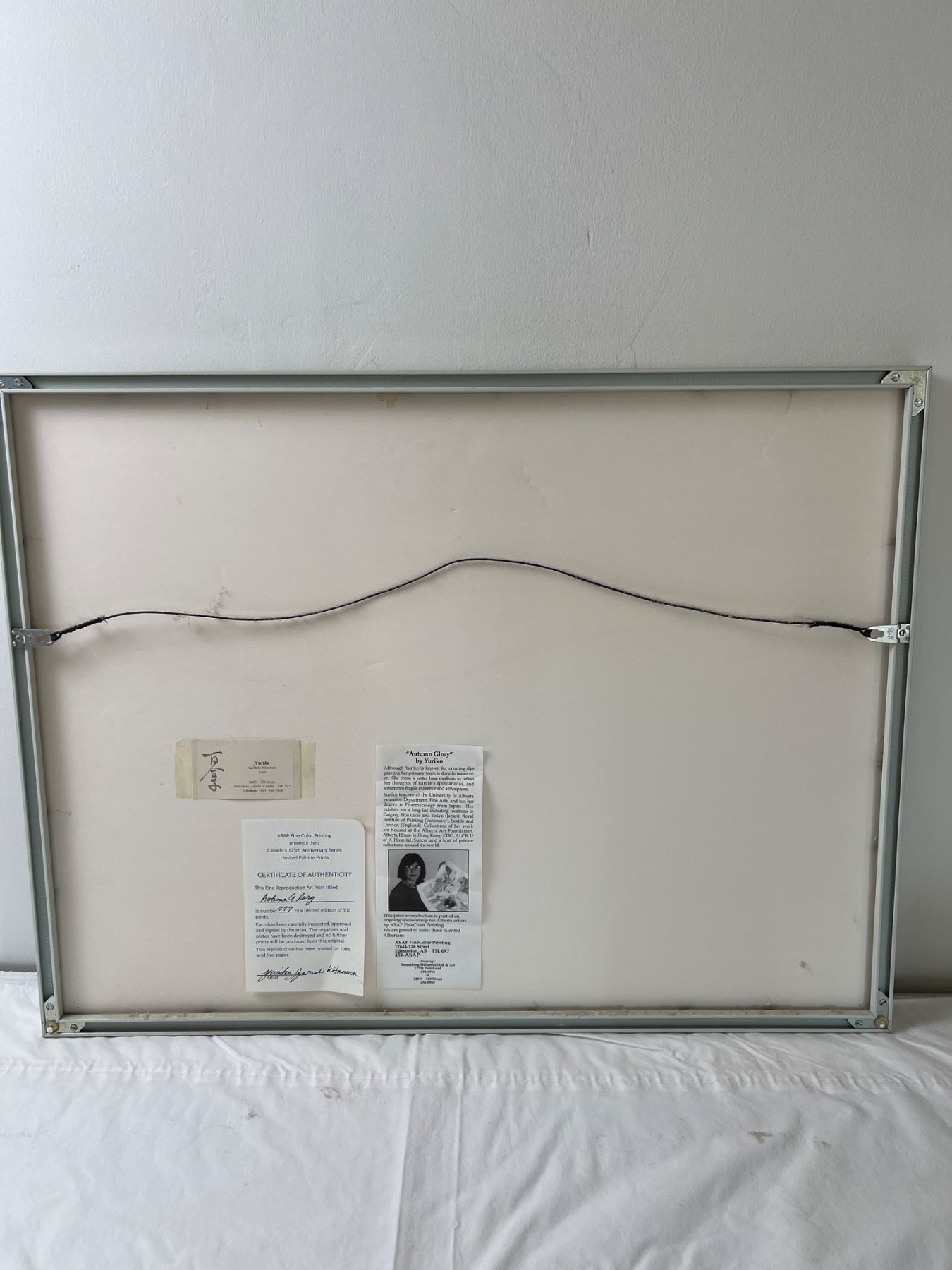Certificate of authenticity on rear of artwork.  Measures 28" by 22". Mark on top of frame.