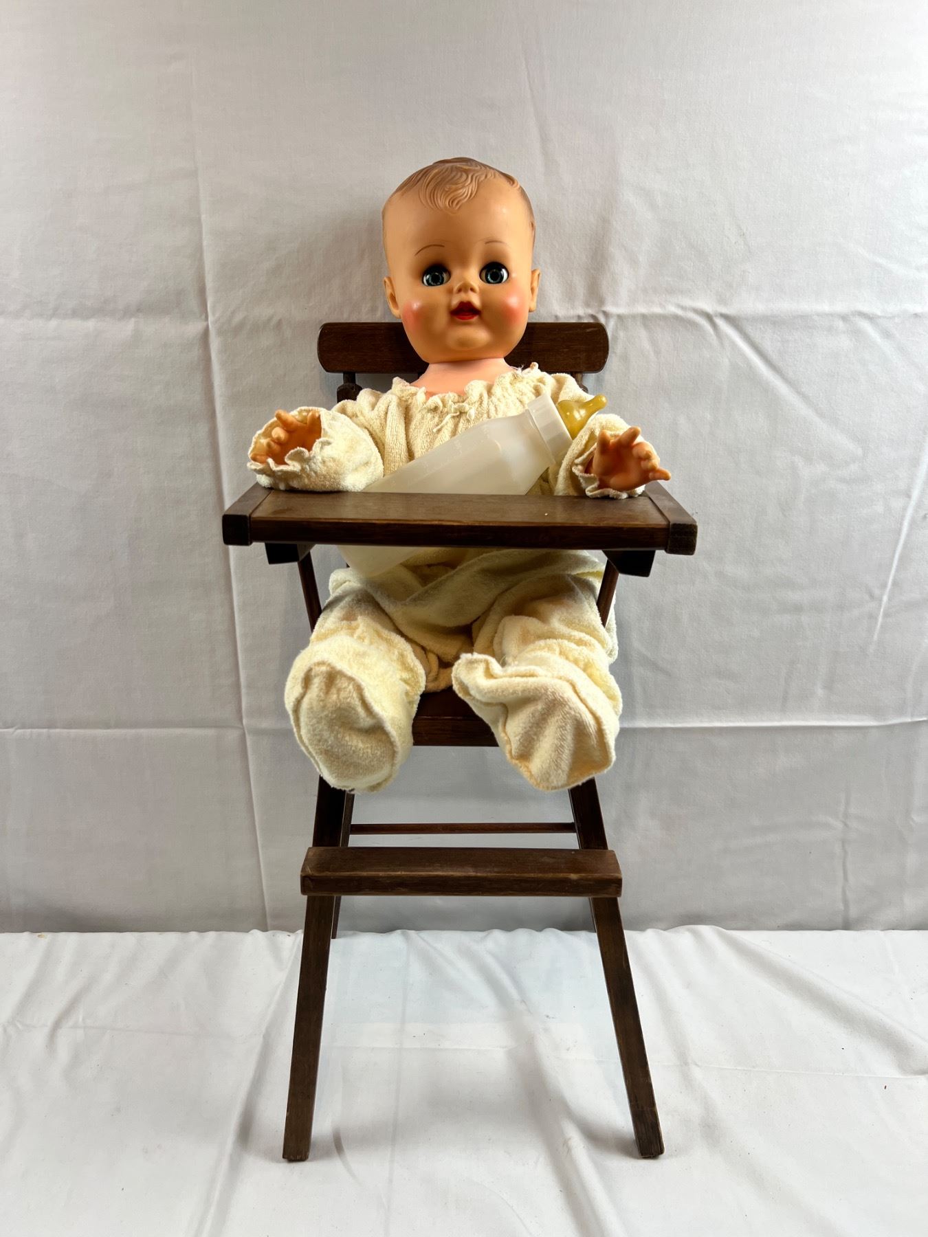 Stands 22" tall without the baby. Some wear to feet of wood.