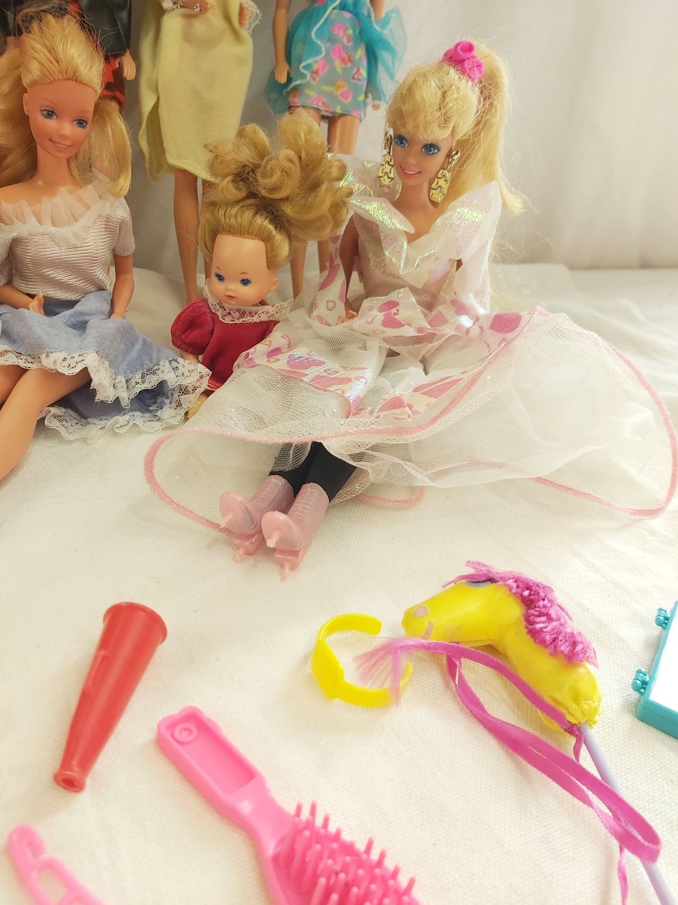Includes various Barbies and other dolls, various pieces of clothing and accessories