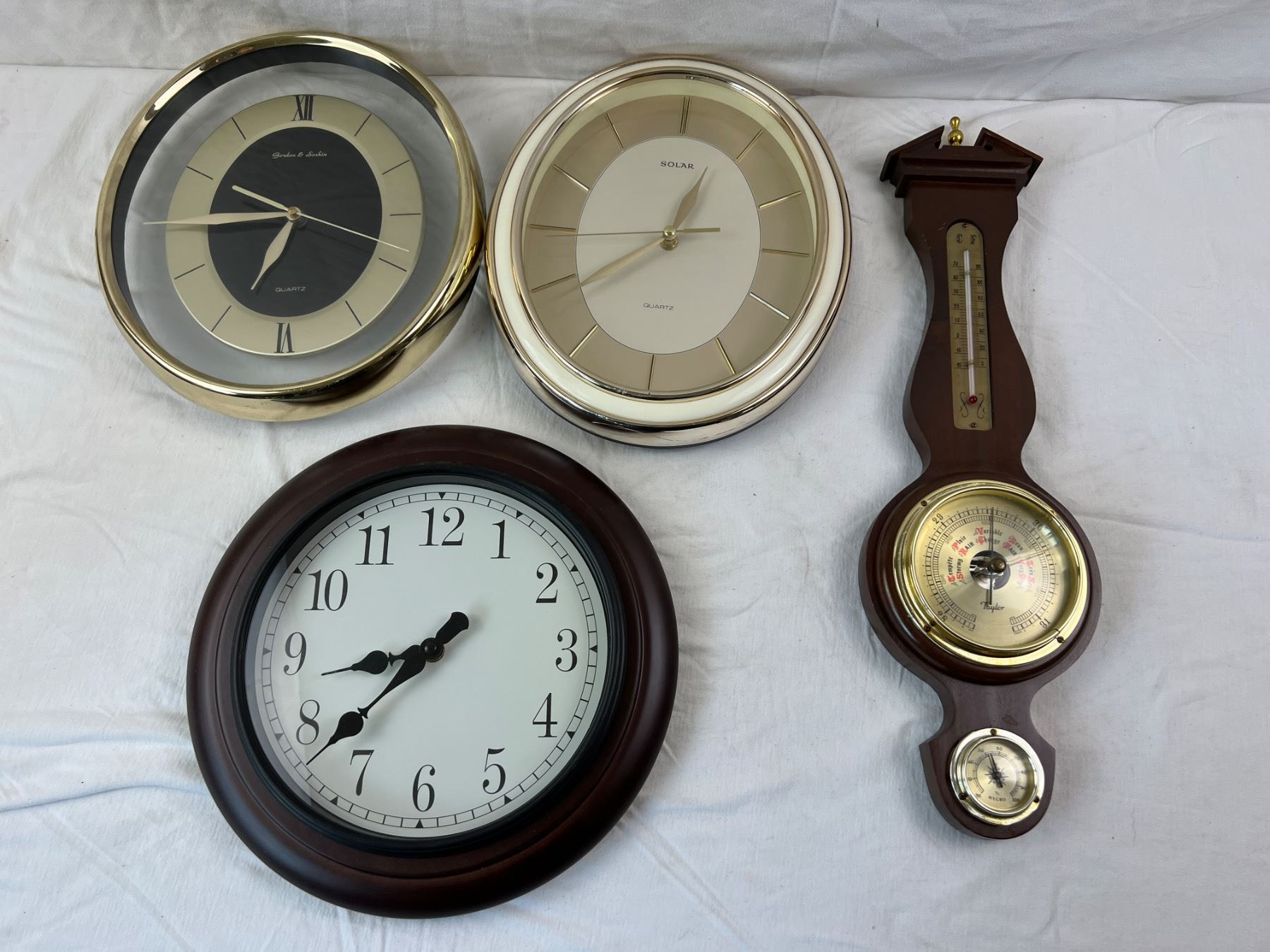 Includes a Taylor barometer (20"L x 5.5"W), Three wall clocks (may need replacement batteries)