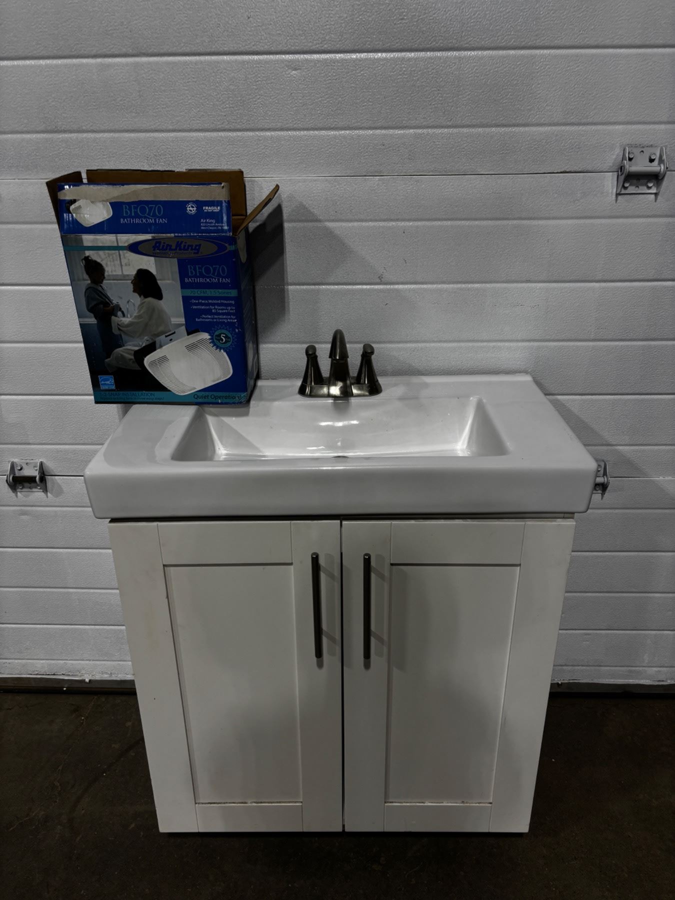Vanity with the sink is 30"L x 16"W x 34.5"H, Sink is removable, Includes Air King BFQ70 bathroom fan (unknown working condition)