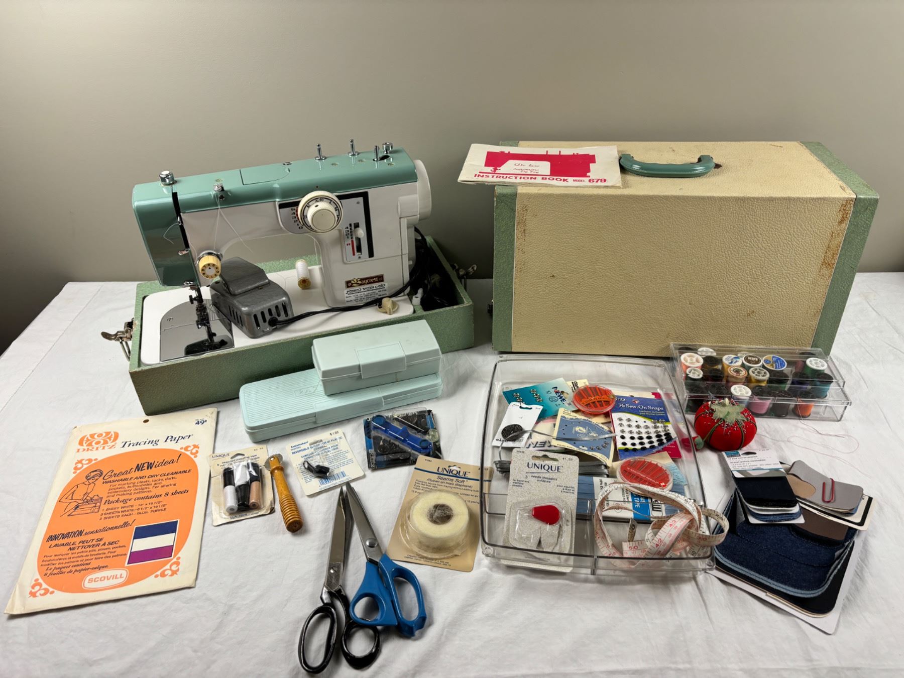 De Luxe Automatic Zig Zag Model 679 (works), includes various threads, needles, patches, etc.