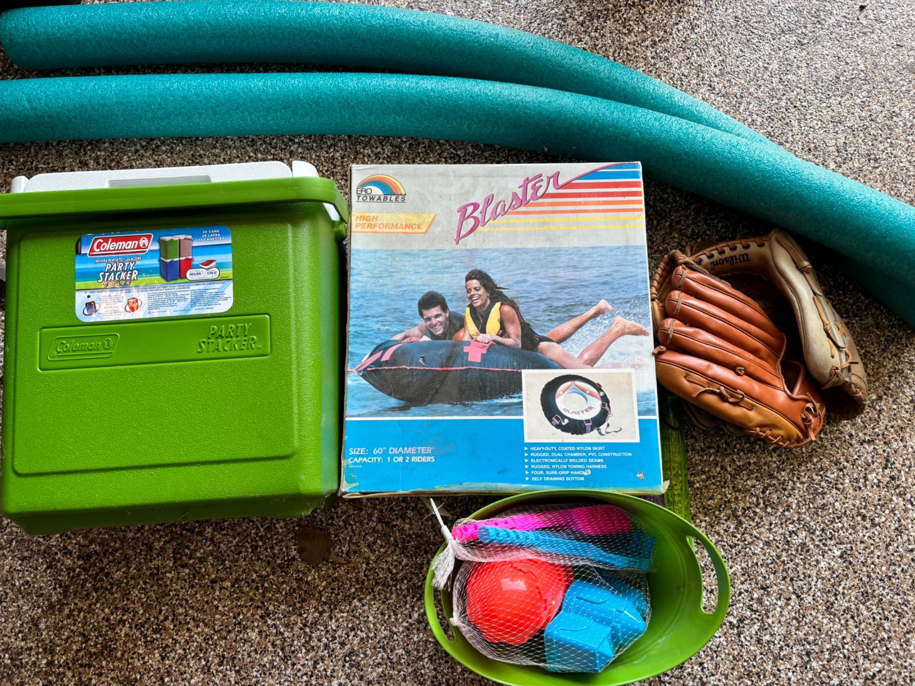 Includes Coleman cooler, 60" blaster tube, baseball gloves, and more