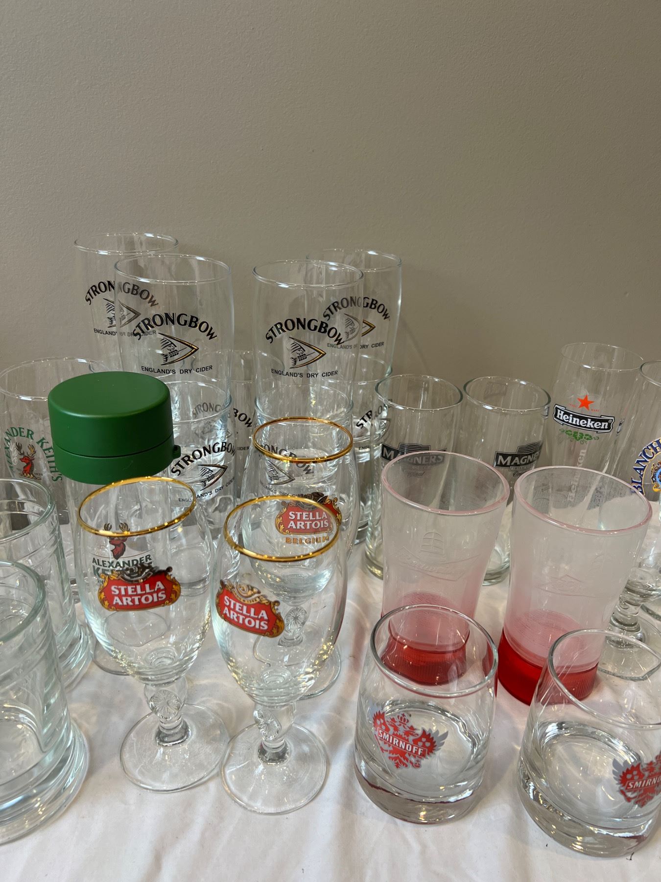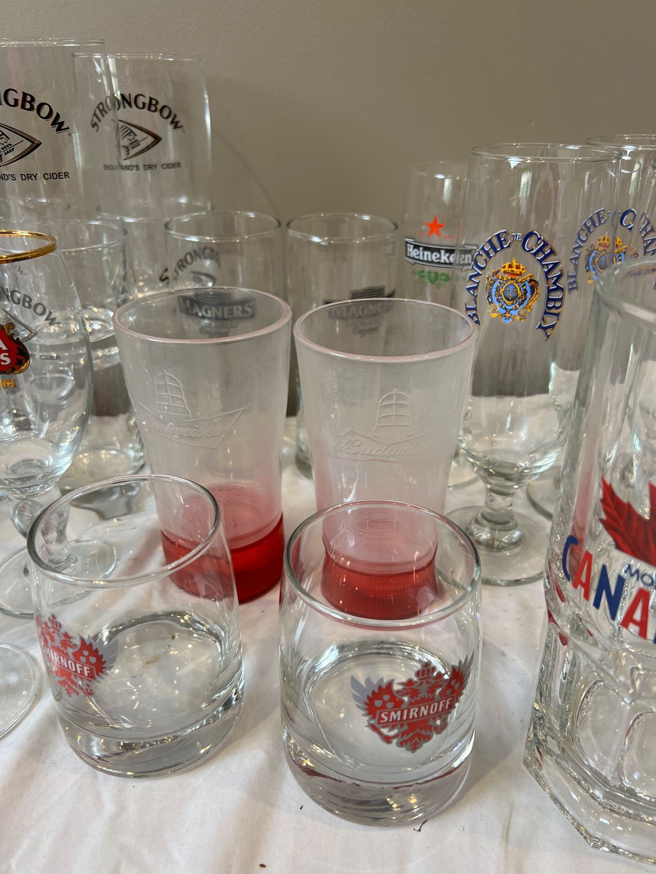 Includes a wide variety of glasses in varying shapes and styles and all featuring popular alcoholic beverage manufactures.