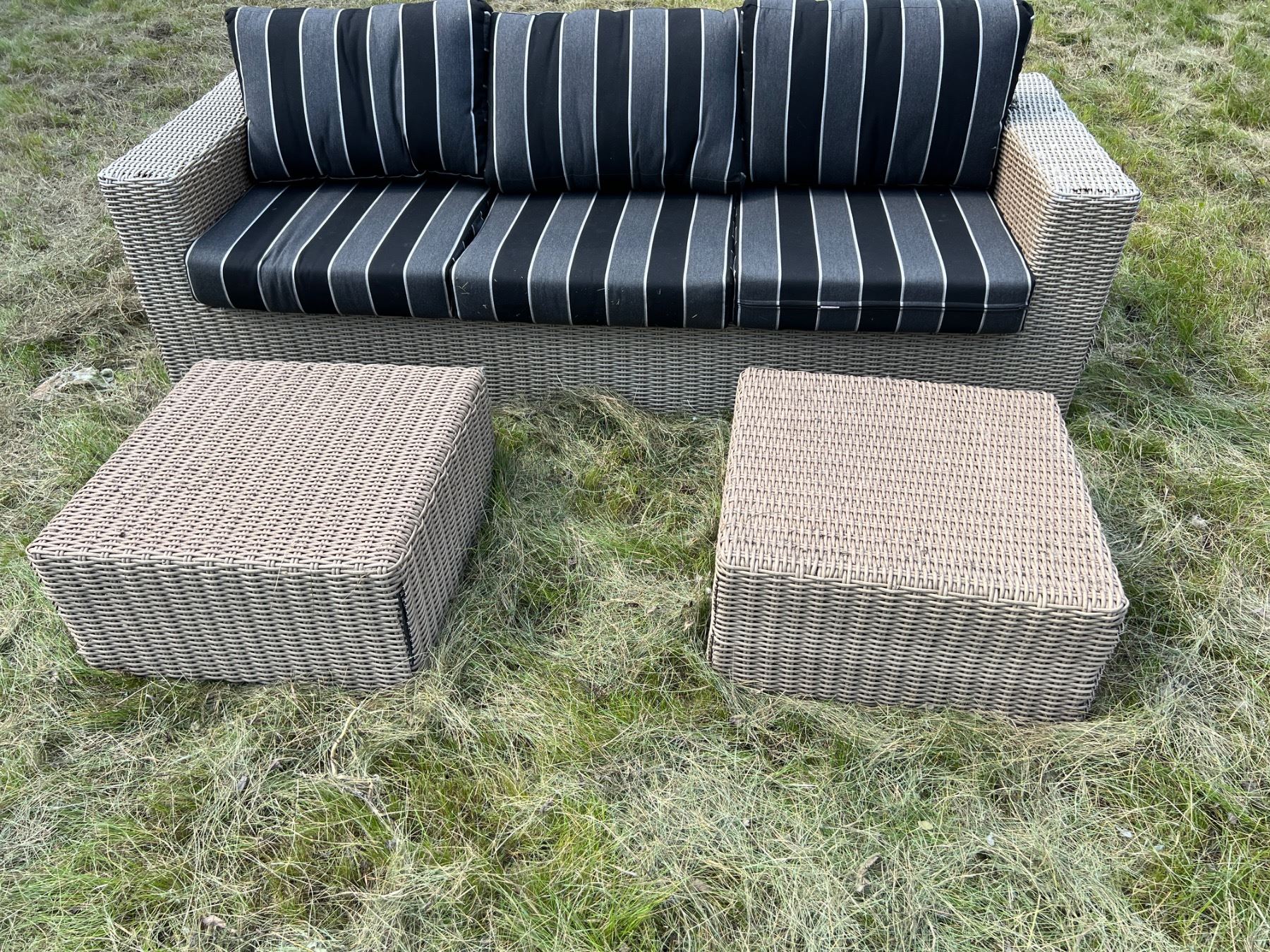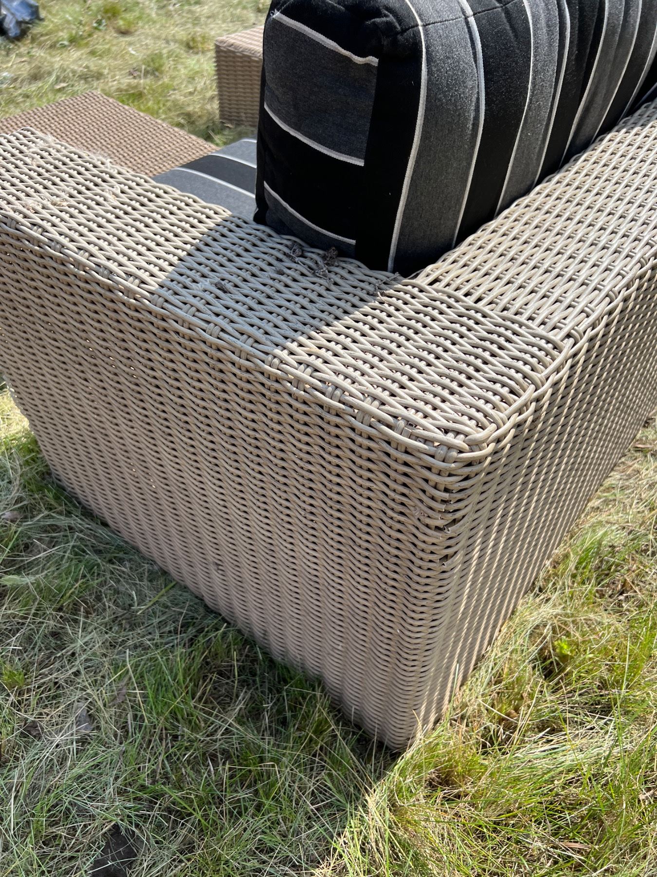 Ottoman has damage on the corners, Cushions are Sunbrella branded, Couch is 90"L x 34"W x 25"H