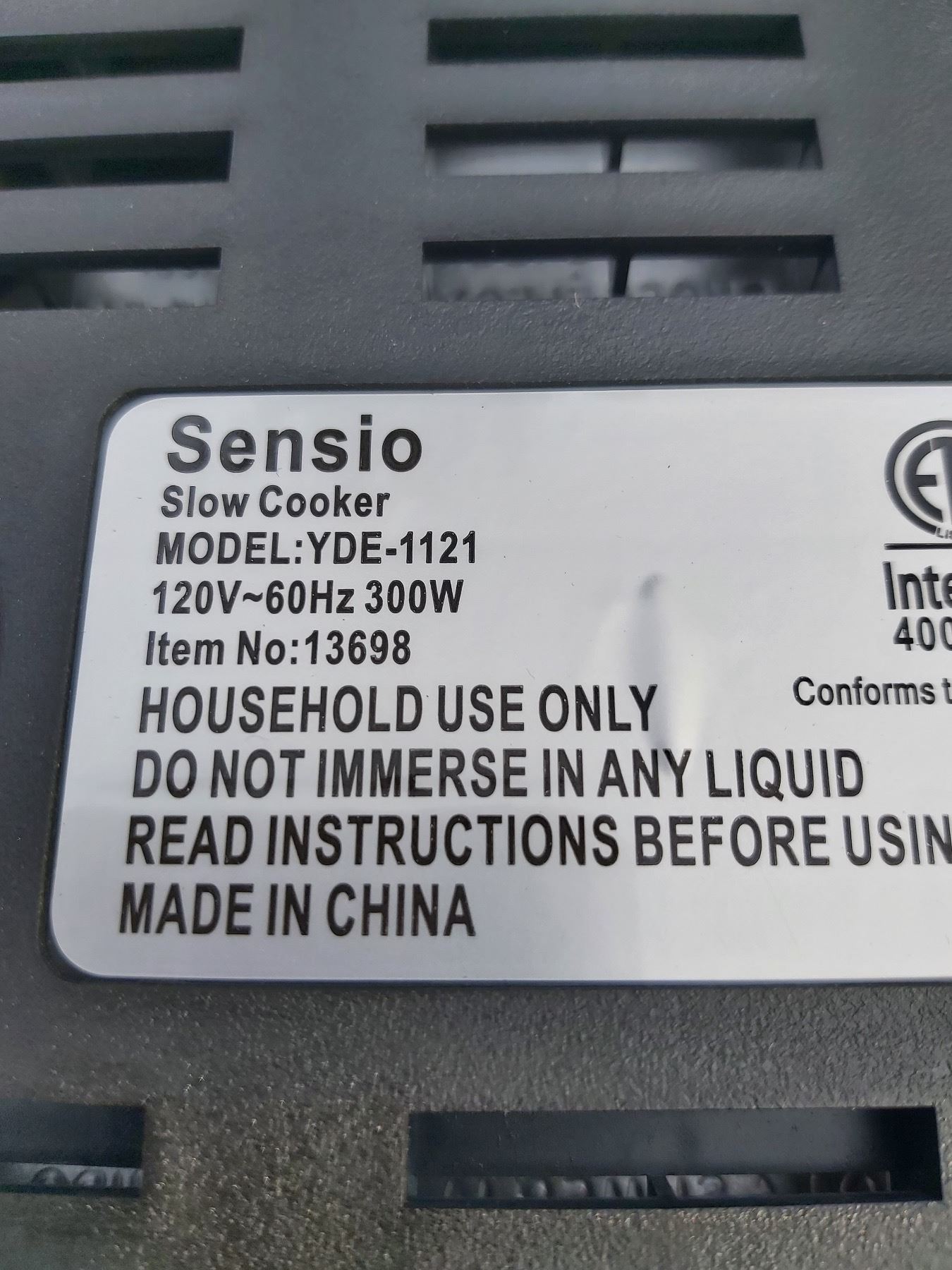 Turns on, has a dent in the corner, Model No. YDE-1121