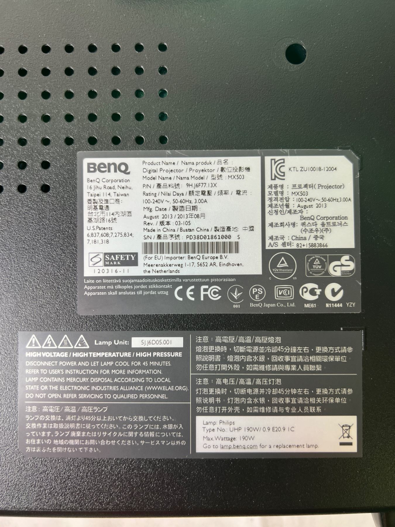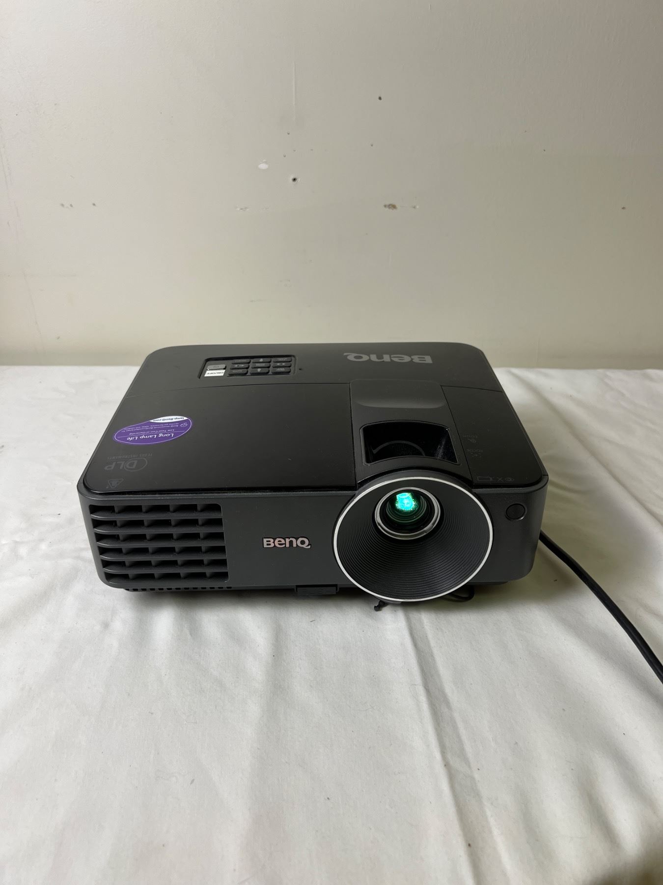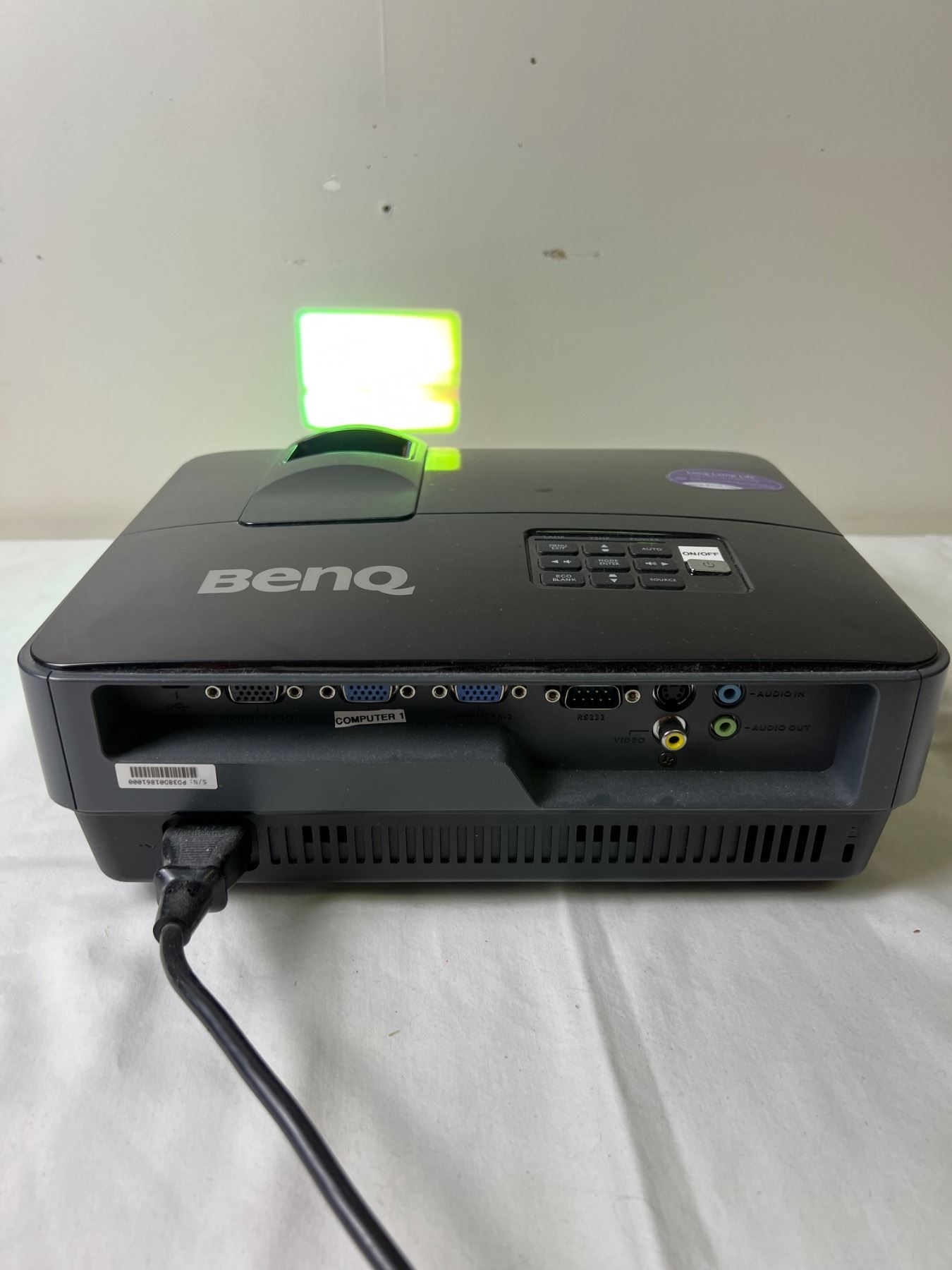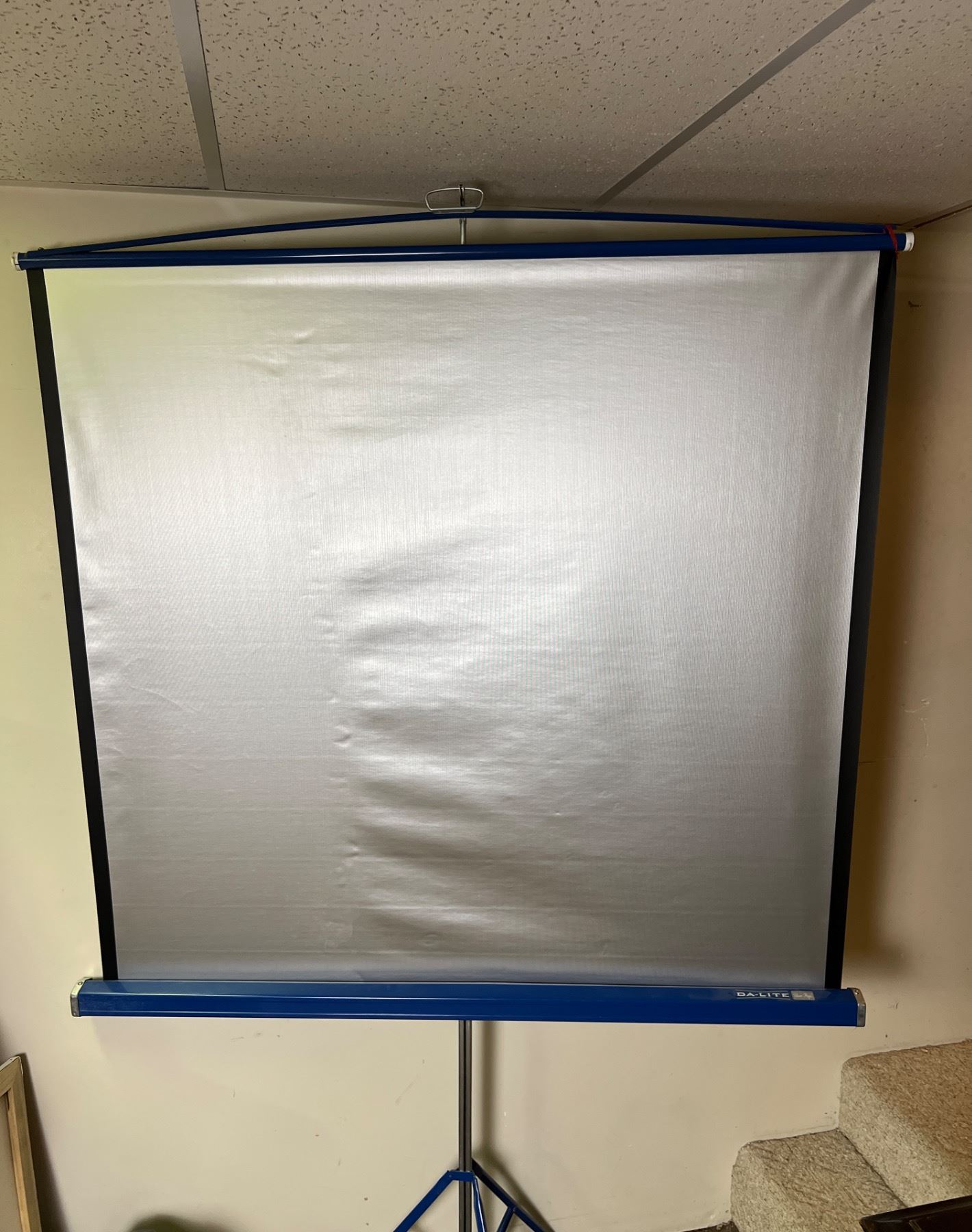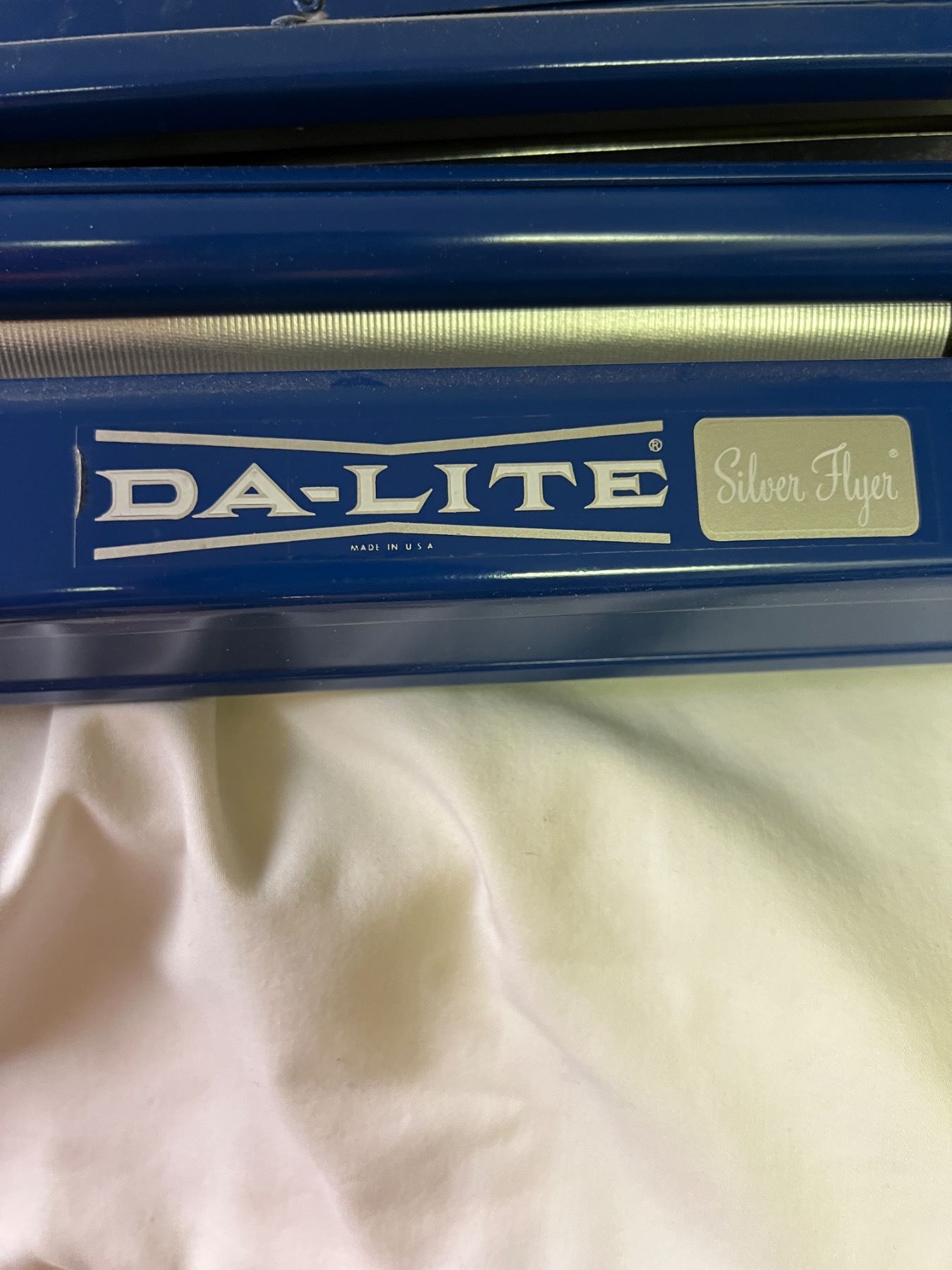 Powers on. Screen measures 70" large. Screen is Da-Lite screen