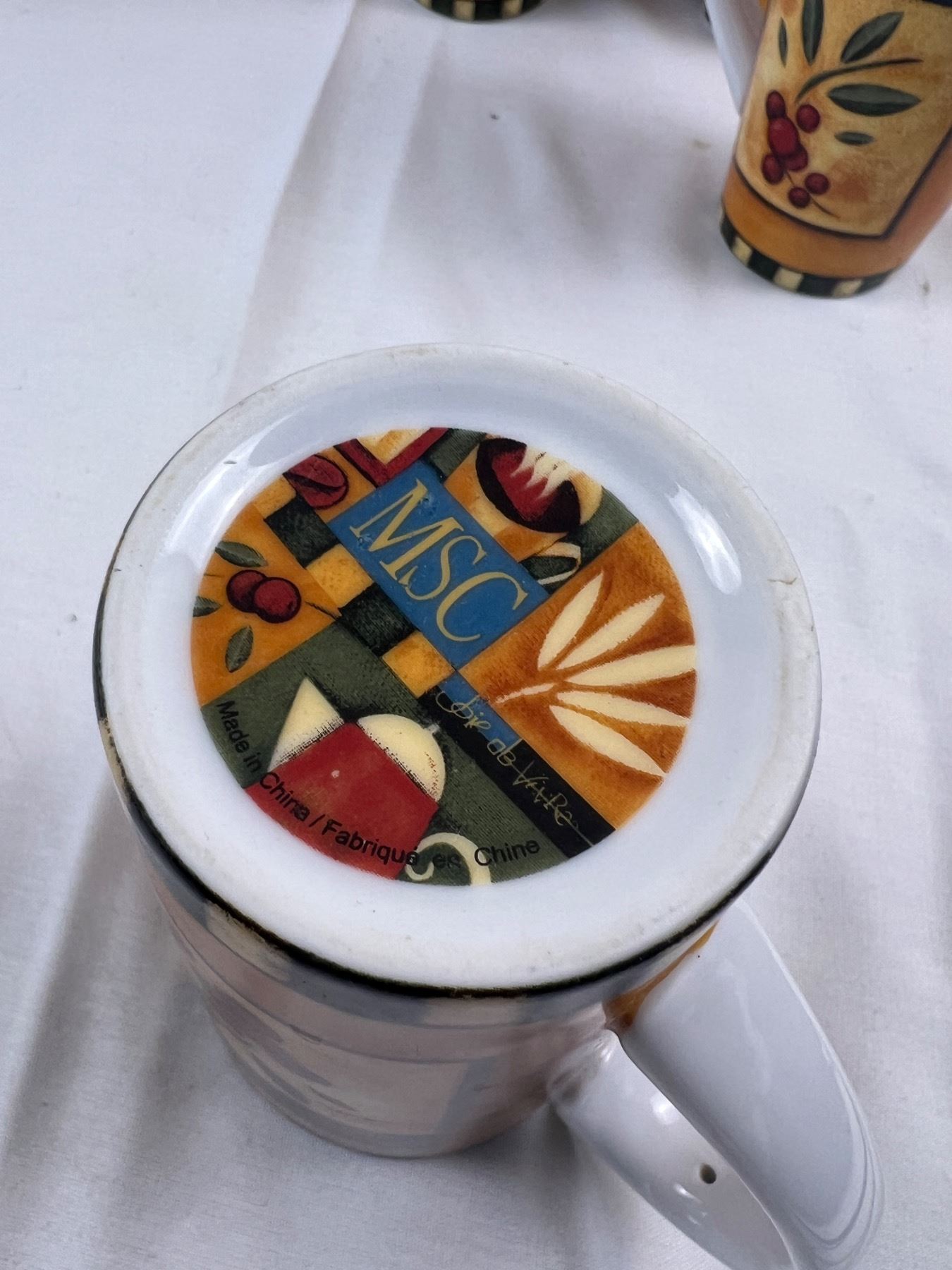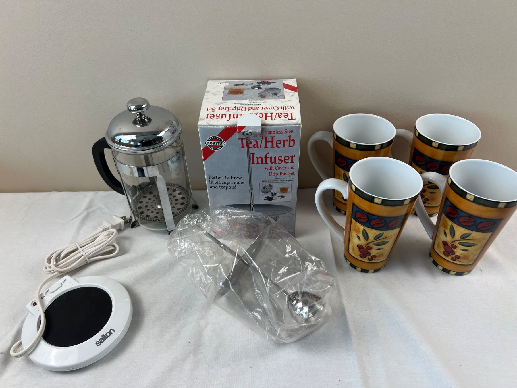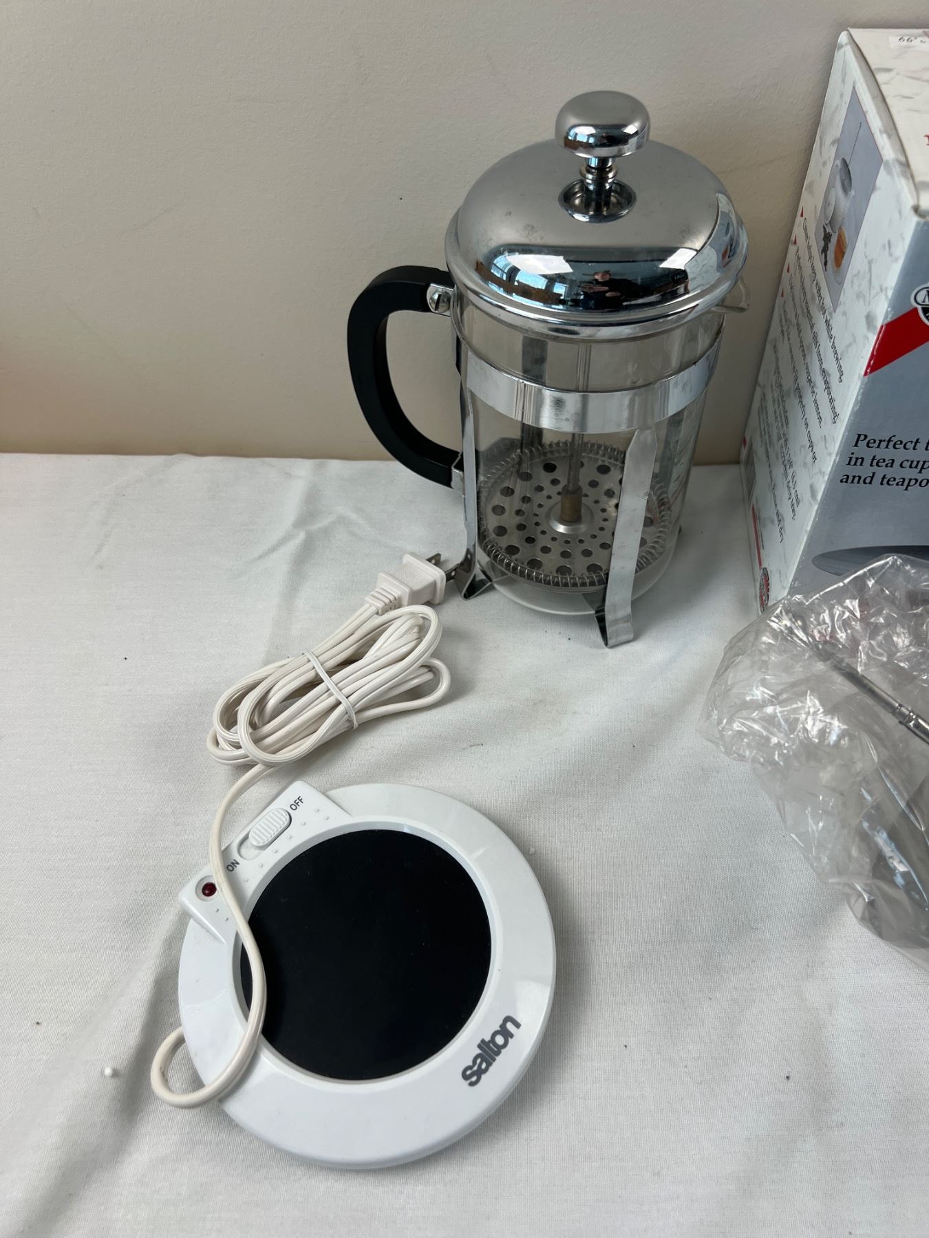 Includes four MSC mugs, Salton mug warmer (turns on), French press, and more