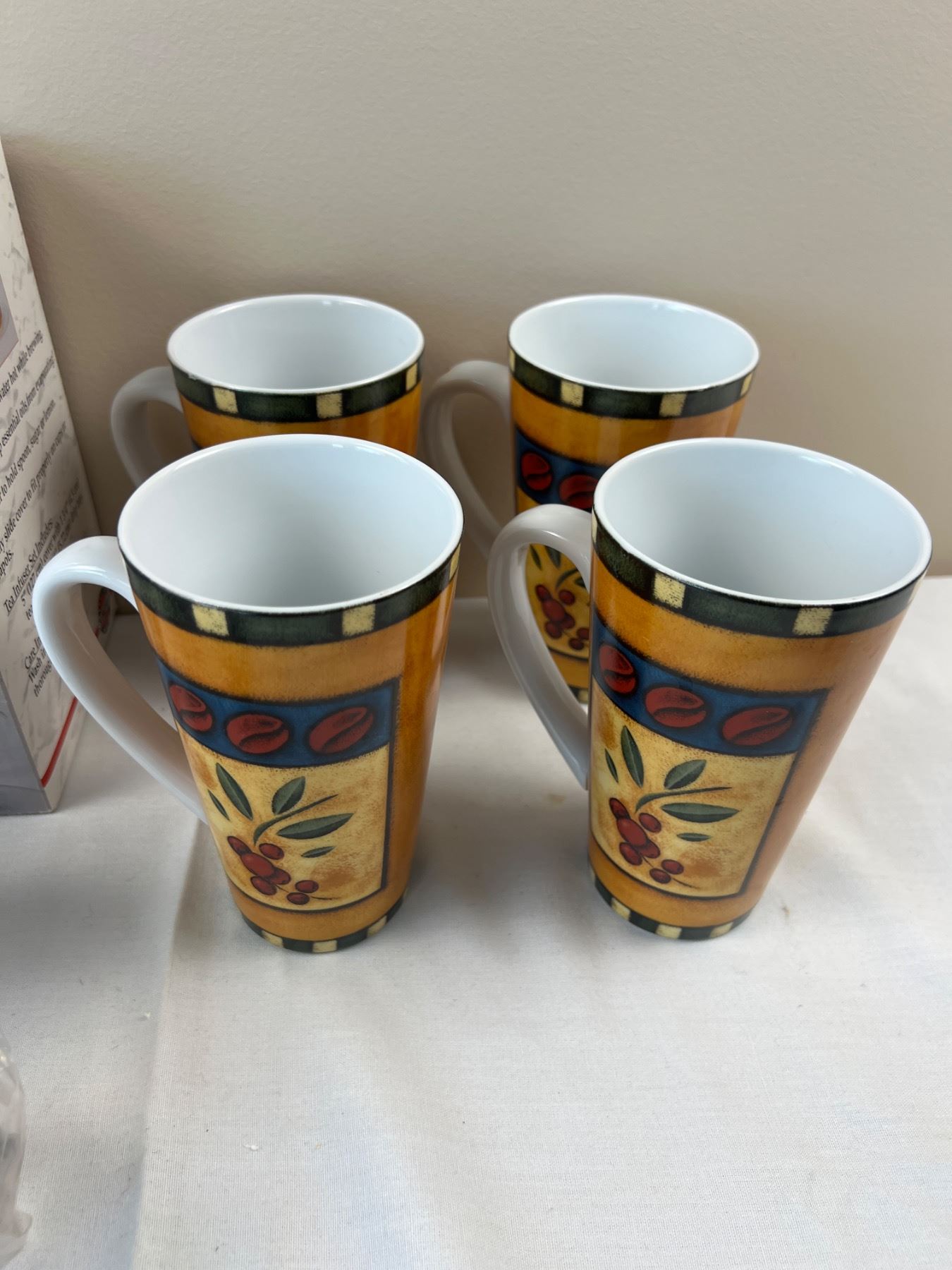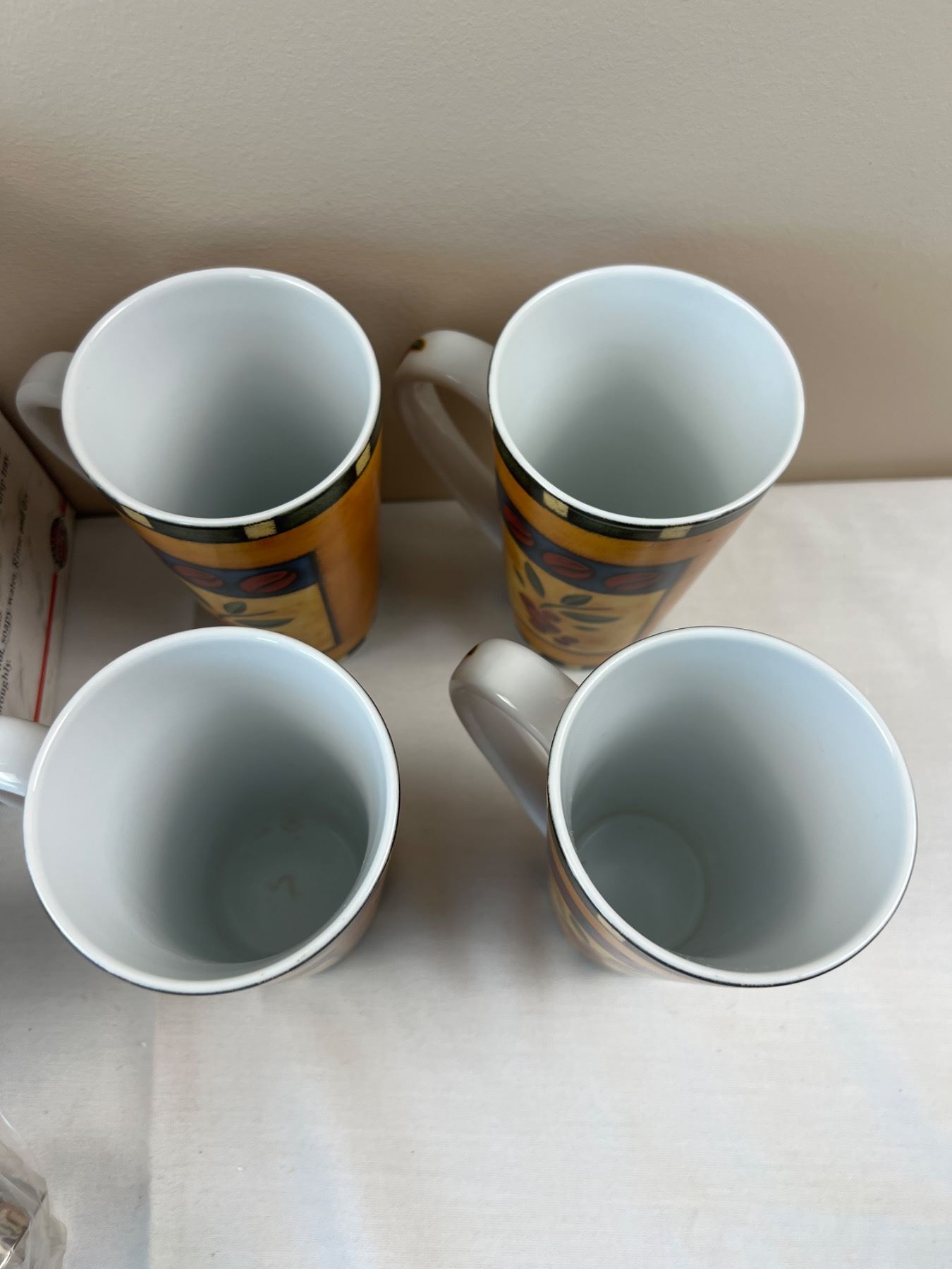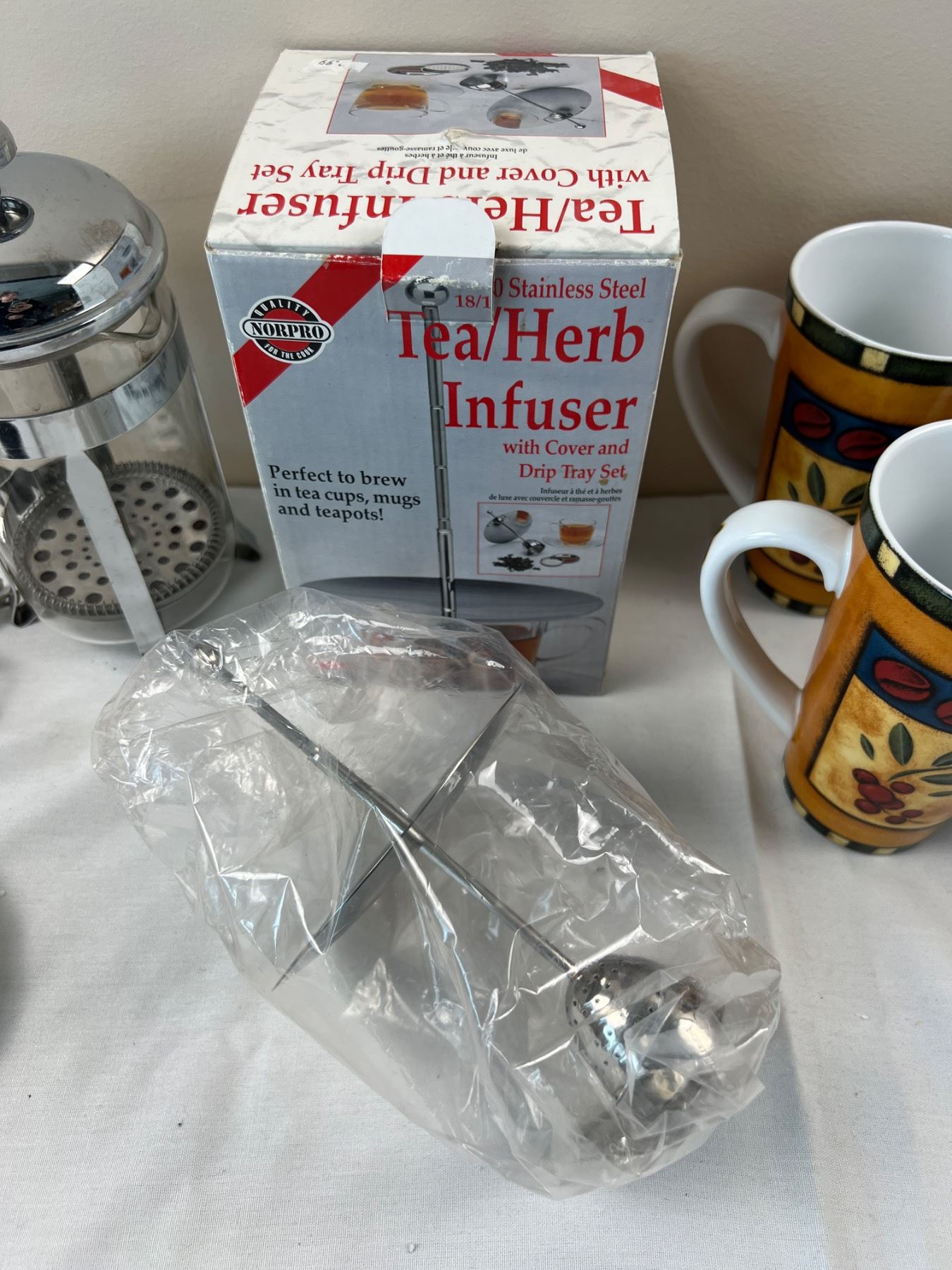 Includes four MSC mugs, Salton mug warmer (turns on), French press, and more