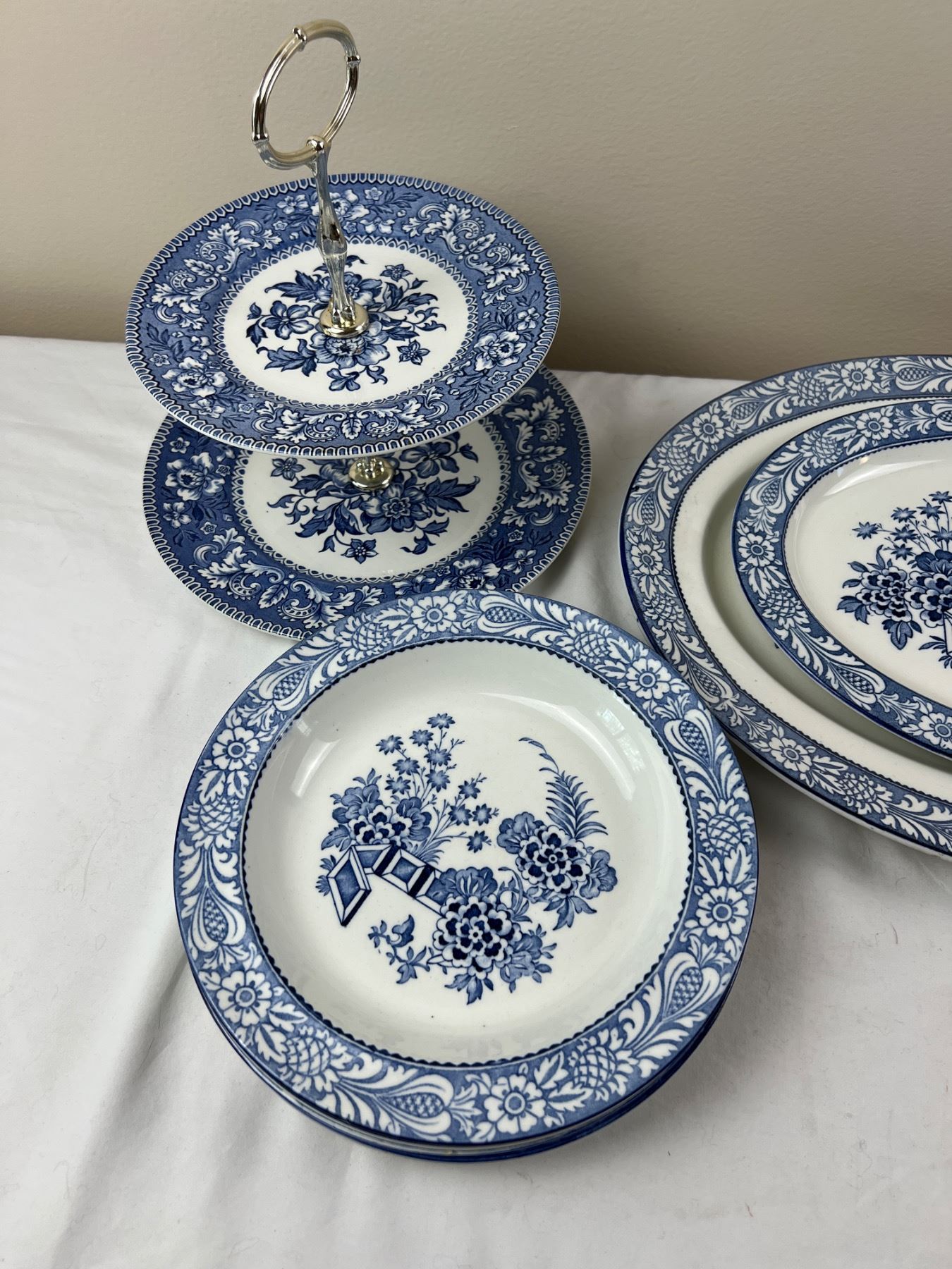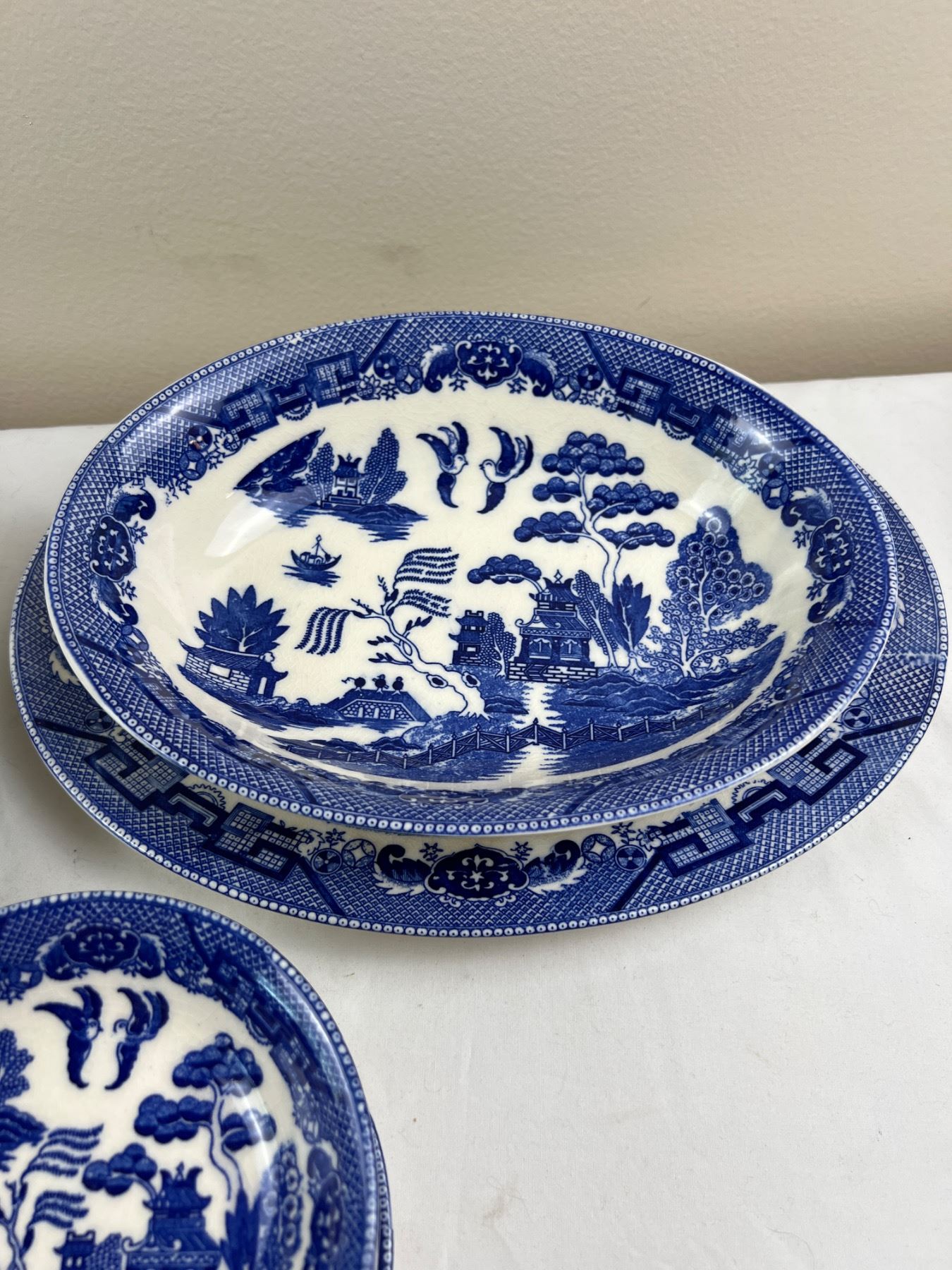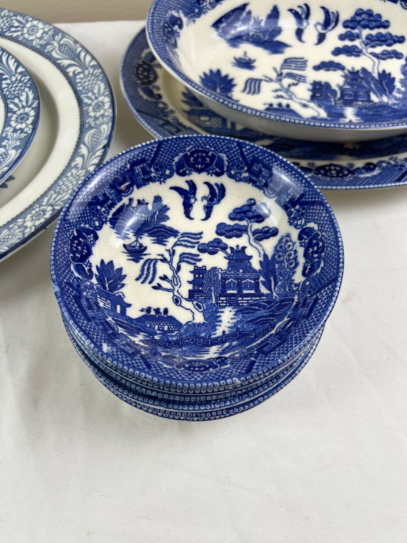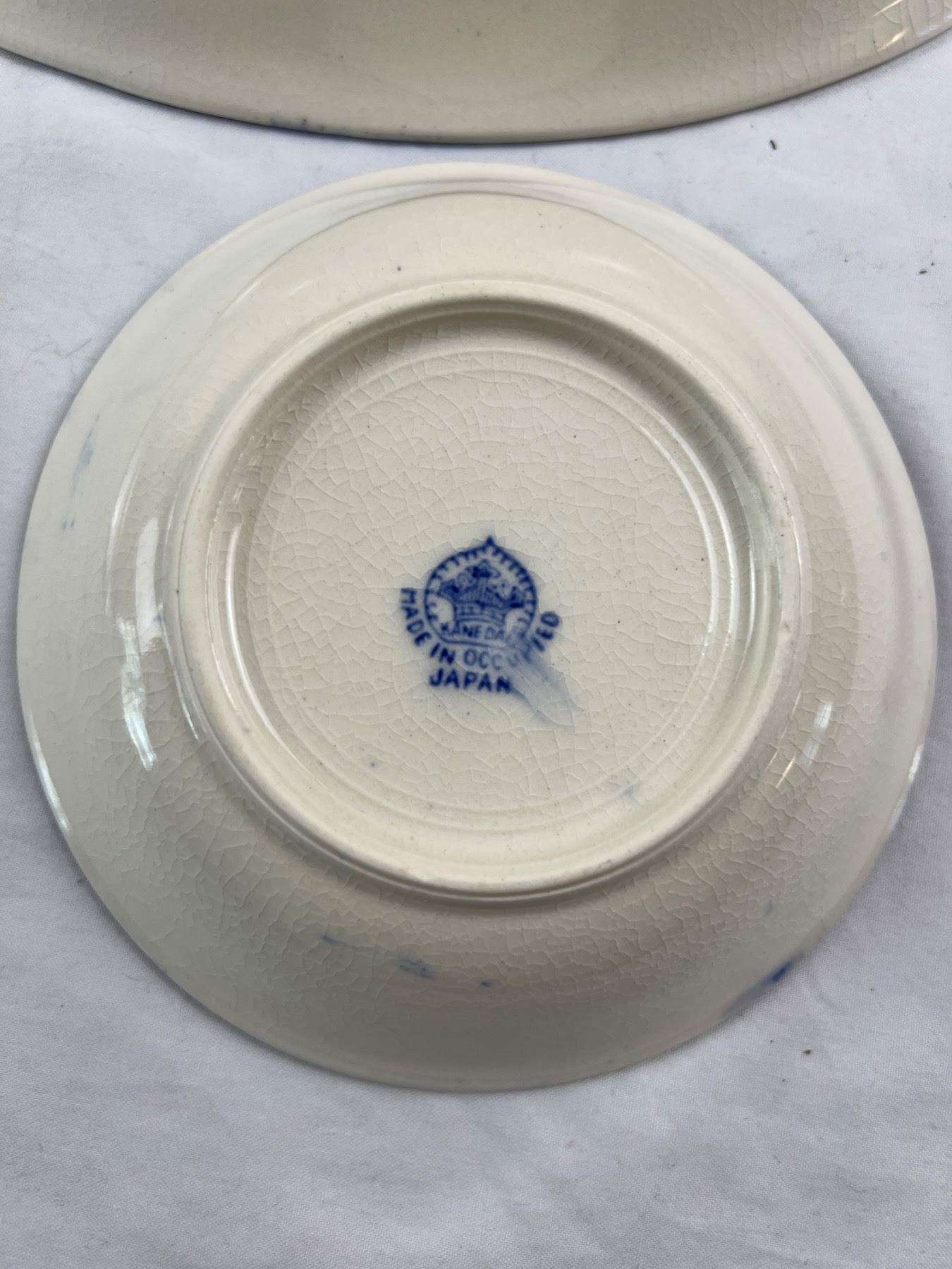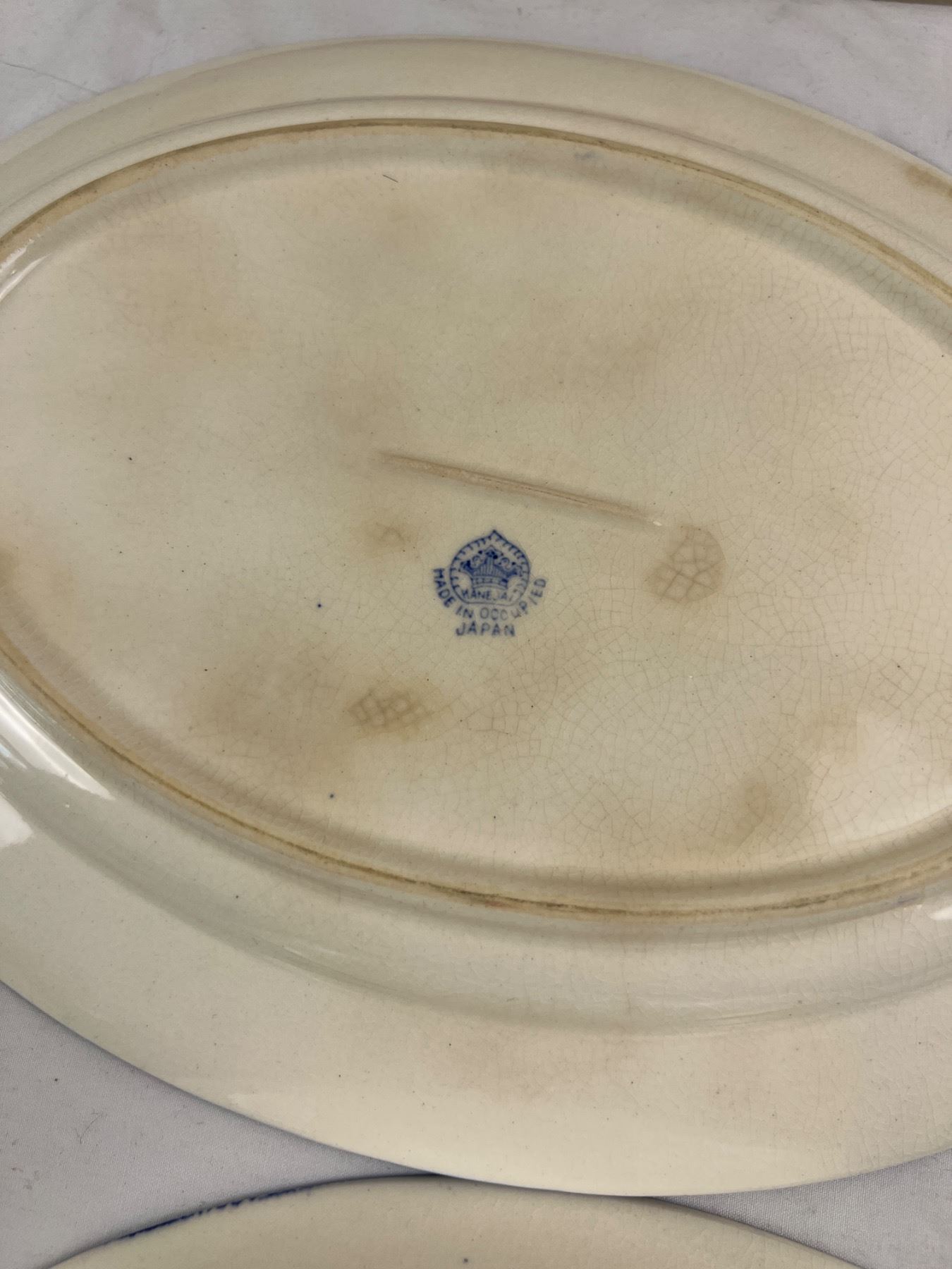 Largest platter is 17". All of the darker blue pieces on the right were made in occupied Japan which was between 1945-1952. Some discolouration to largest piece of Occupied China