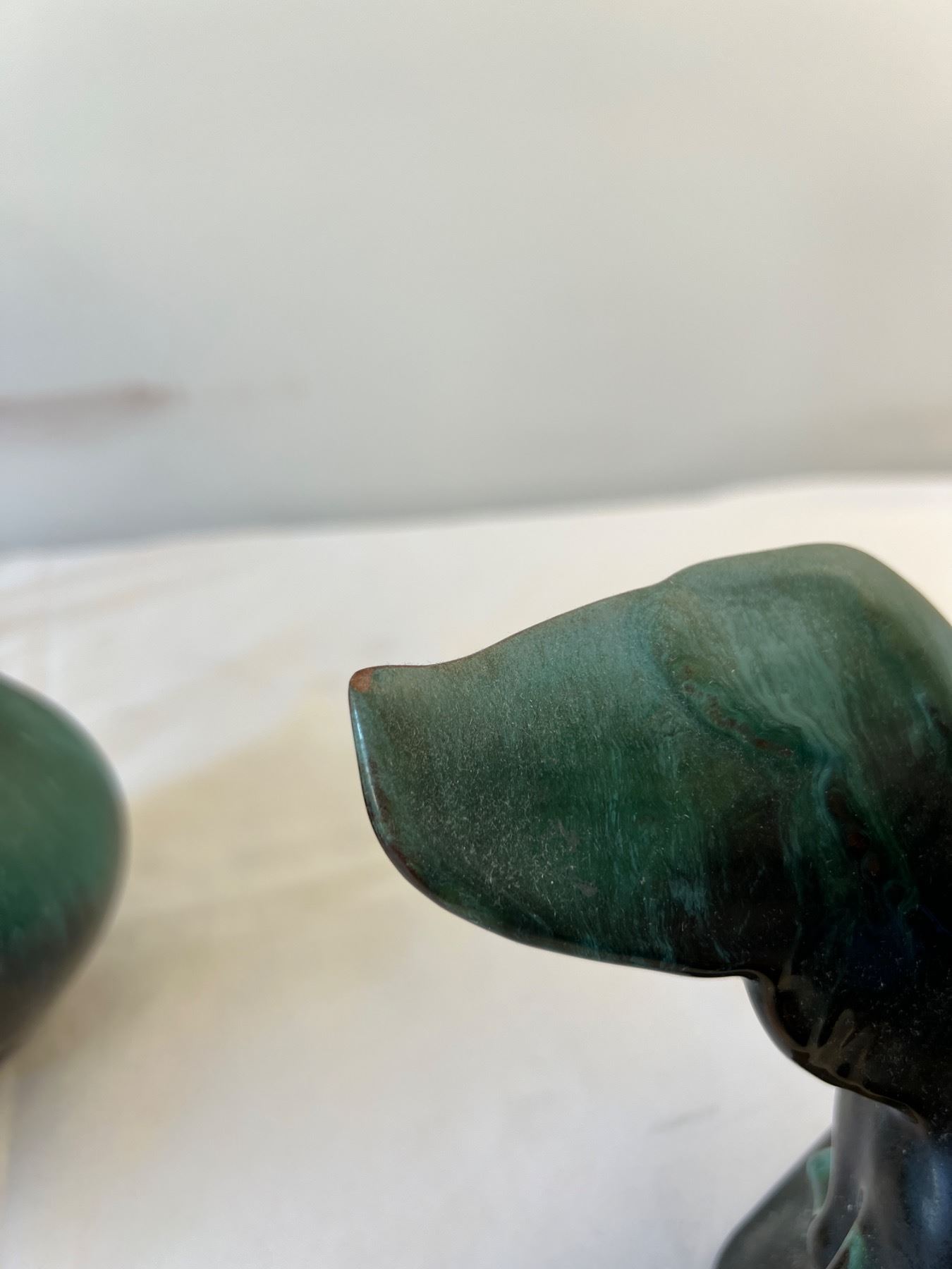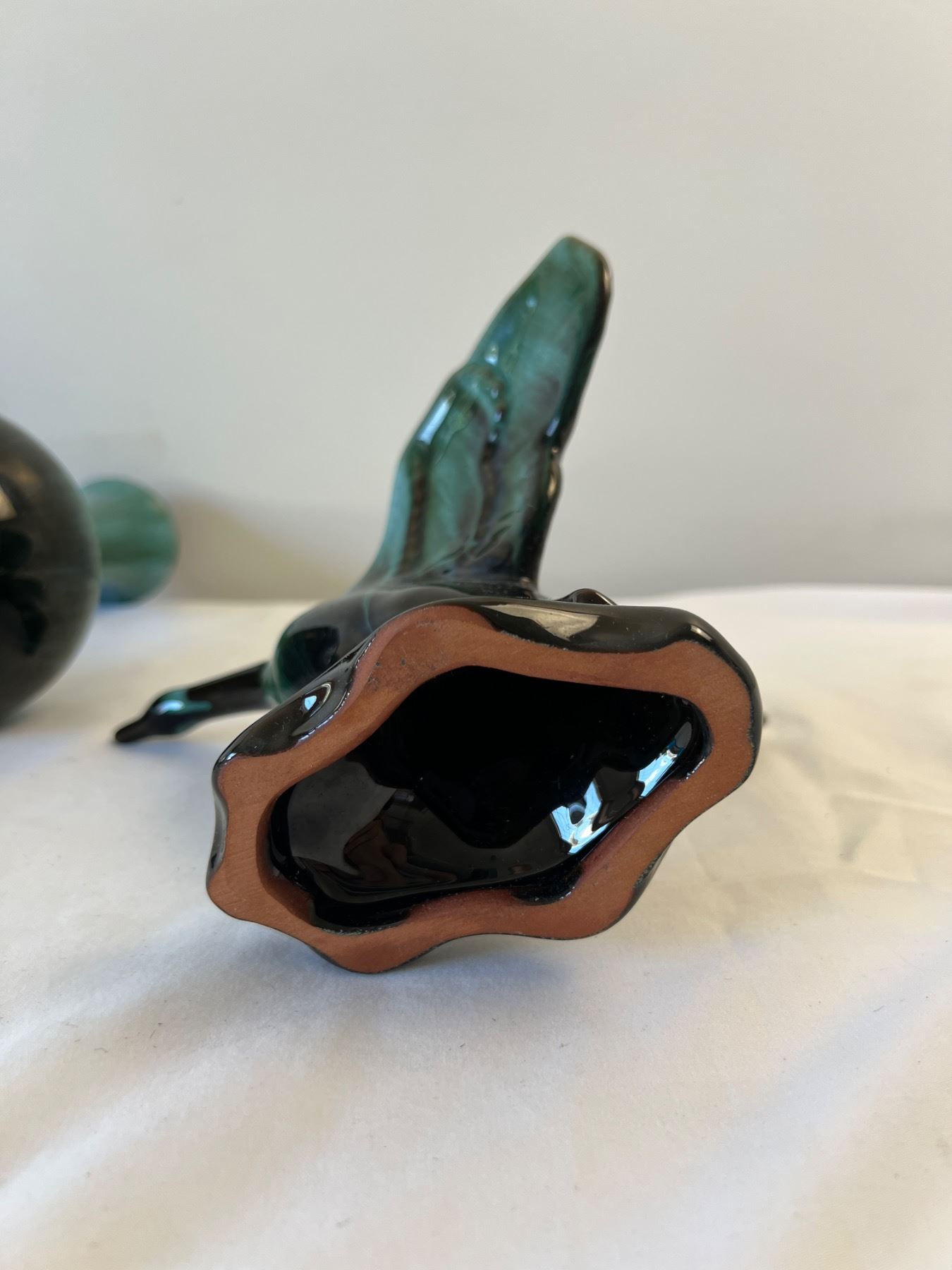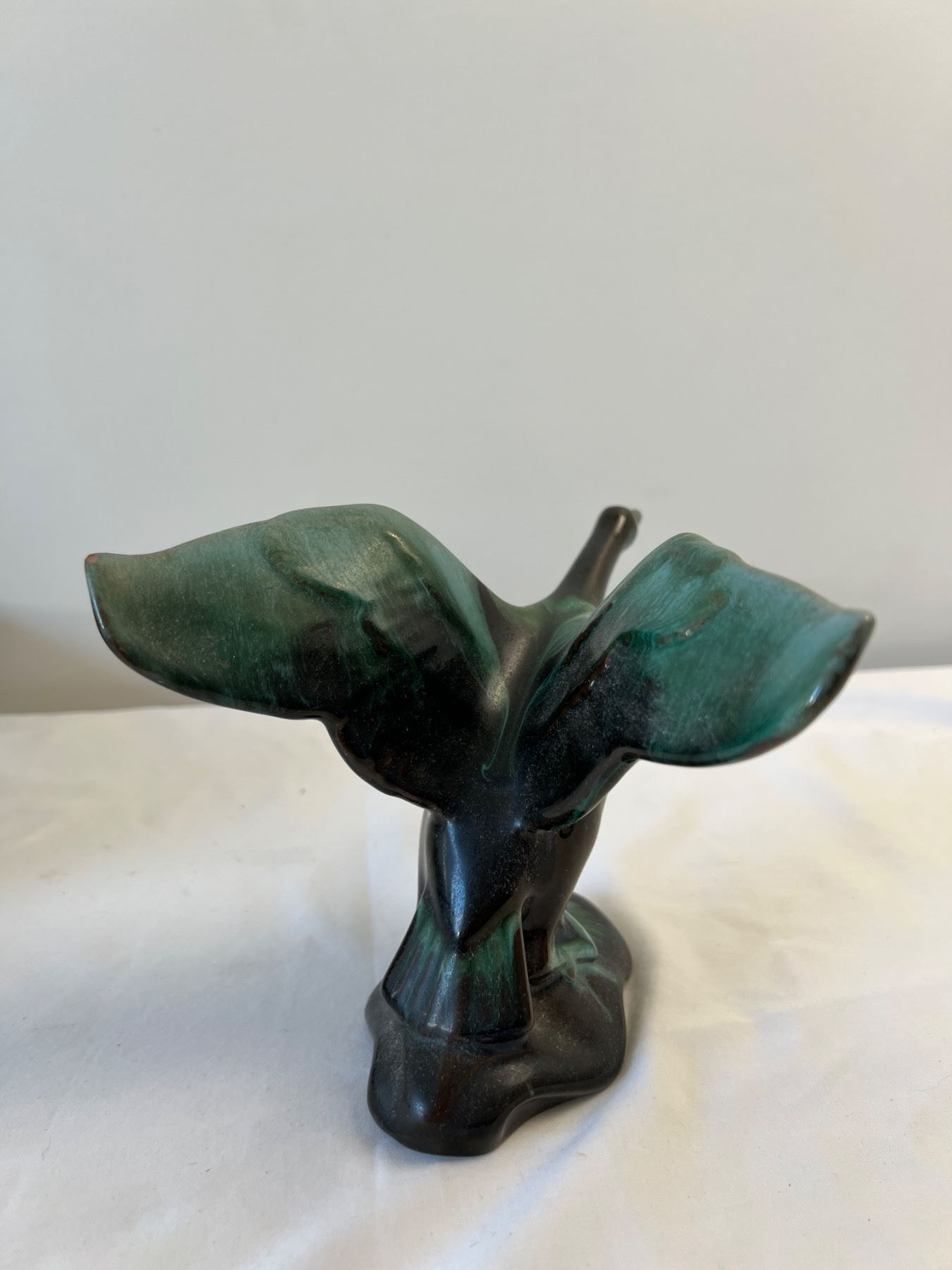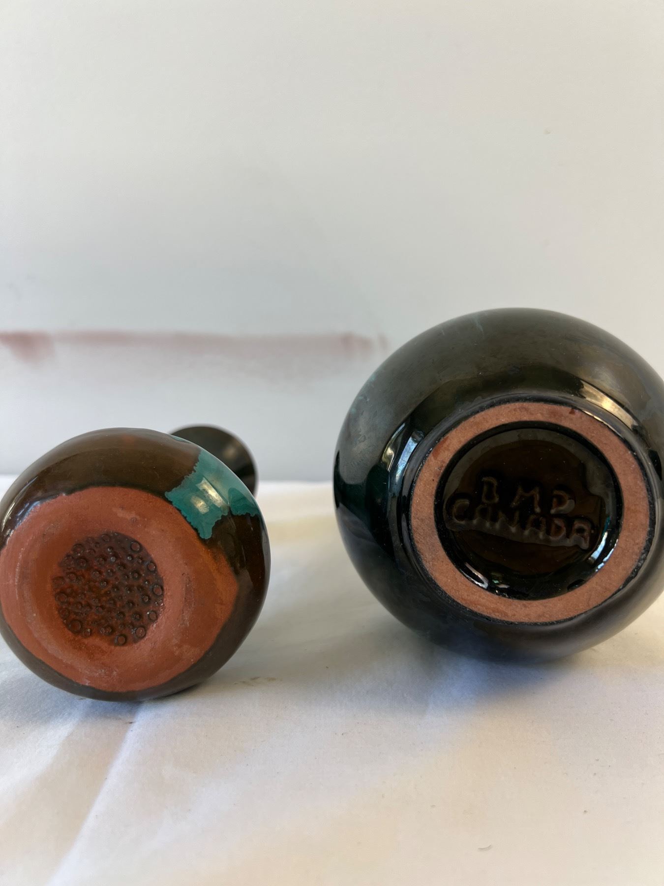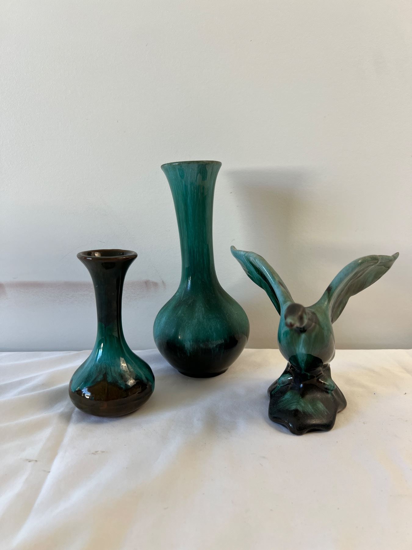 Large Vase has BMP stamp, other two do not but are both styled after BMP pottery. BMP vase measures 9" tall. Bird has small paint chip on wing