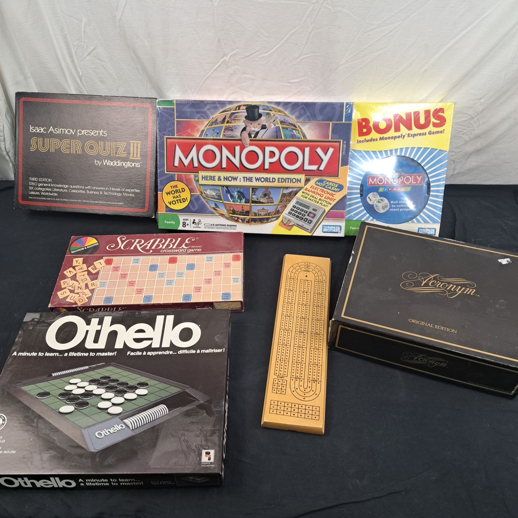 Includes The World Edition Monopoly, Othello, Acronym Scrabble & Cribbage Board & More