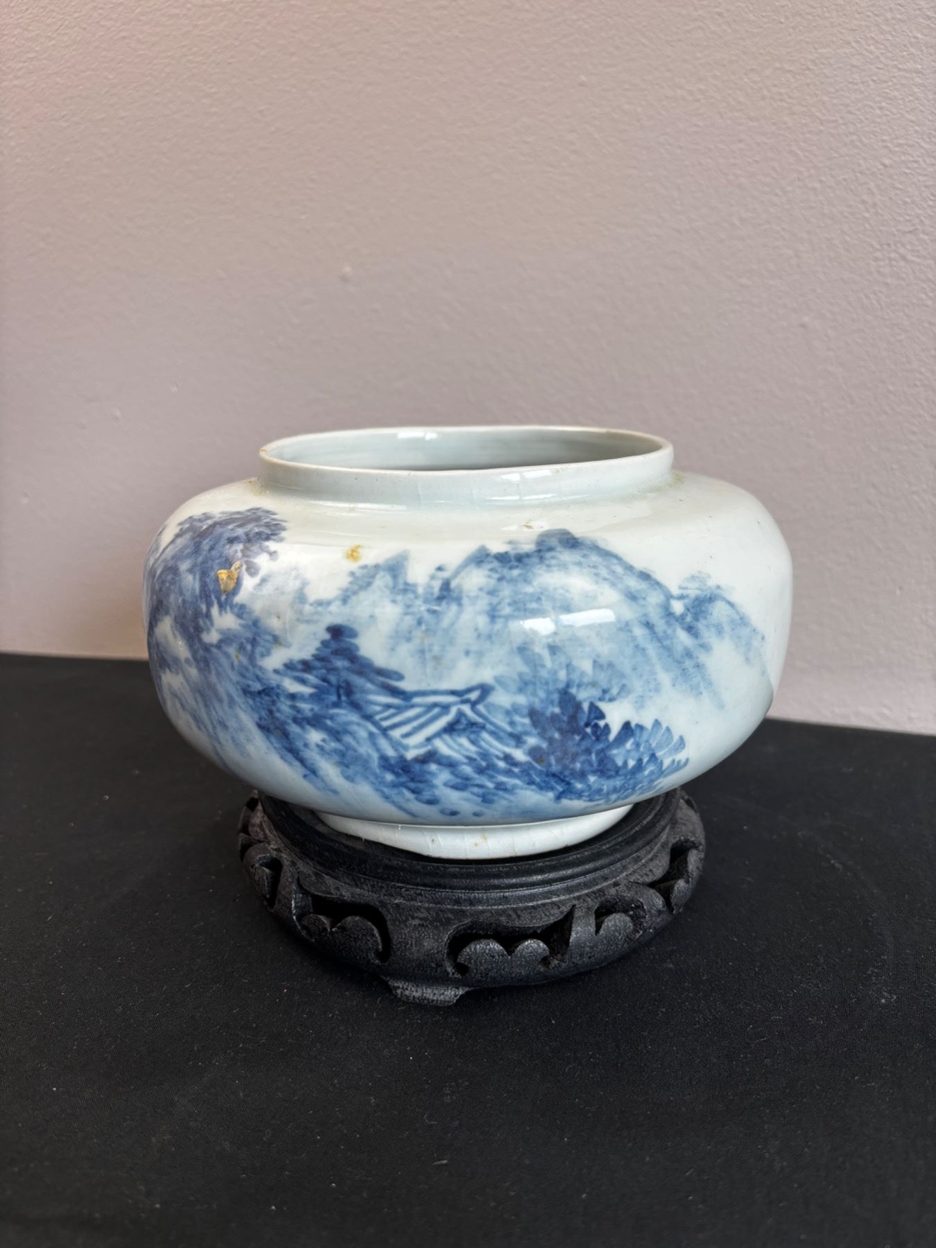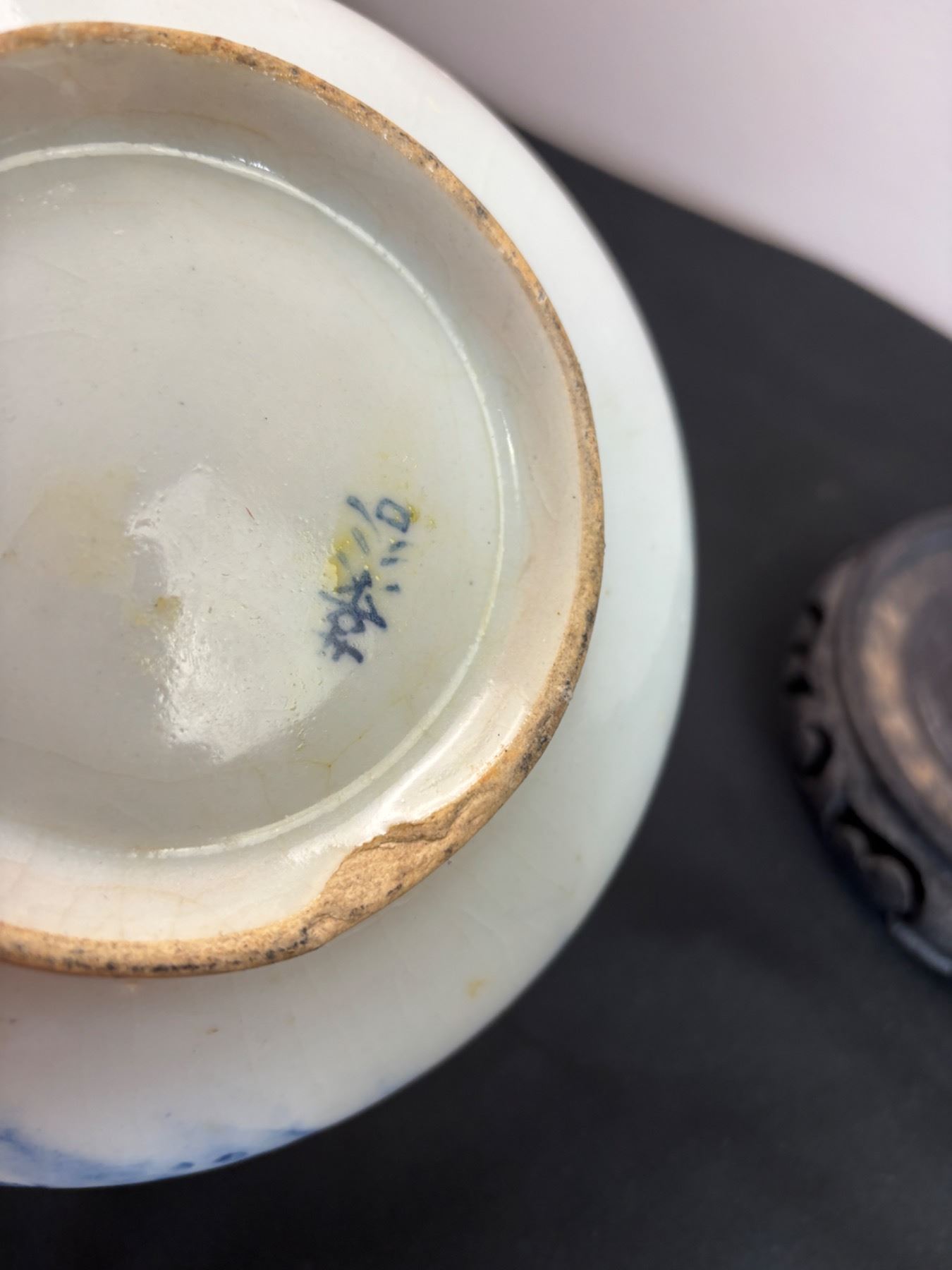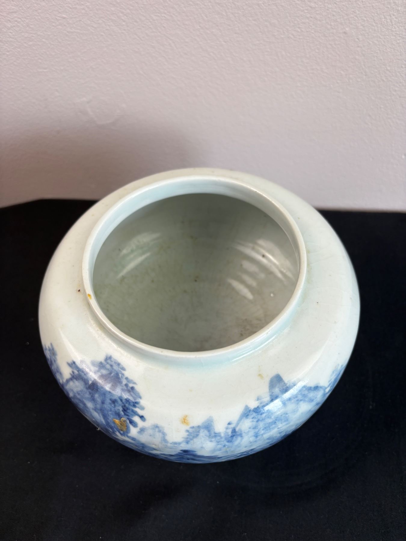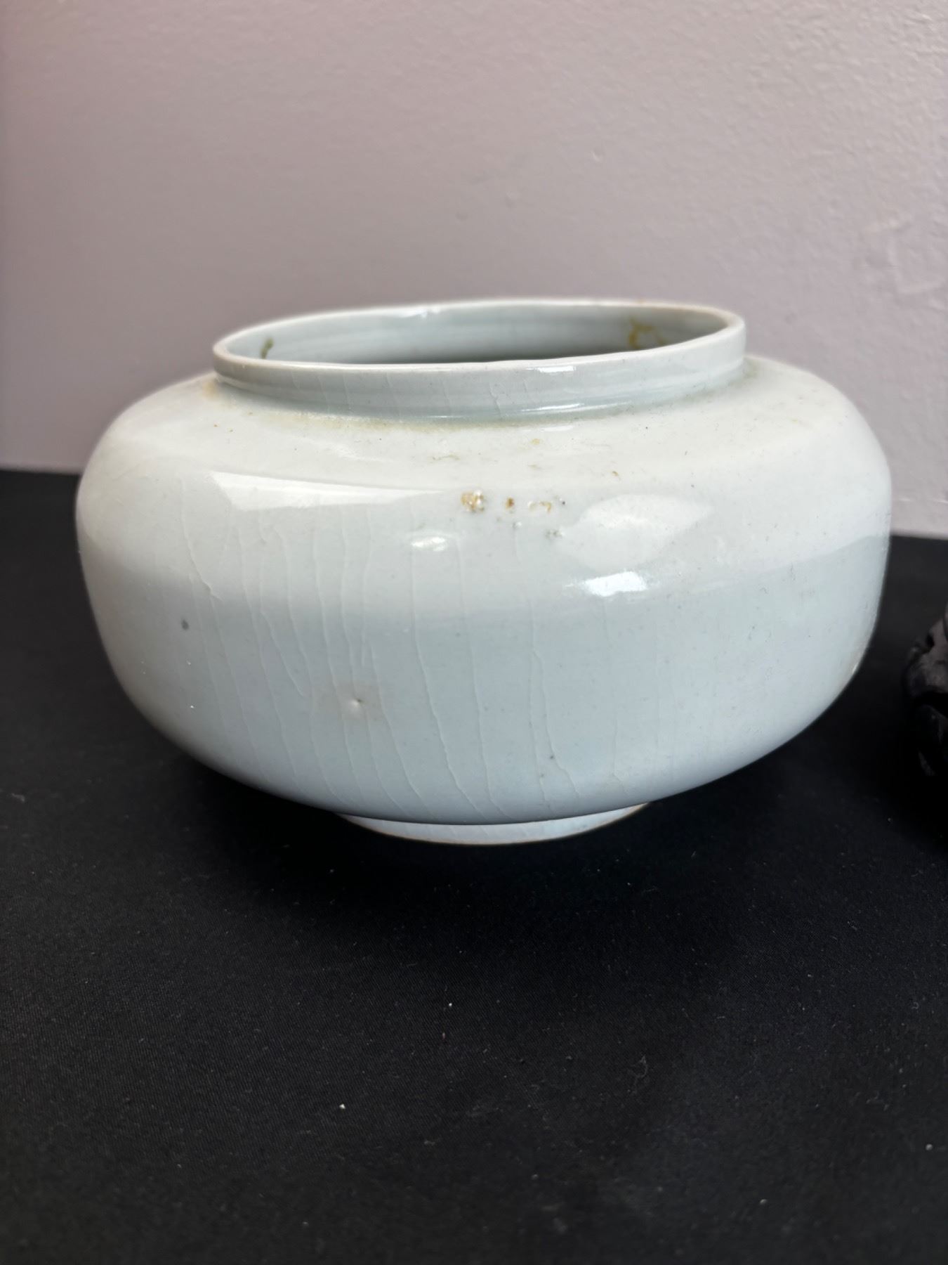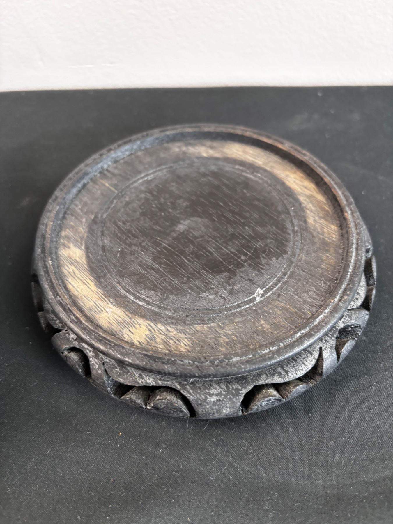 Approximately 7" in diameter and 4" tall with base. Some chips and cracks around surface.