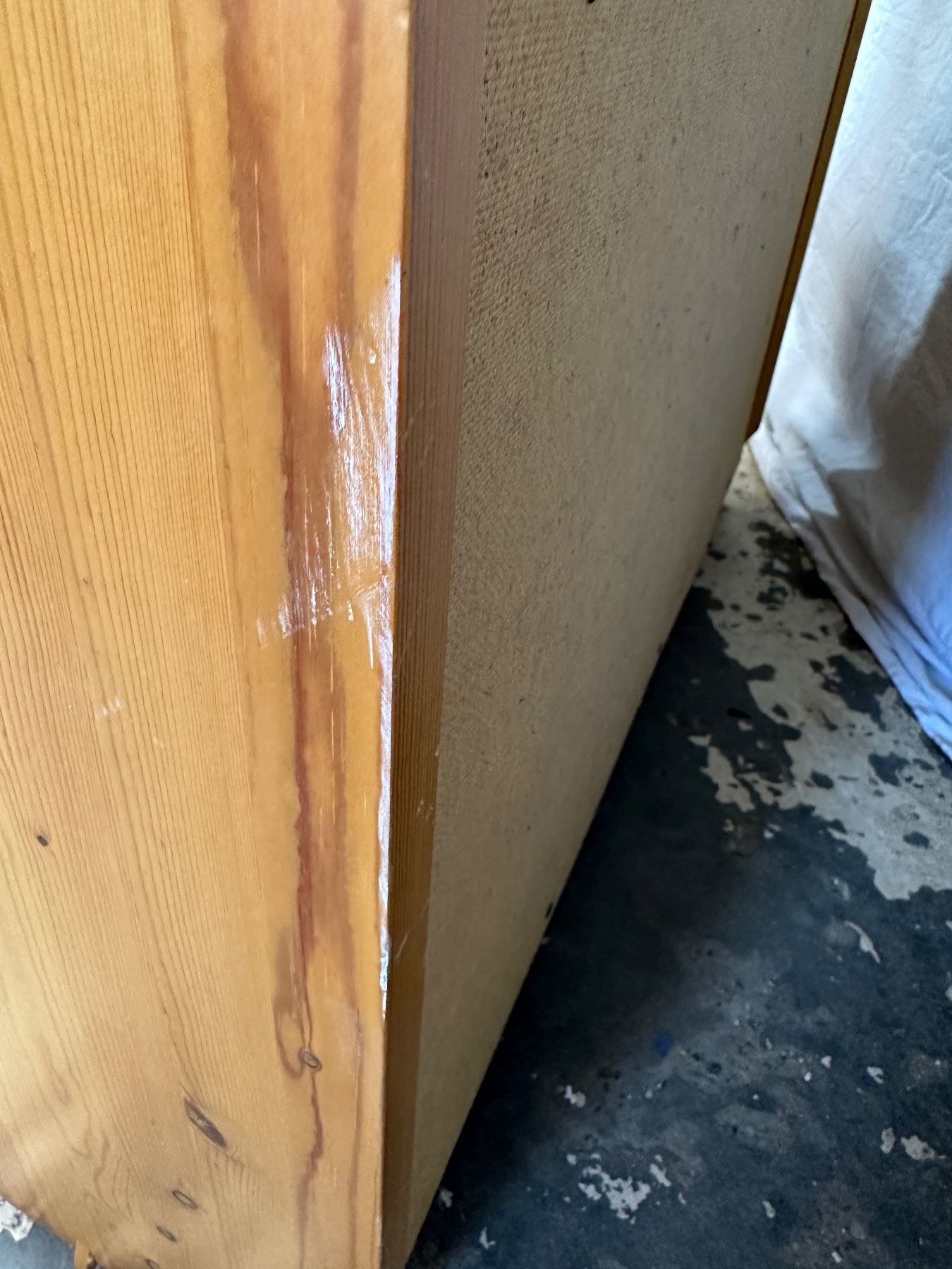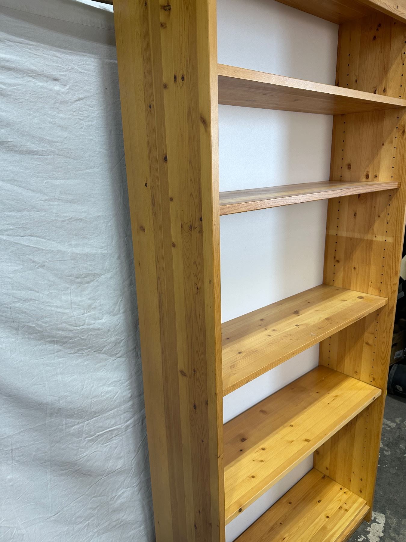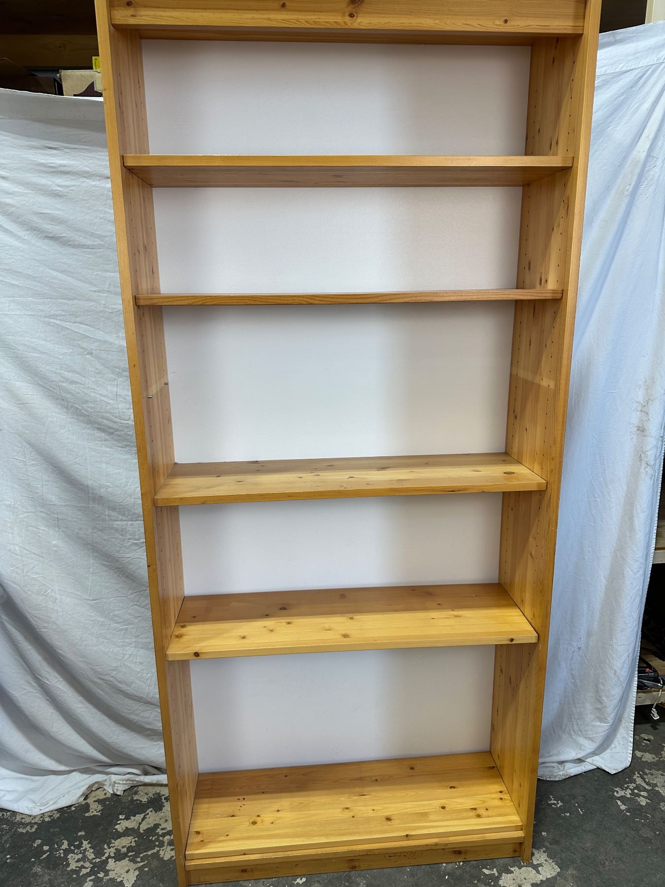 Adjustable shelfs - 36" wide x 12 1/4" deep x 80" tall - has extra shelf - would need 4 pegs - has paint stain on side (can be removed)
