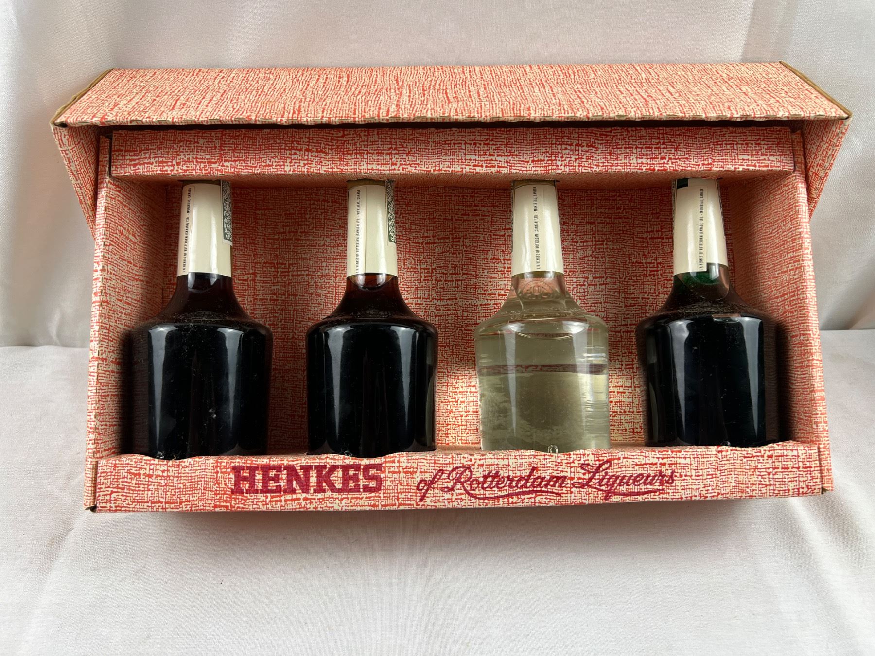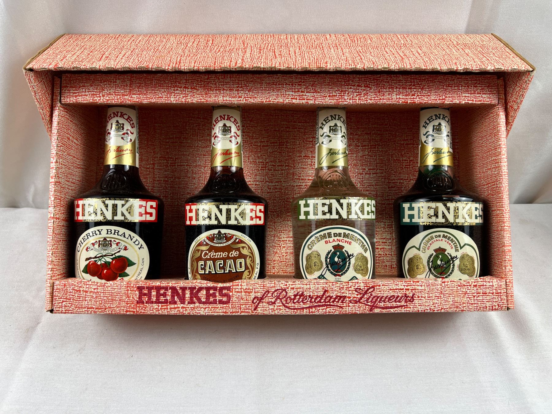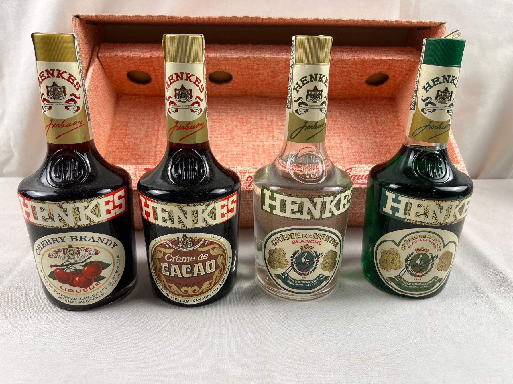 Cherry Brandy 28.5% alc/vol 12ozs; Creme de Cacao 25% alc/vol 12 ozs; Creme de Menthe Blanche 30% alc/vol 12 ozs; Creme de Menthe Verte 30% alc/vol 12 ozs; unopened