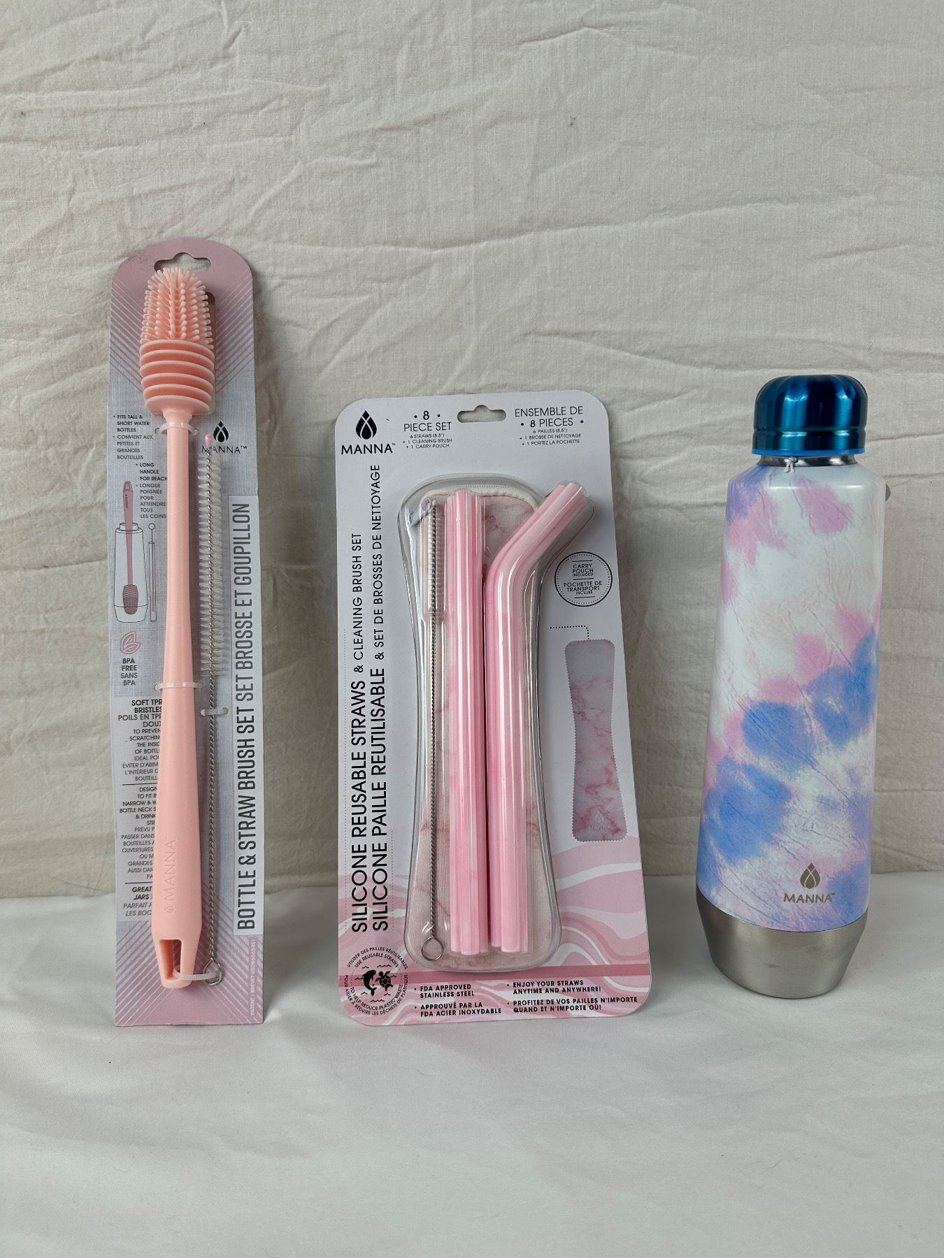 Includes brand new 18oz bottle, bottle & straw brush set and 8 piece set of silicone reusable straws & cleaning brush set