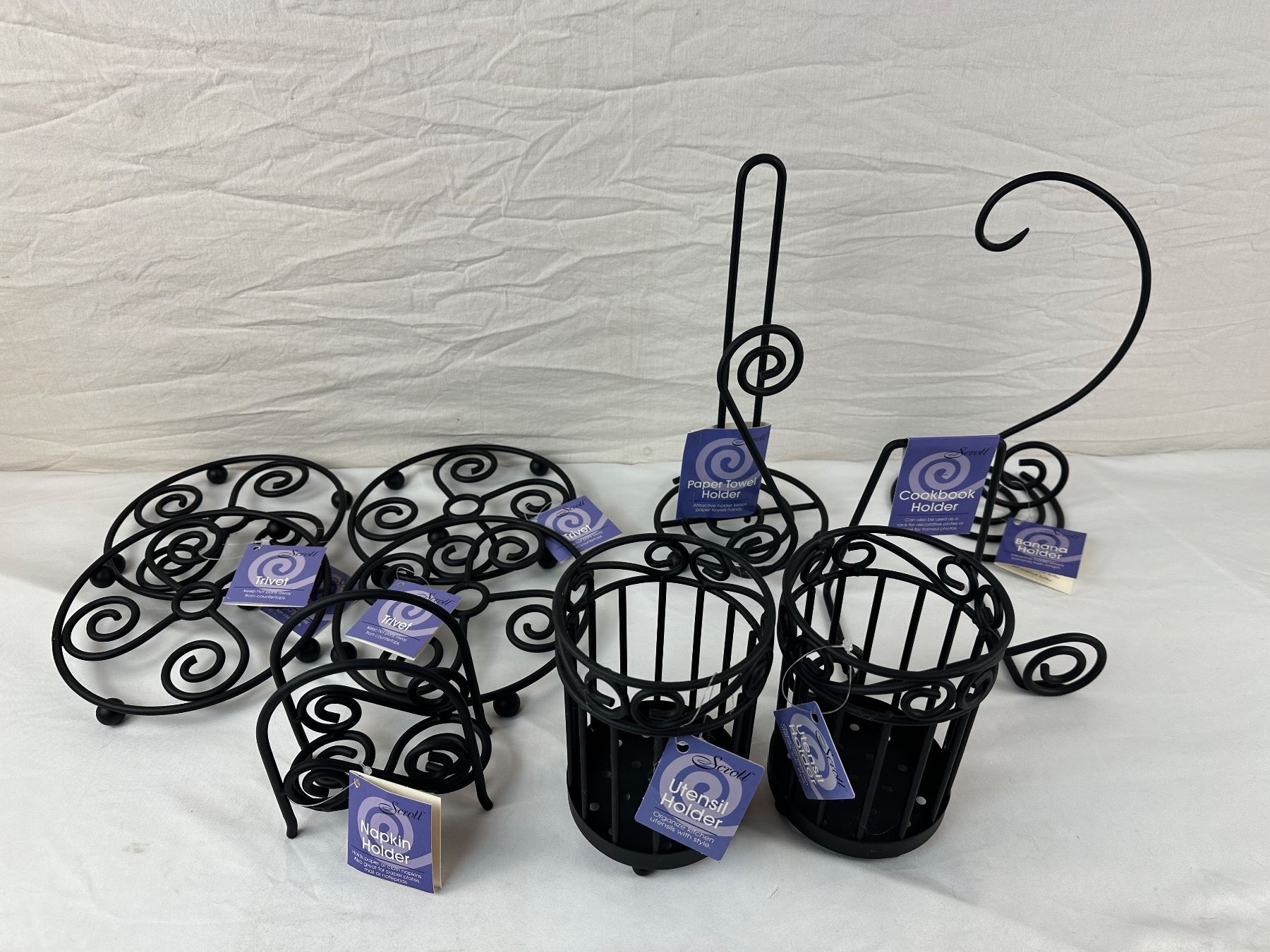 Includes 4 trivets, napkin holder, 2 utensil holders, banana holder, paper towel holder & cookbook holder