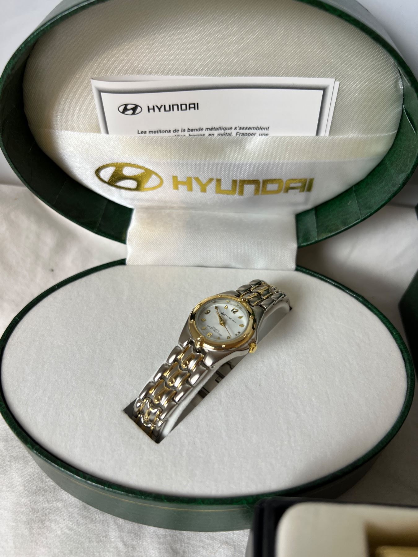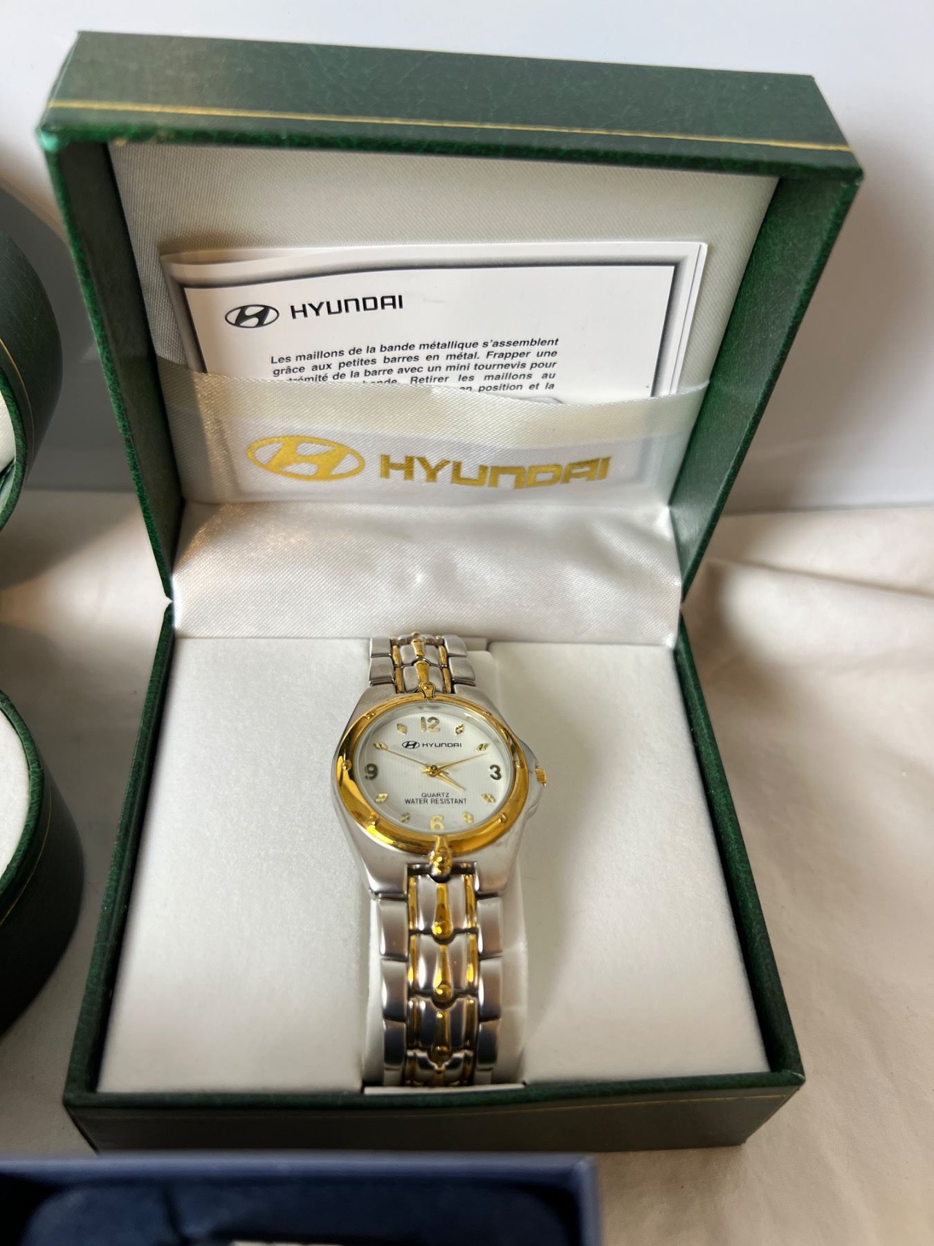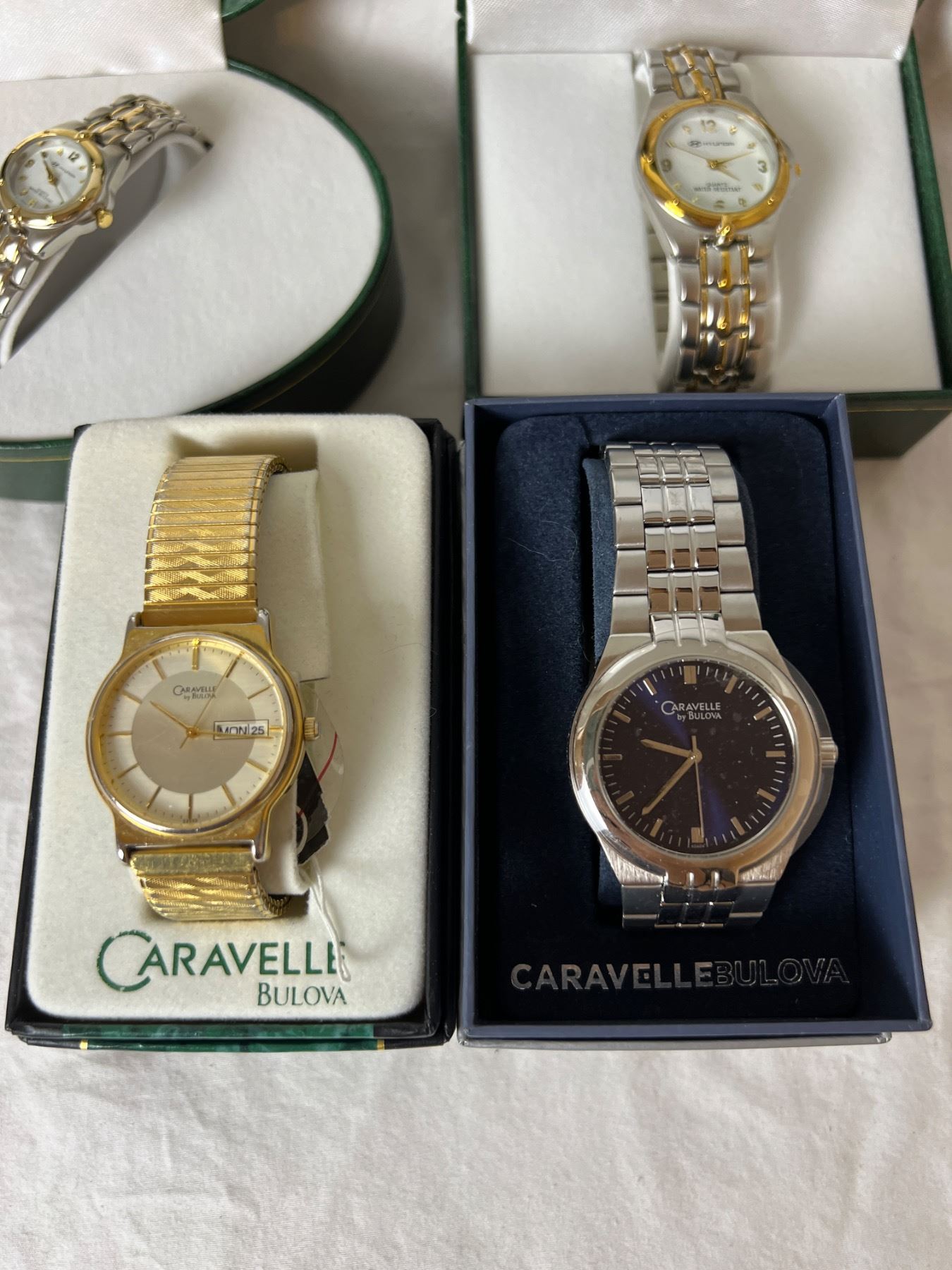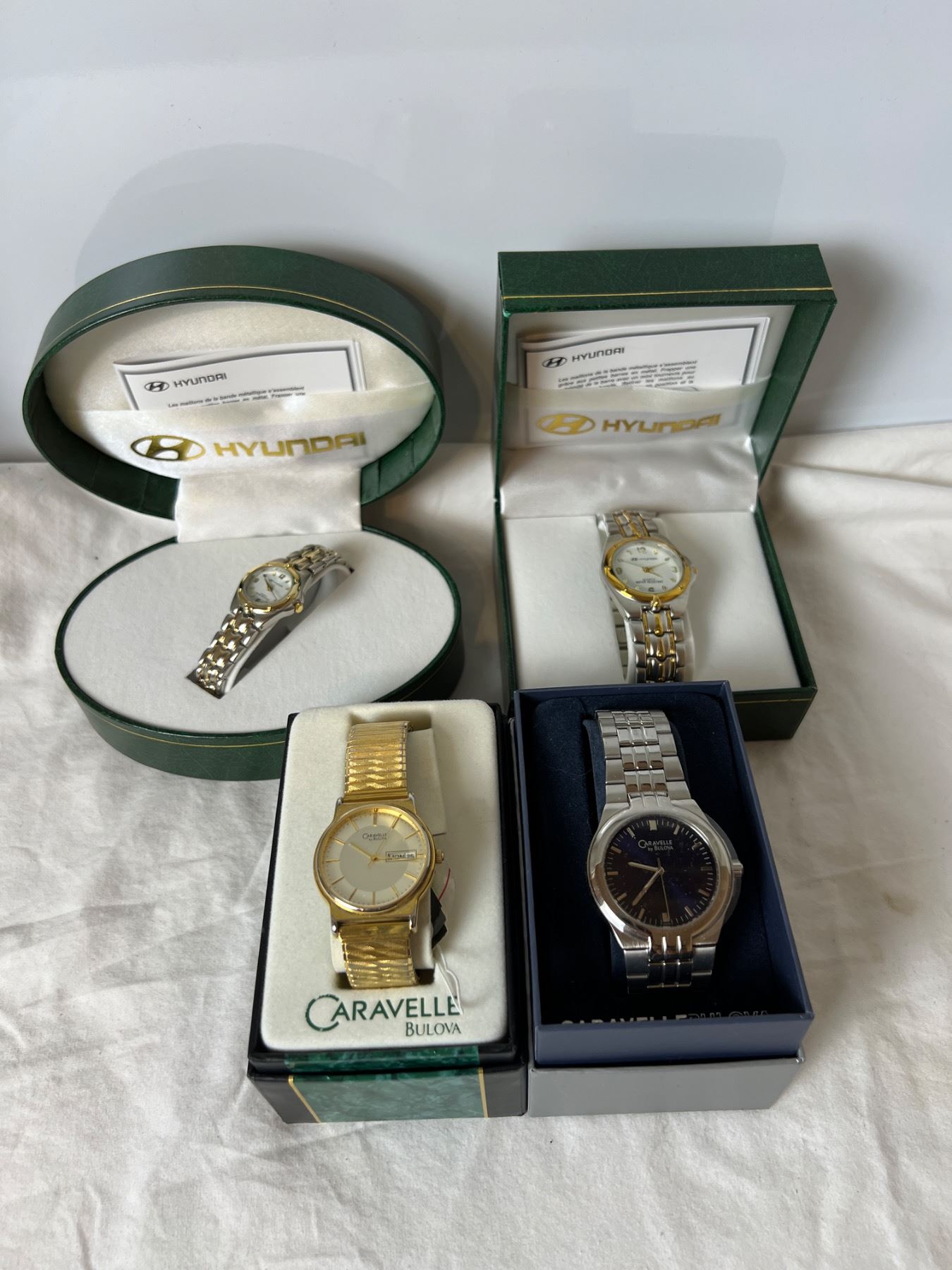 Includes two watches made by Caravelle a subsidiary of Bulova, and two Hyundai watches. All in good condition but need new batteries.
