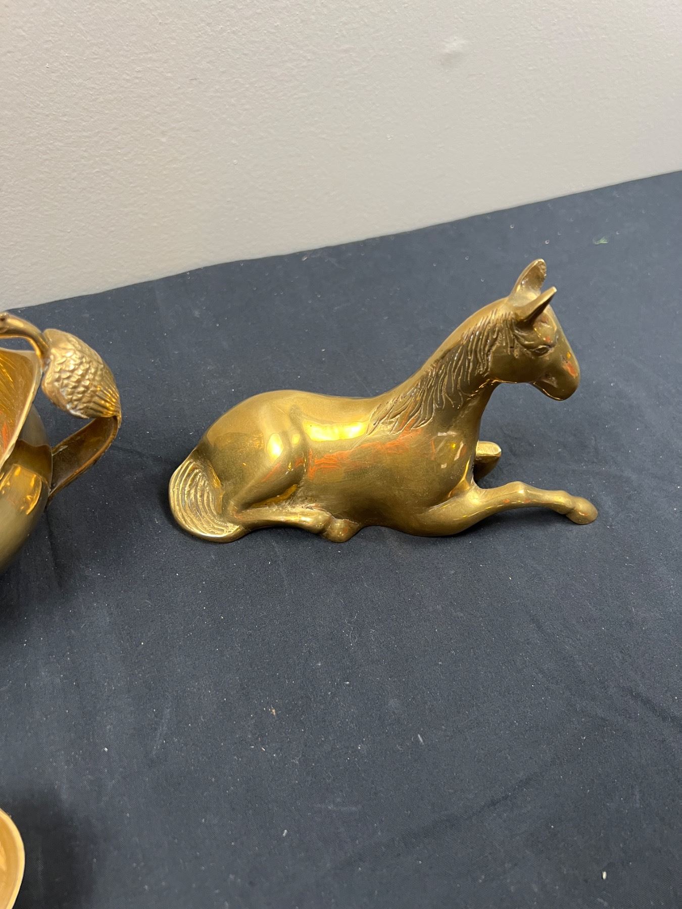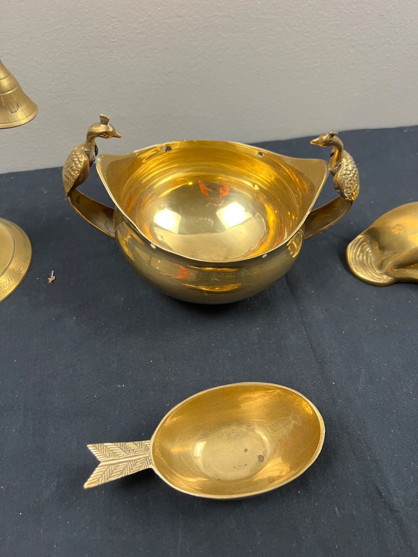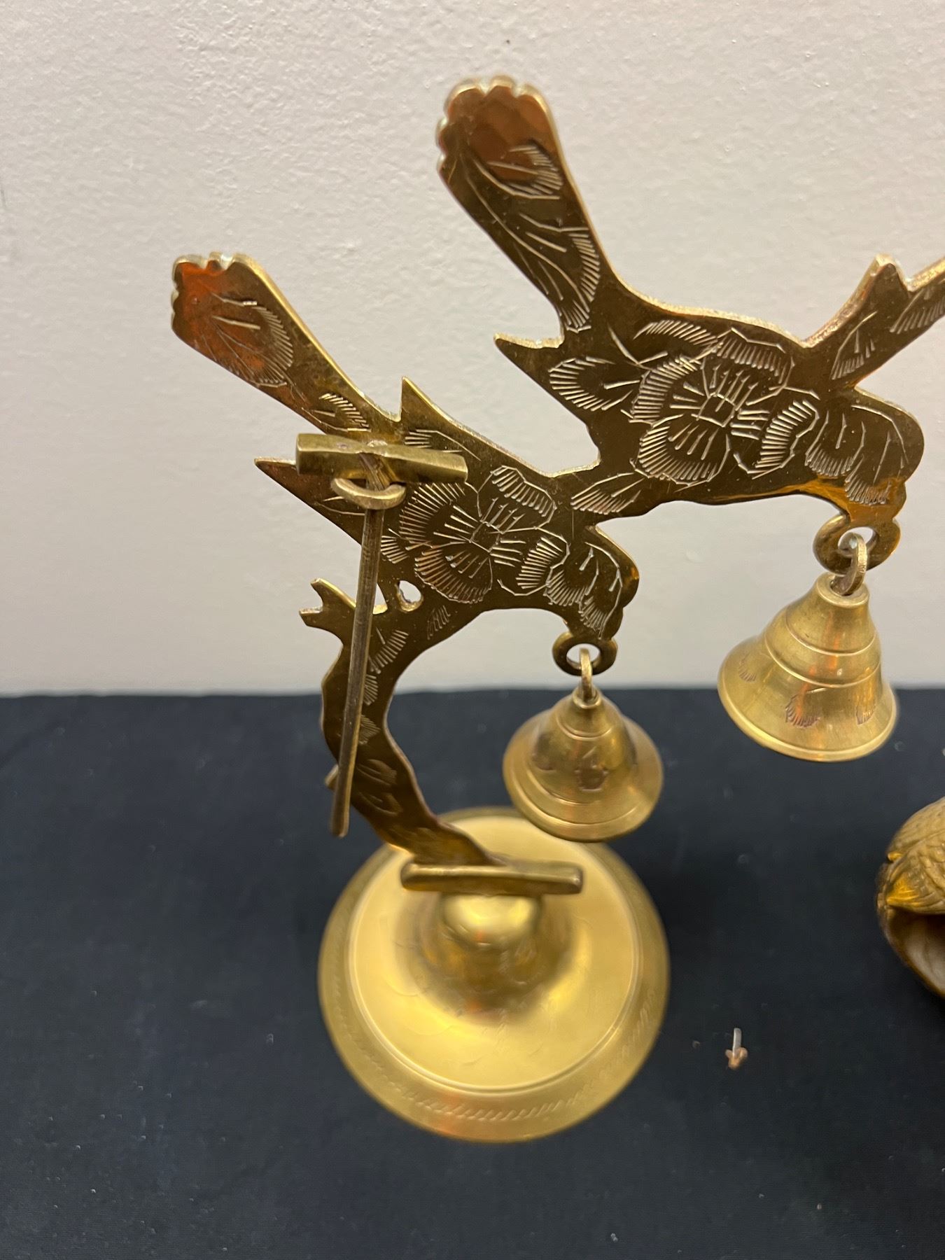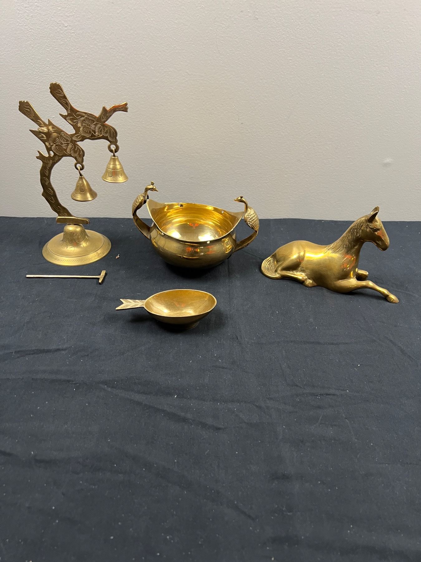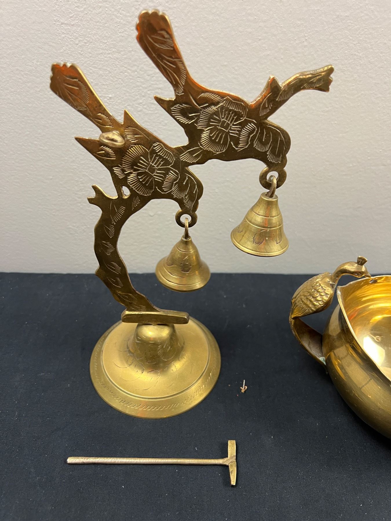 The peacock bowl appears to be missing handles, The large bells are 5"L x 9"H