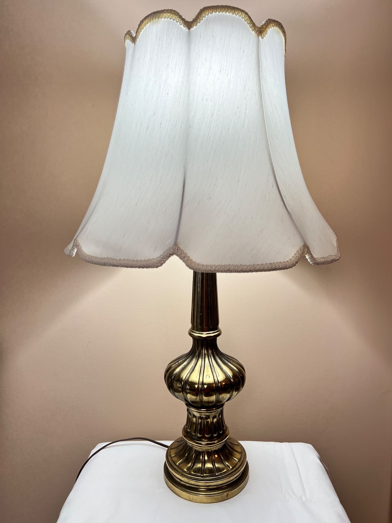 Lamp is in working condition, heavy brass base aesthetic, stands 30.5 inches tall. Shade is ripped on the inside.