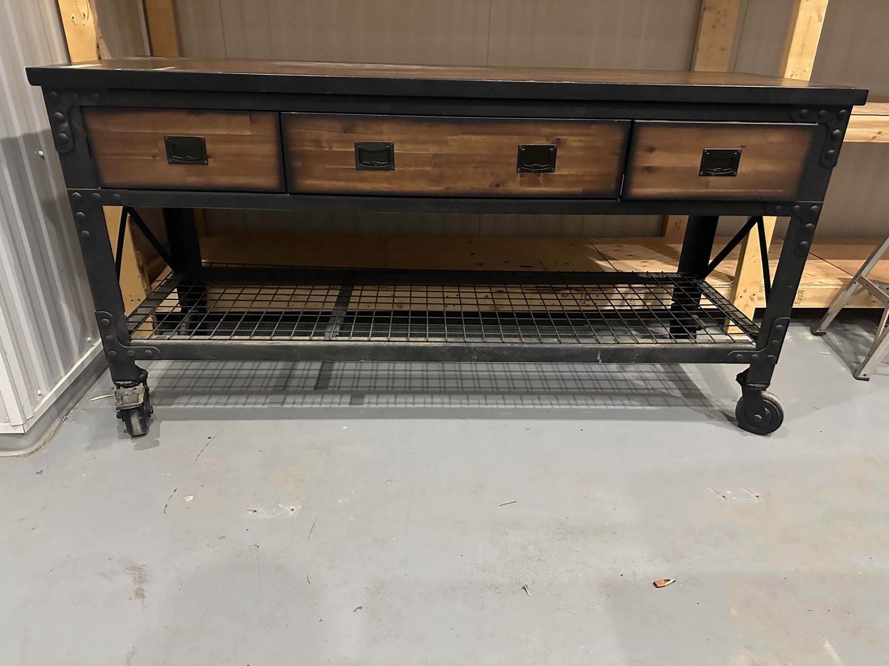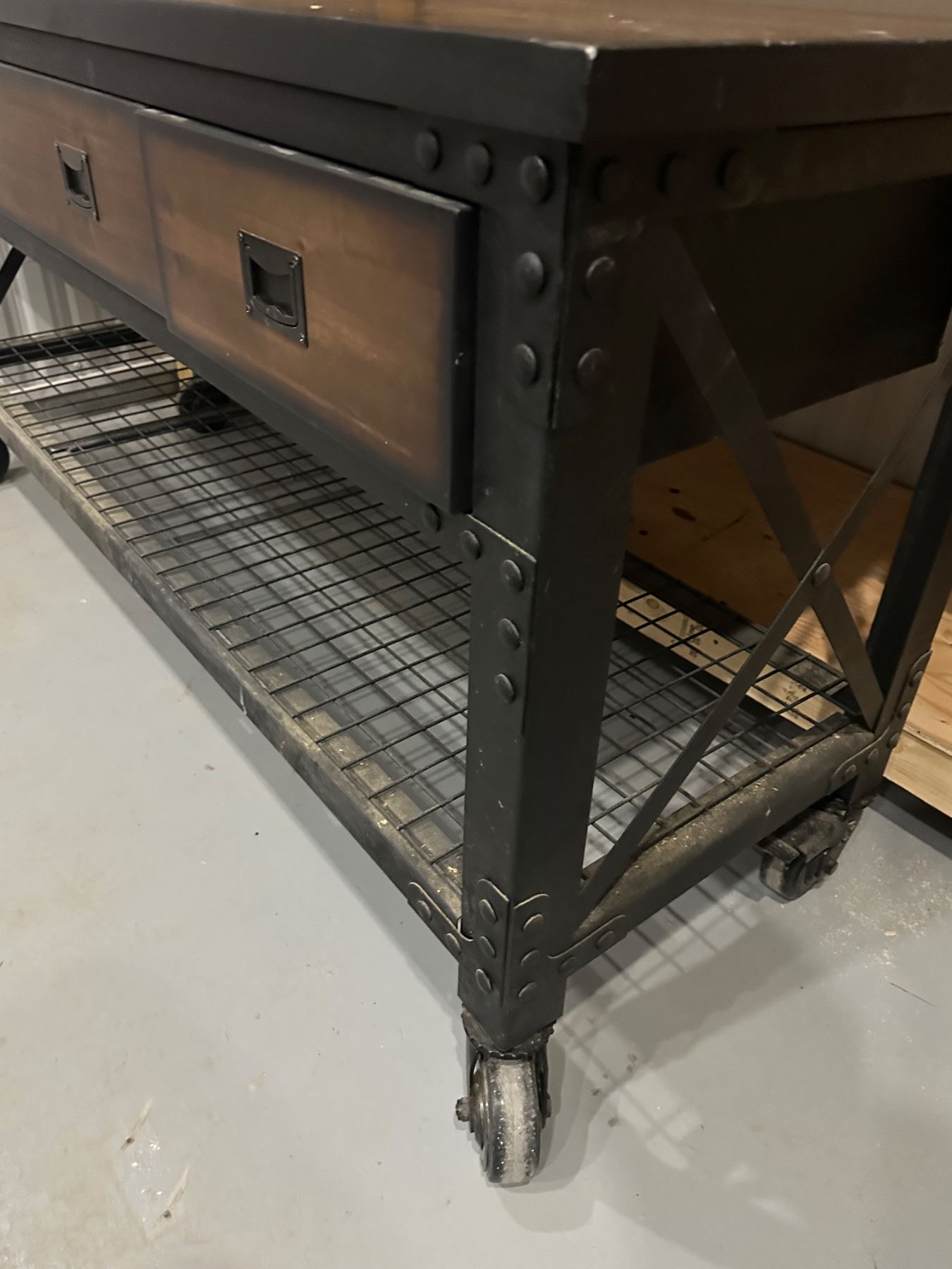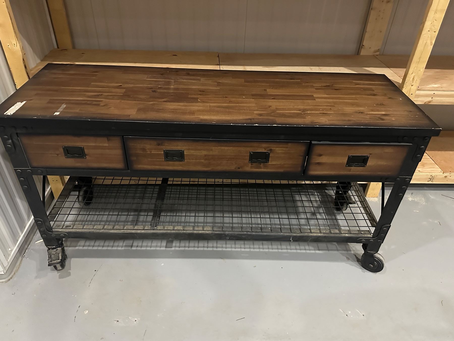 With locking wheels - has dings and scratches - masking tape marks that can be removed - 6' long x 2' deep x 36.5" tall