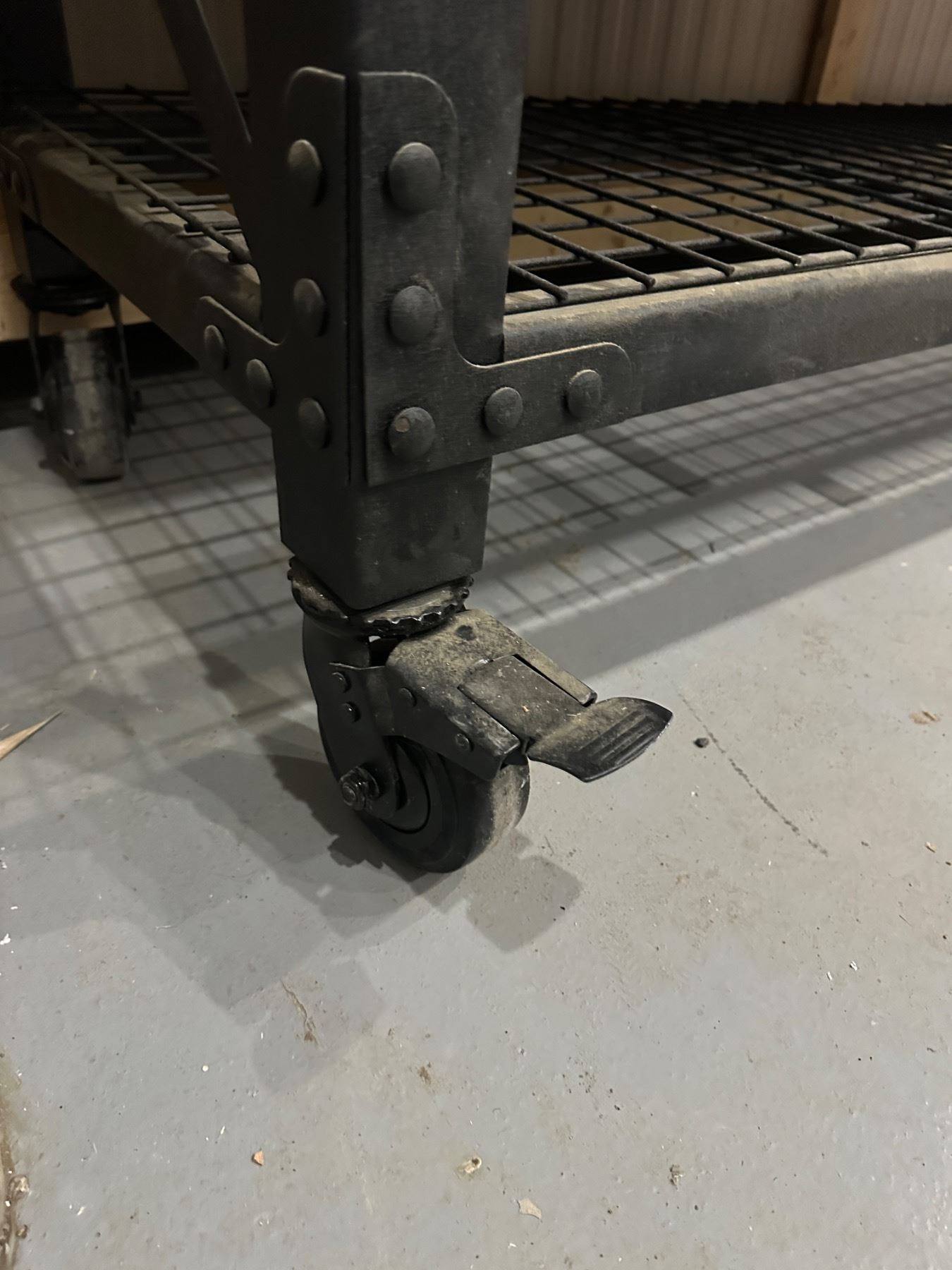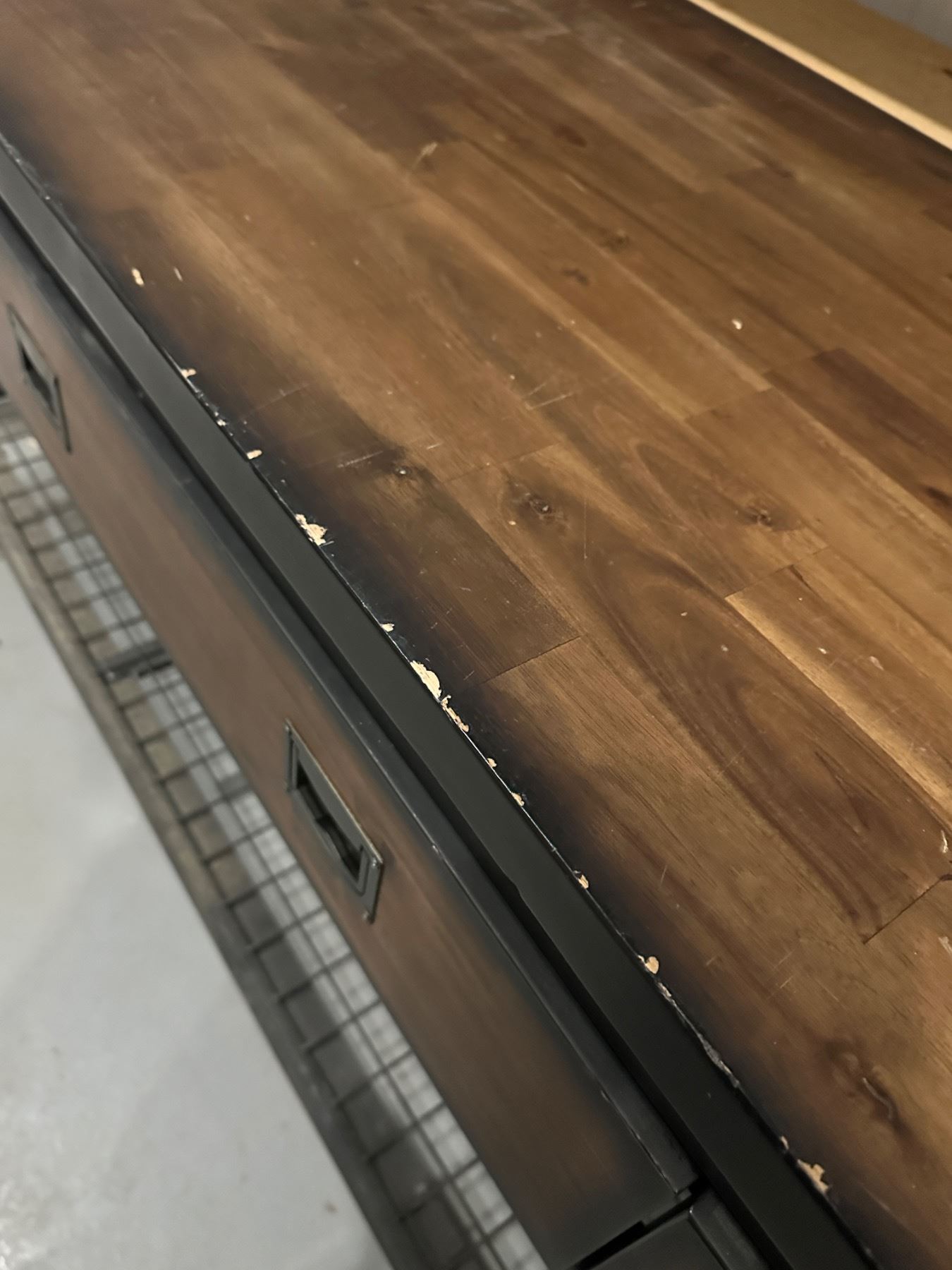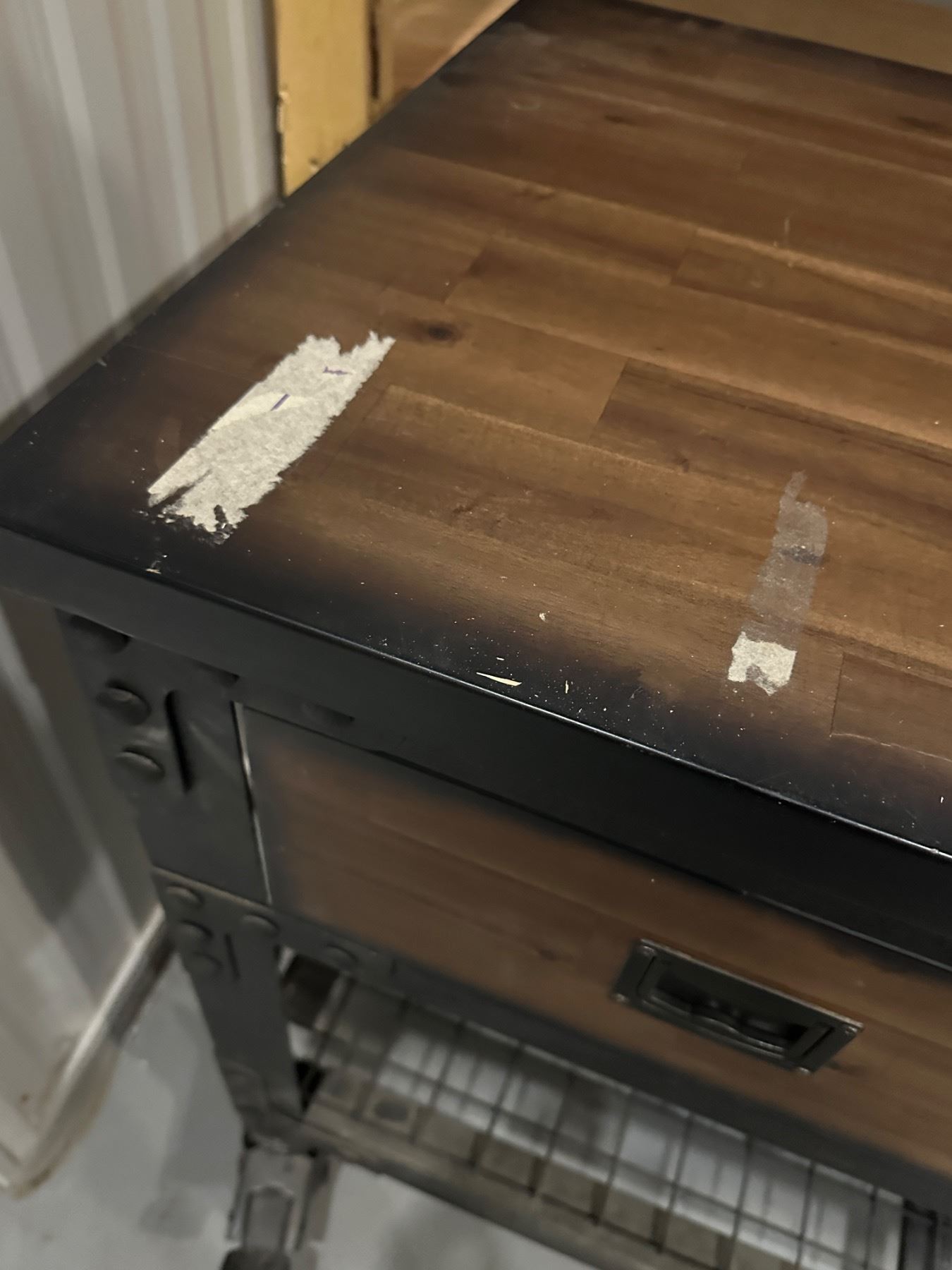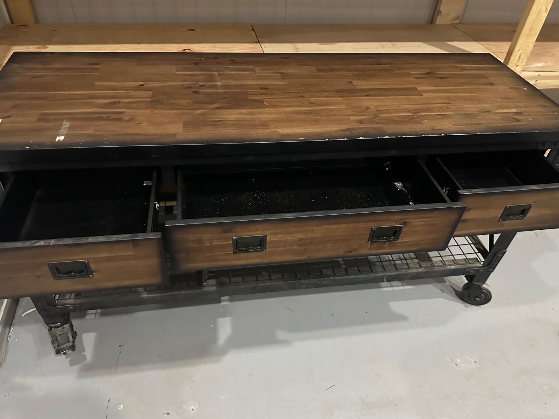 With locking wheels - has dings and scratches - masking tape marks that can be removed - 6' long x 2' deep x 36.5" tall