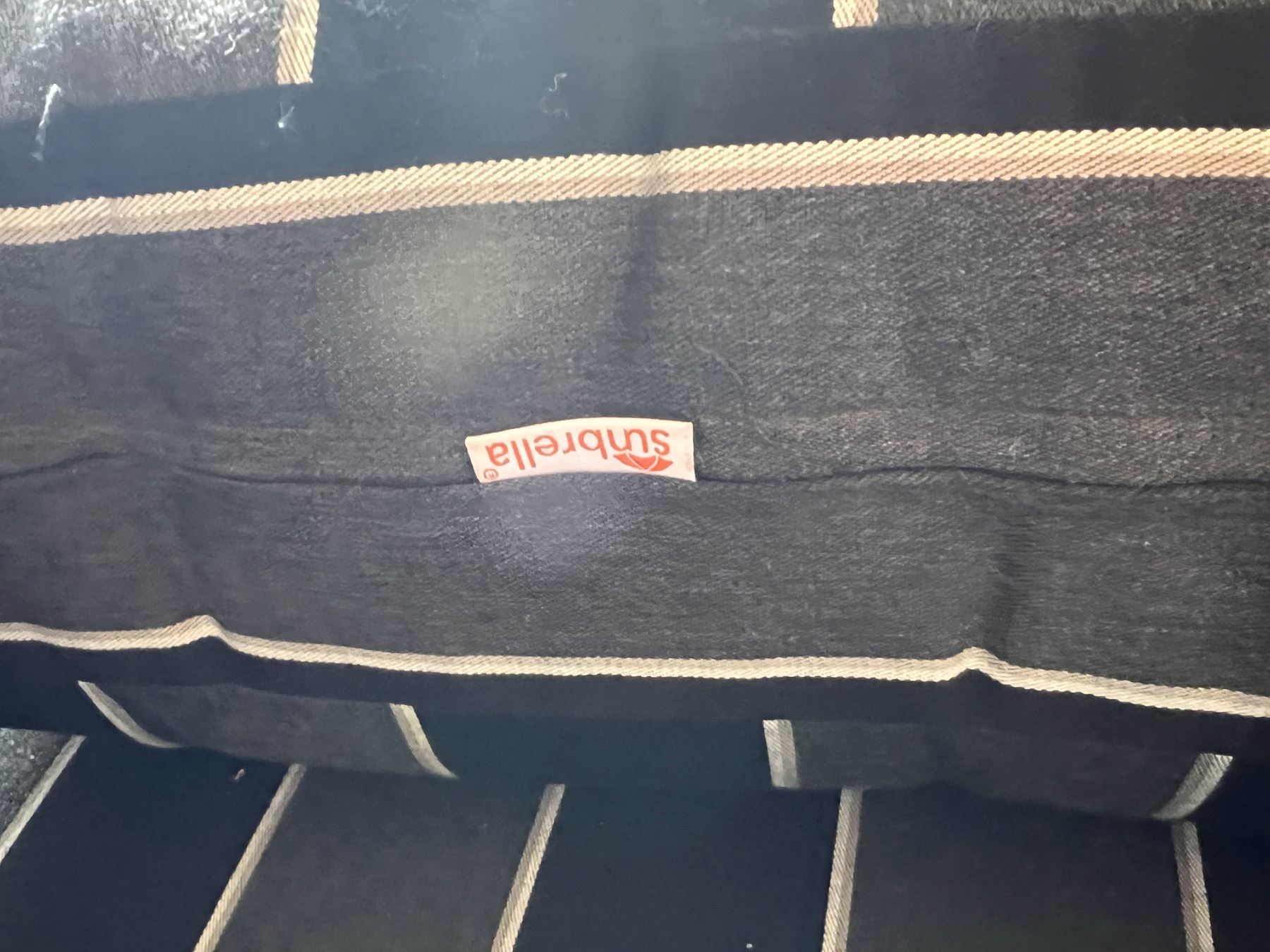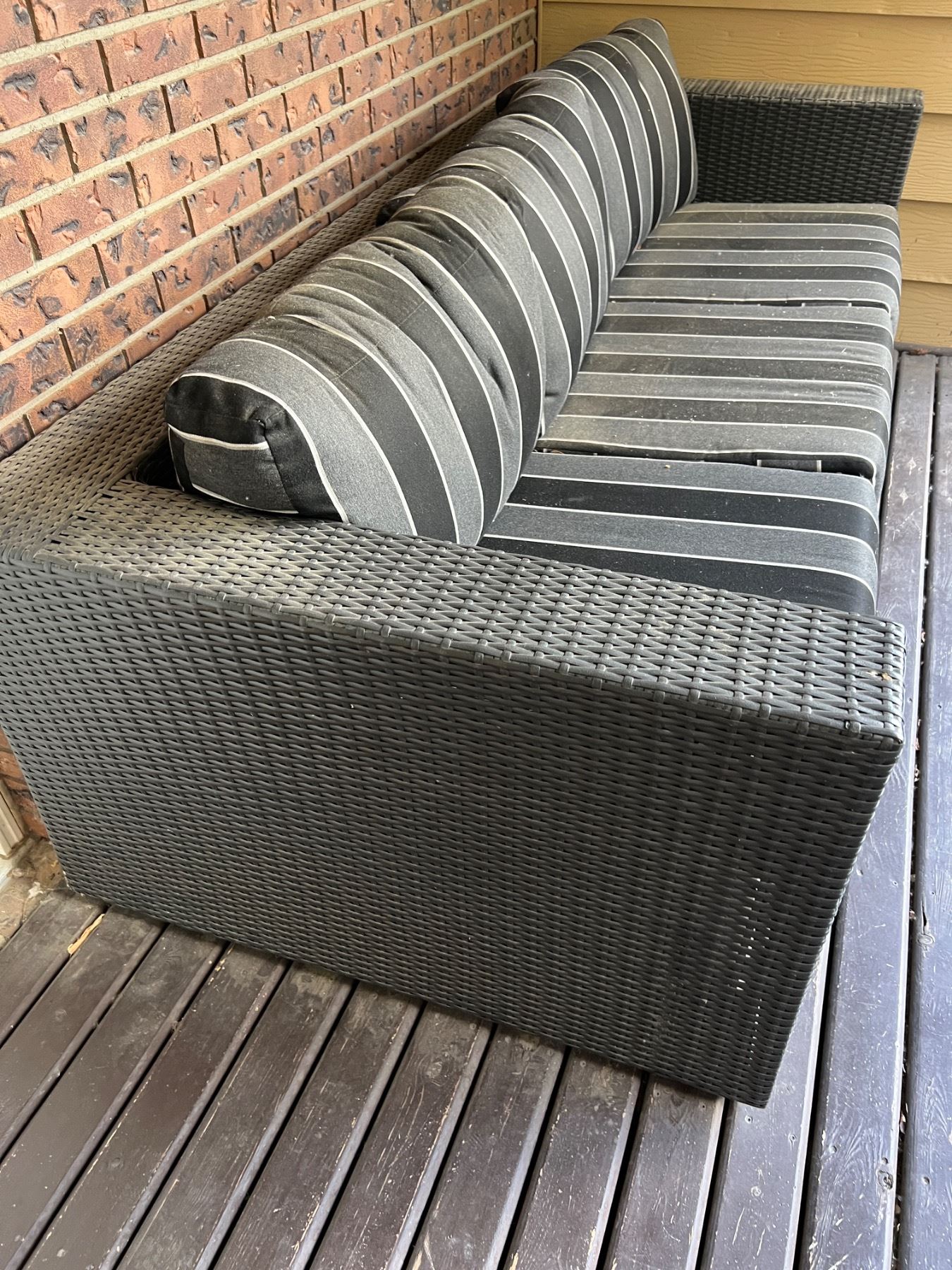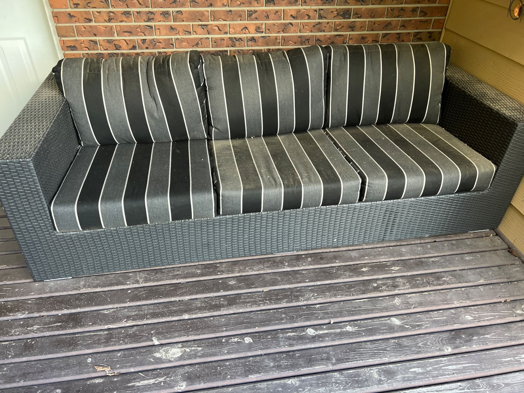 Cushions are Sunbrella branded. Stained from being outside for a long time. Measures 89"W x 39"D x 26"H