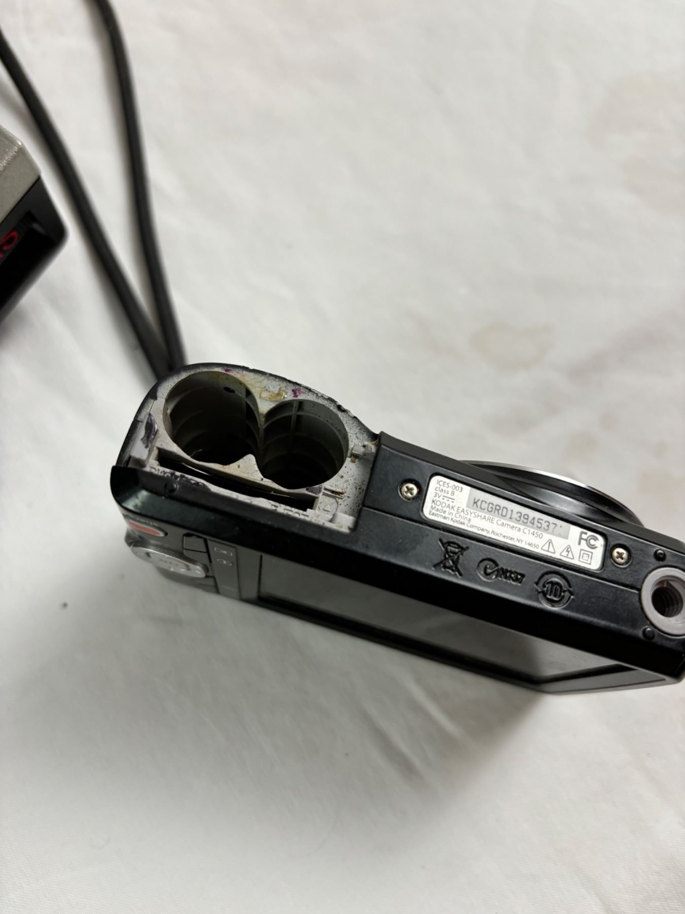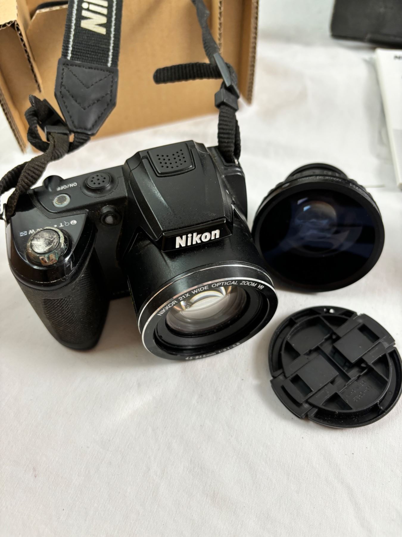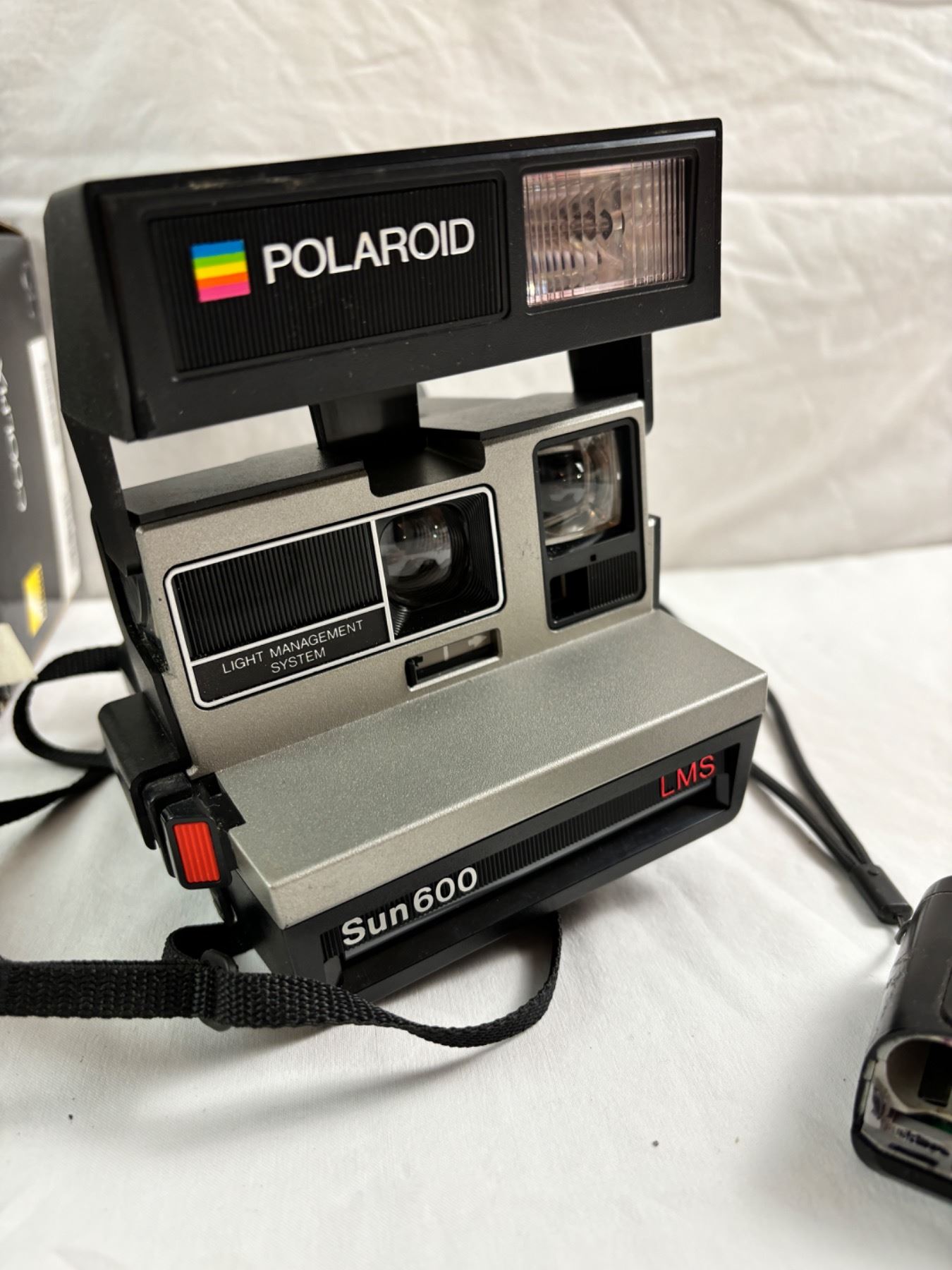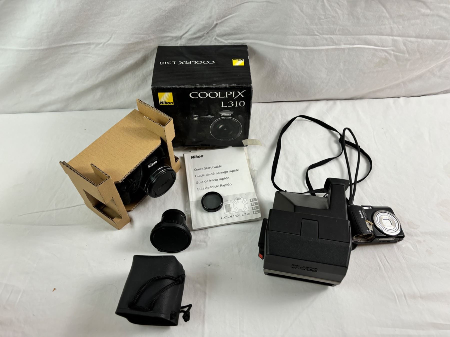 includes Nikon Coolpix L310 camera, Opted V-37 UV lens, kodak (missing battery cover) and Polaroid Sun 600.
