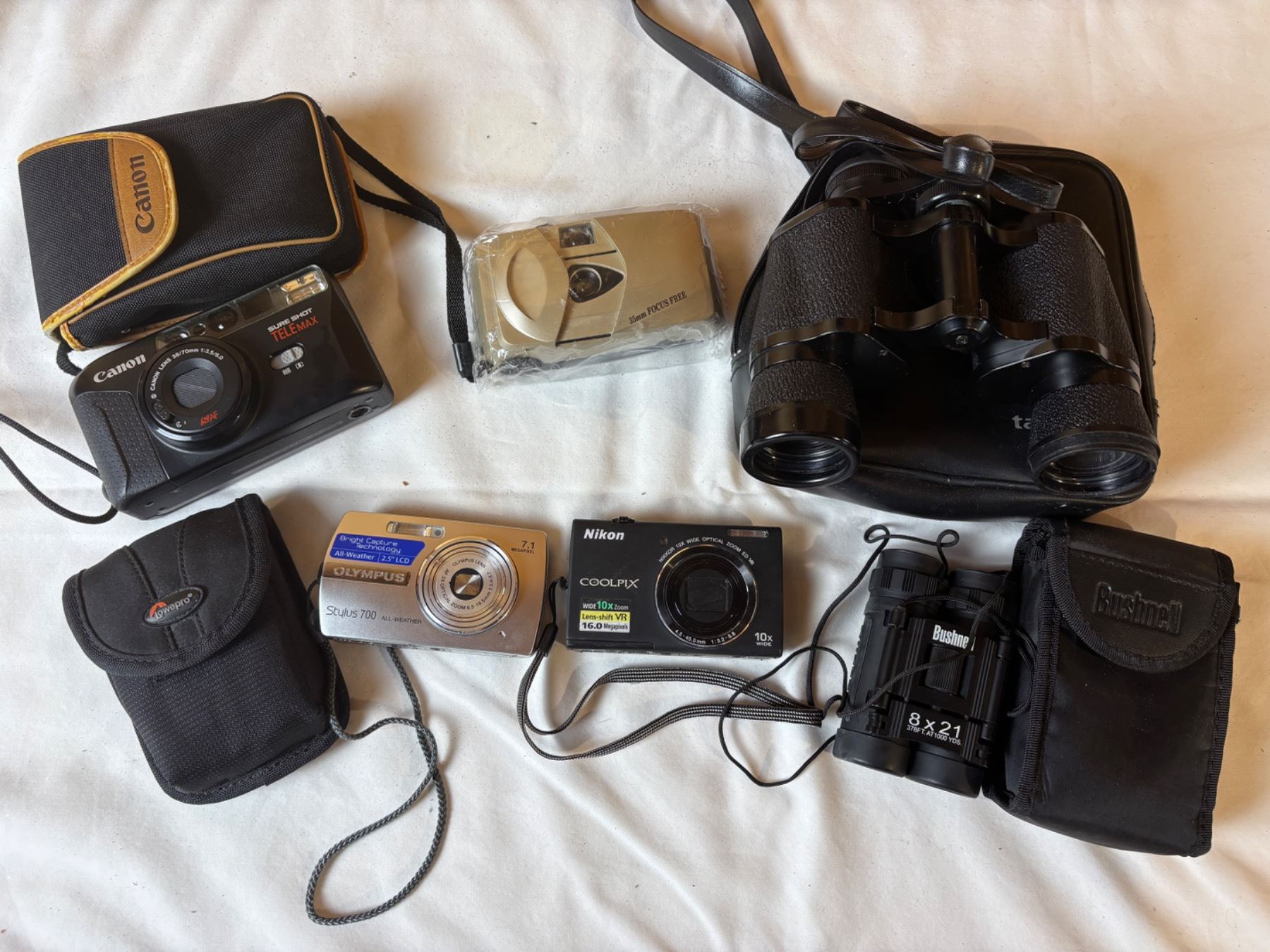 Includes, Nikon CoolPix, Bushnell 8x21, Canon Sure Shot TeleMax, and more, Not tested