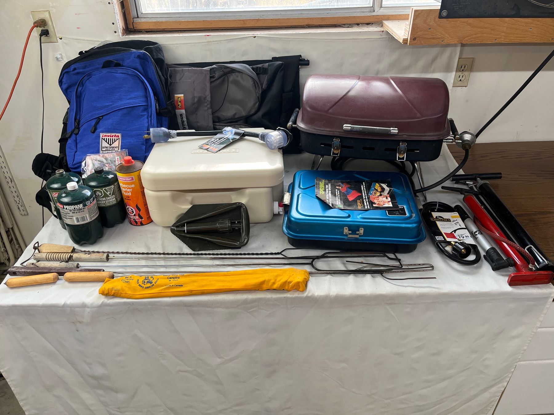 Includes 2 new hiing bahs, propane stoves, propane & starter fluid, wash n'go station etc…
