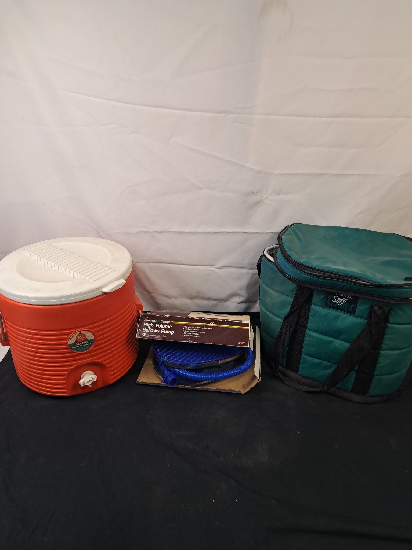 Includes Rubbermaid cooler on wheels (27"L x 16"W x 18"H), Tarpaulin (8x10), 2 folding chairs, North Face hiking backpack, etc.