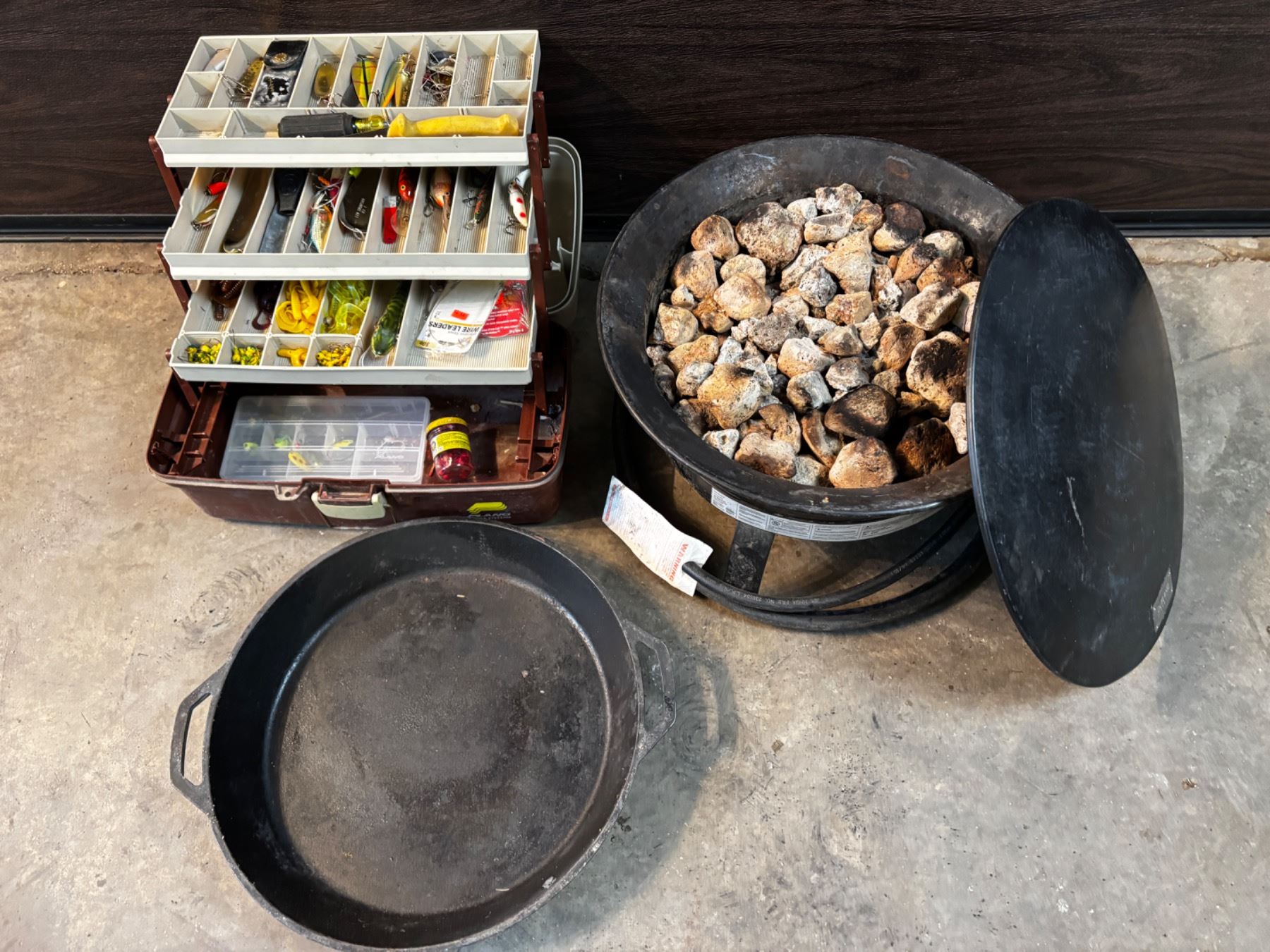 Includes, Outland propane firebowl (19.5"diameter x 10"H), 17" cast iron pan, tackle box with content