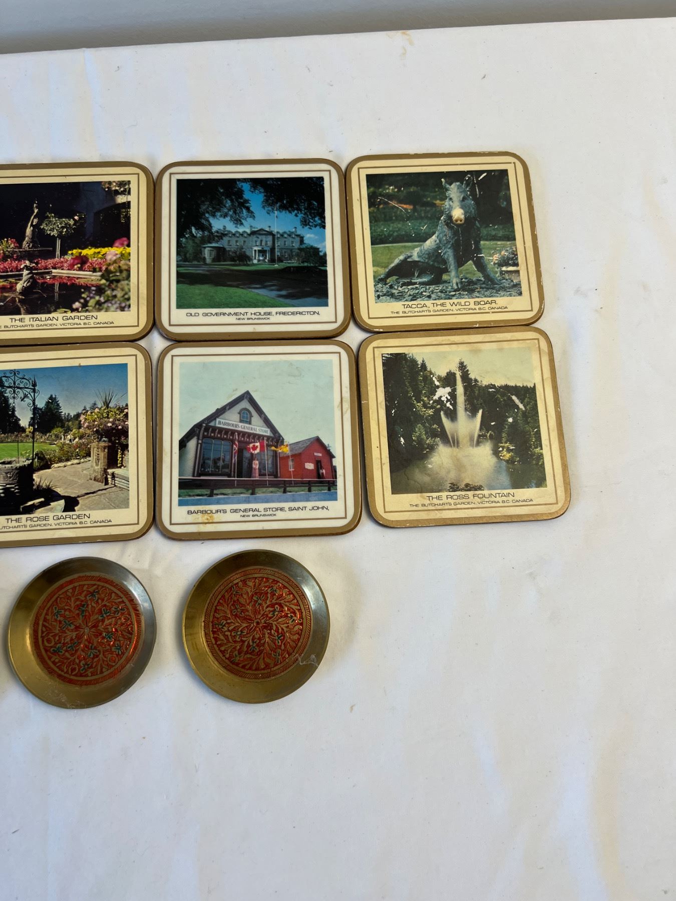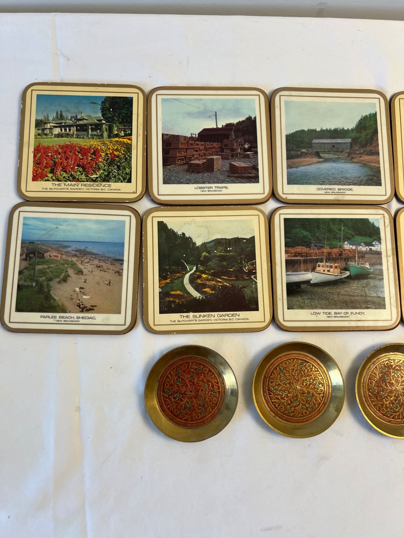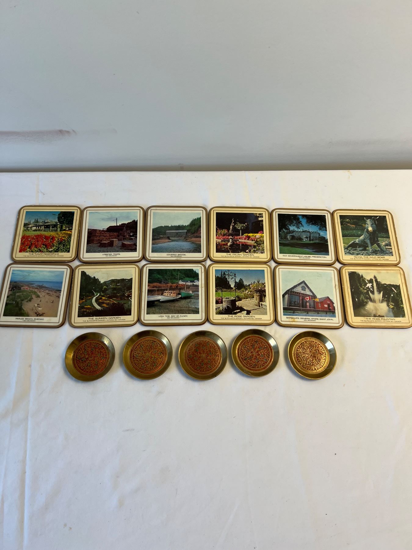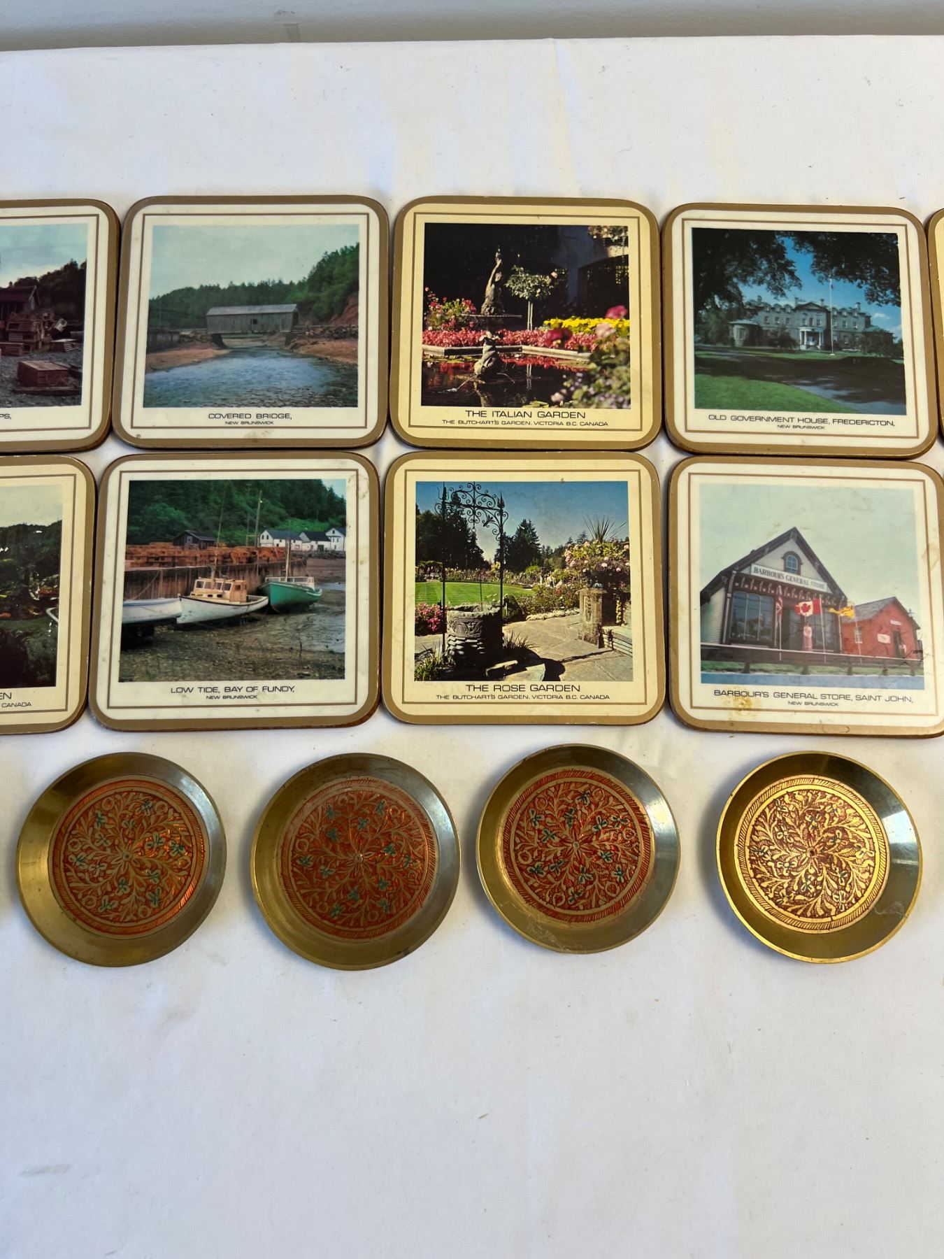 Features 12 Canadian themed coasters as well as 4 ornate brass coasters.