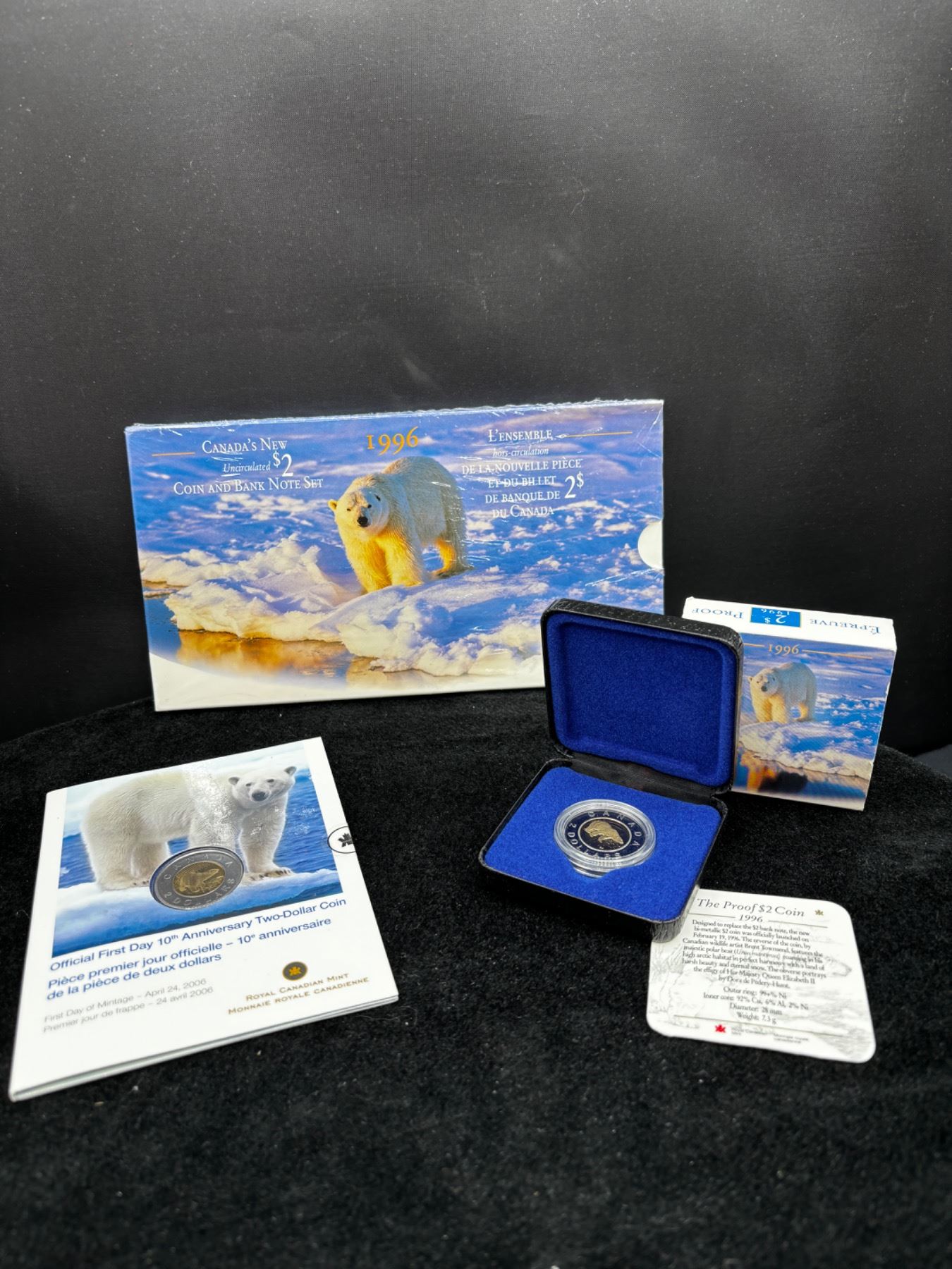 Includes, Unopened 1996 2$ Uncirculated Coin and Bank Note Set, 1996 2$ Proof Coin, Unopened 2006 Official First Day 10th Anniversary Two-Dollar Coin