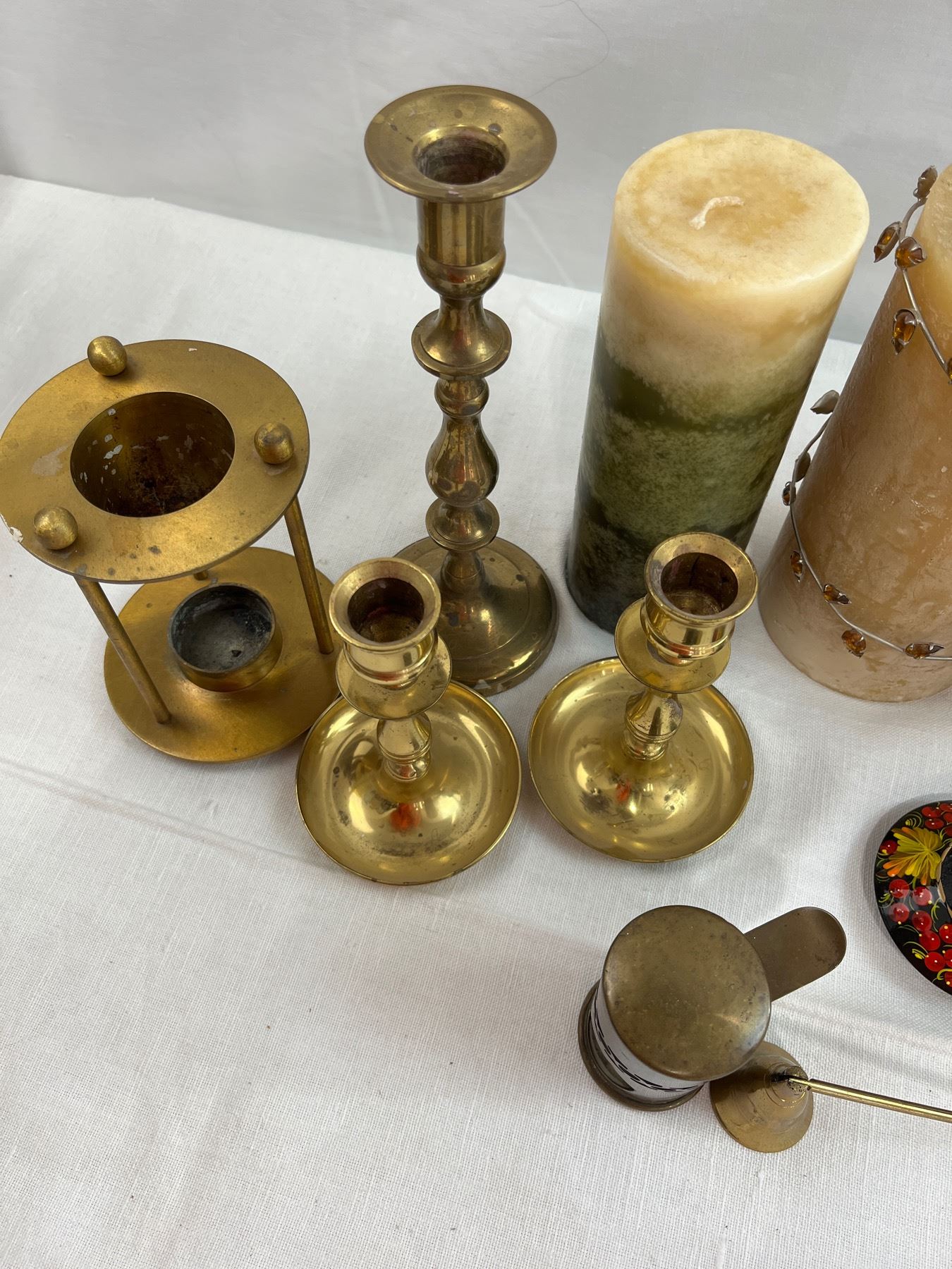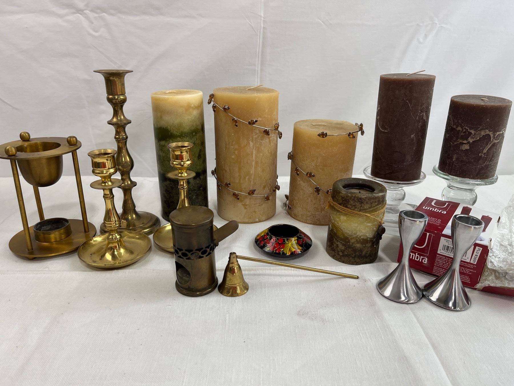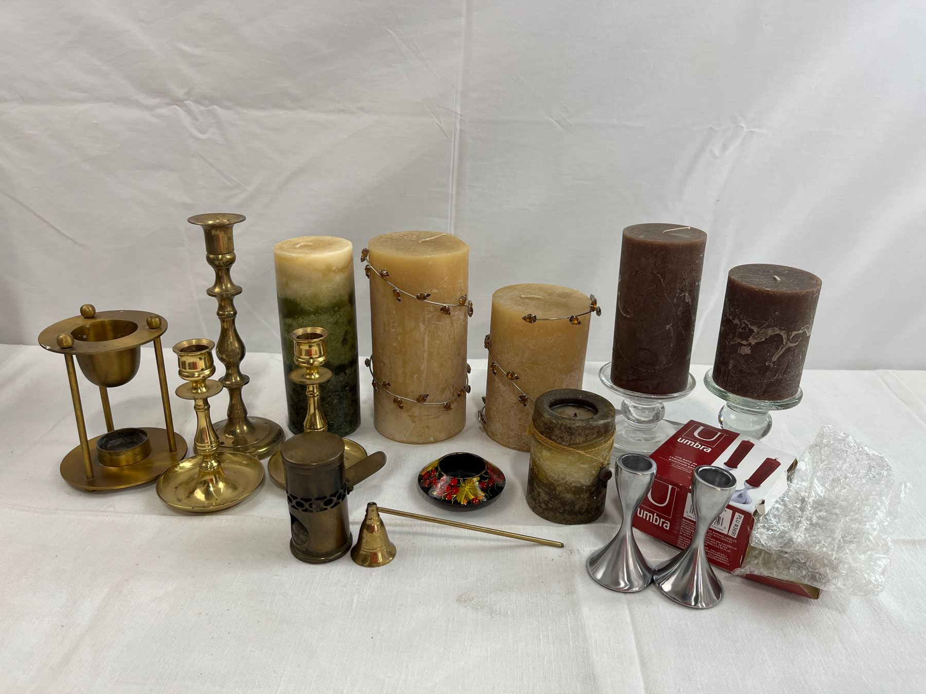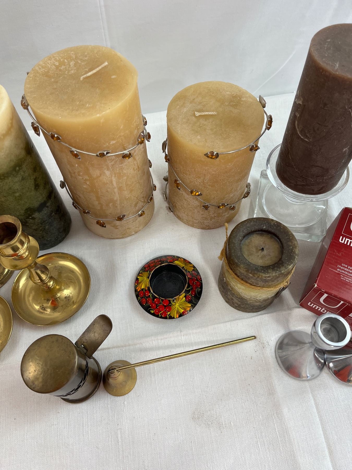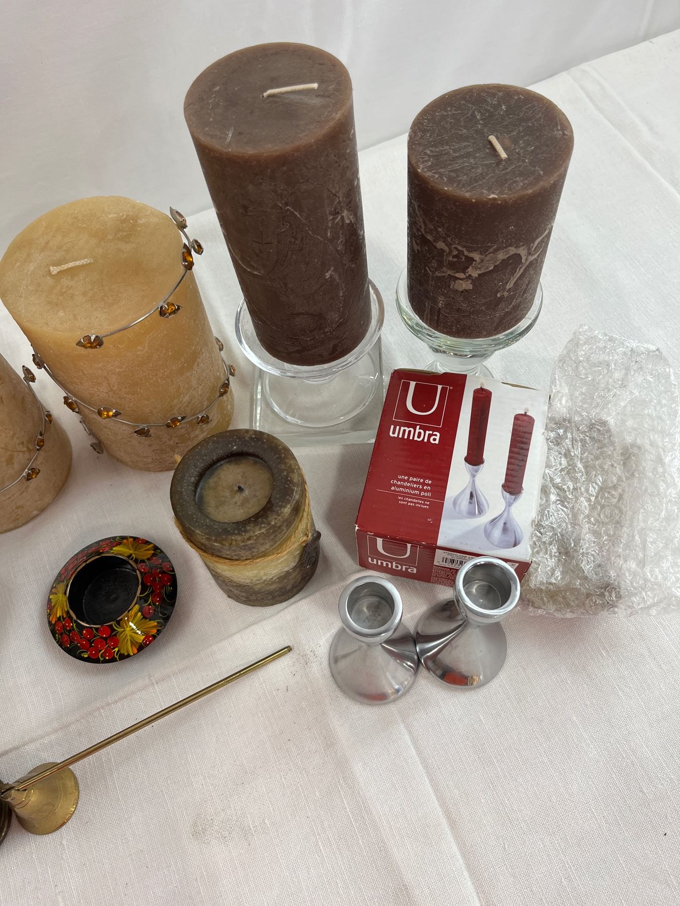 Assorted candles and candle holders with candle snuffer 18 pcs total