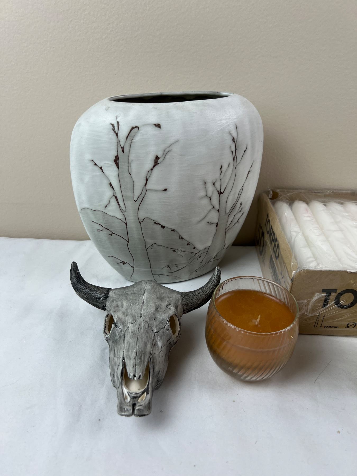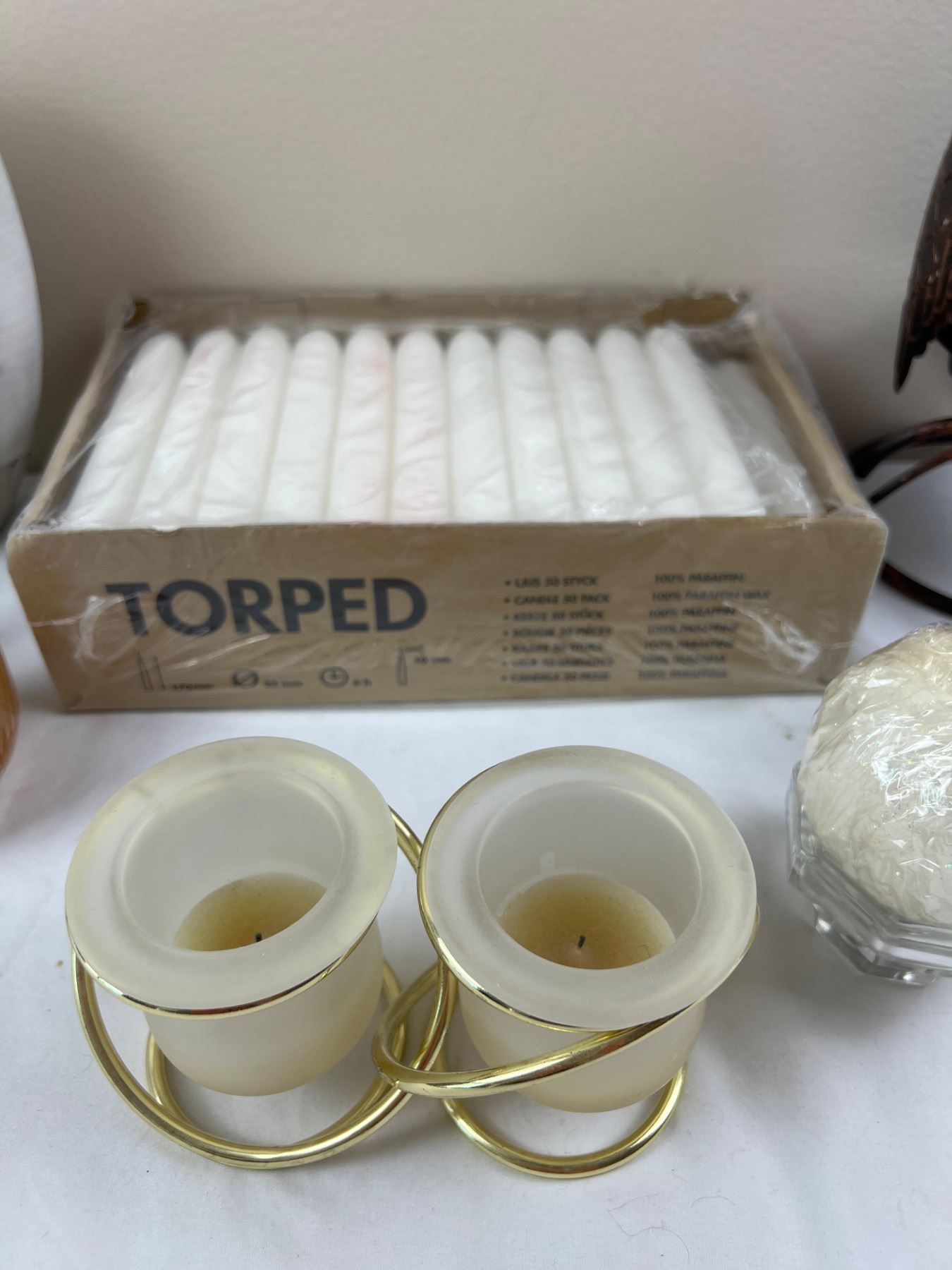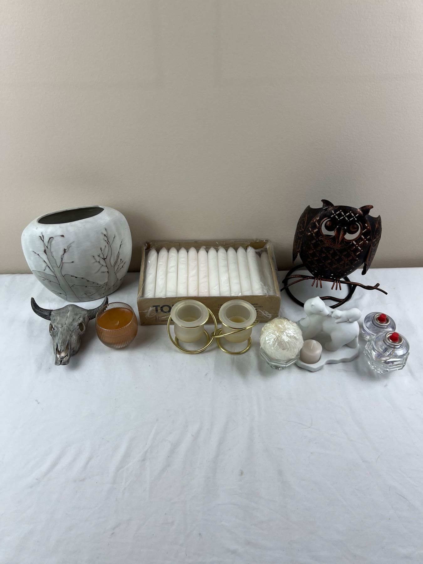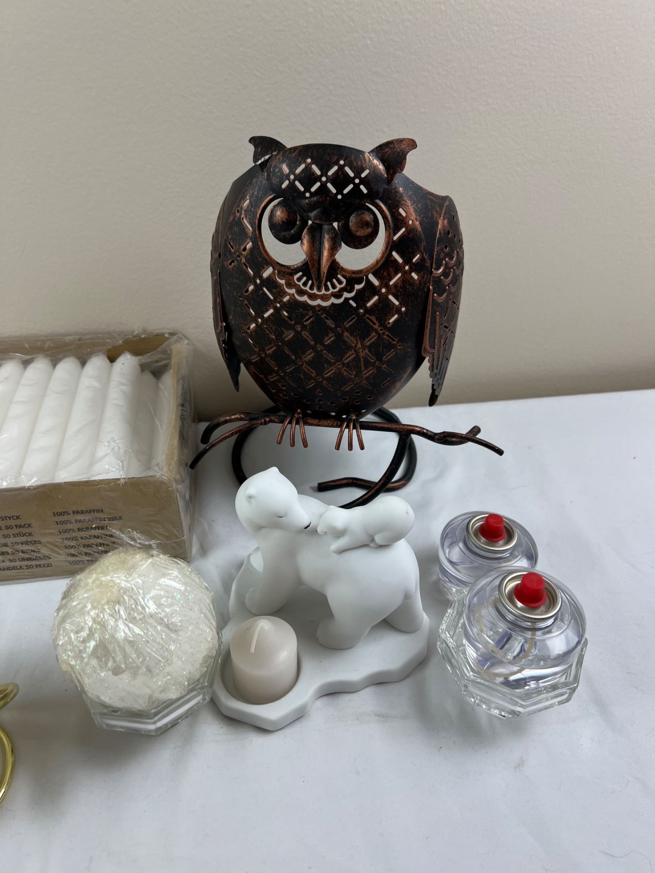 Includes an open box candlesticks, Metal owl candleholder, and more